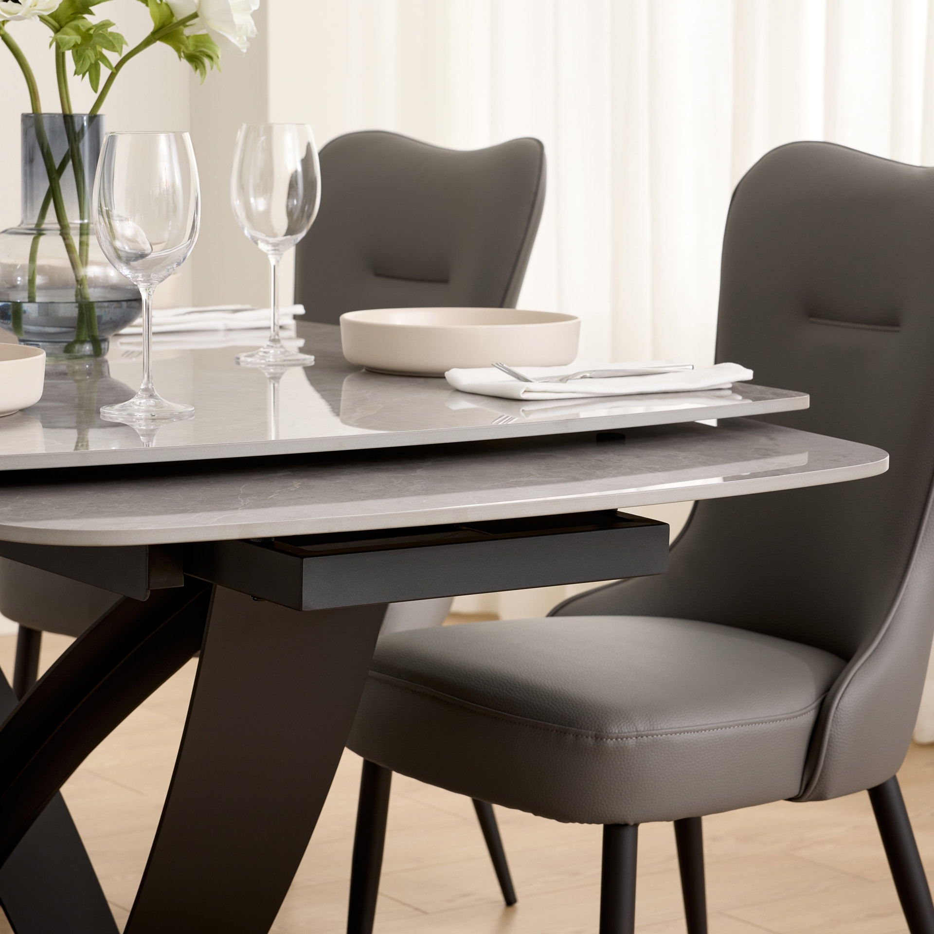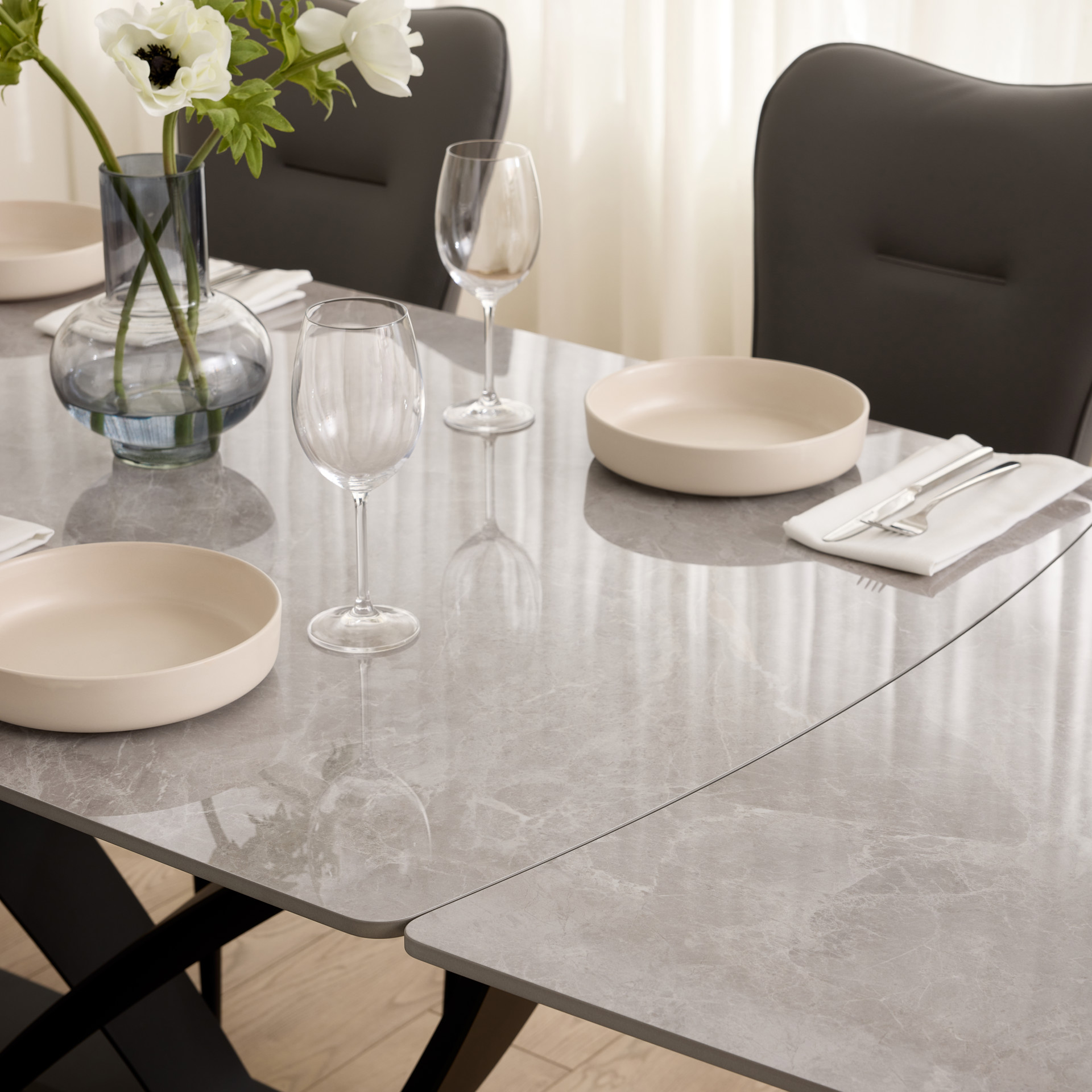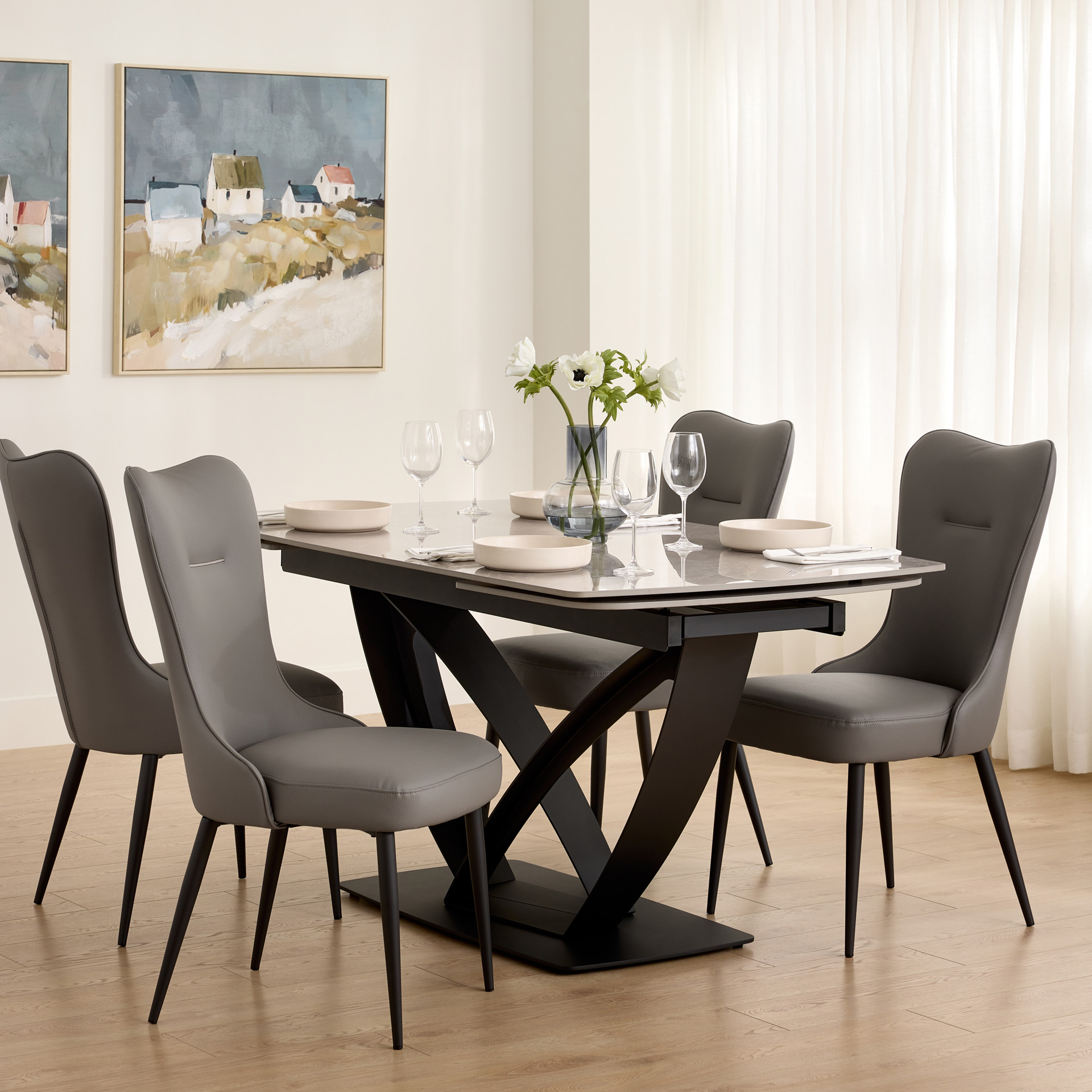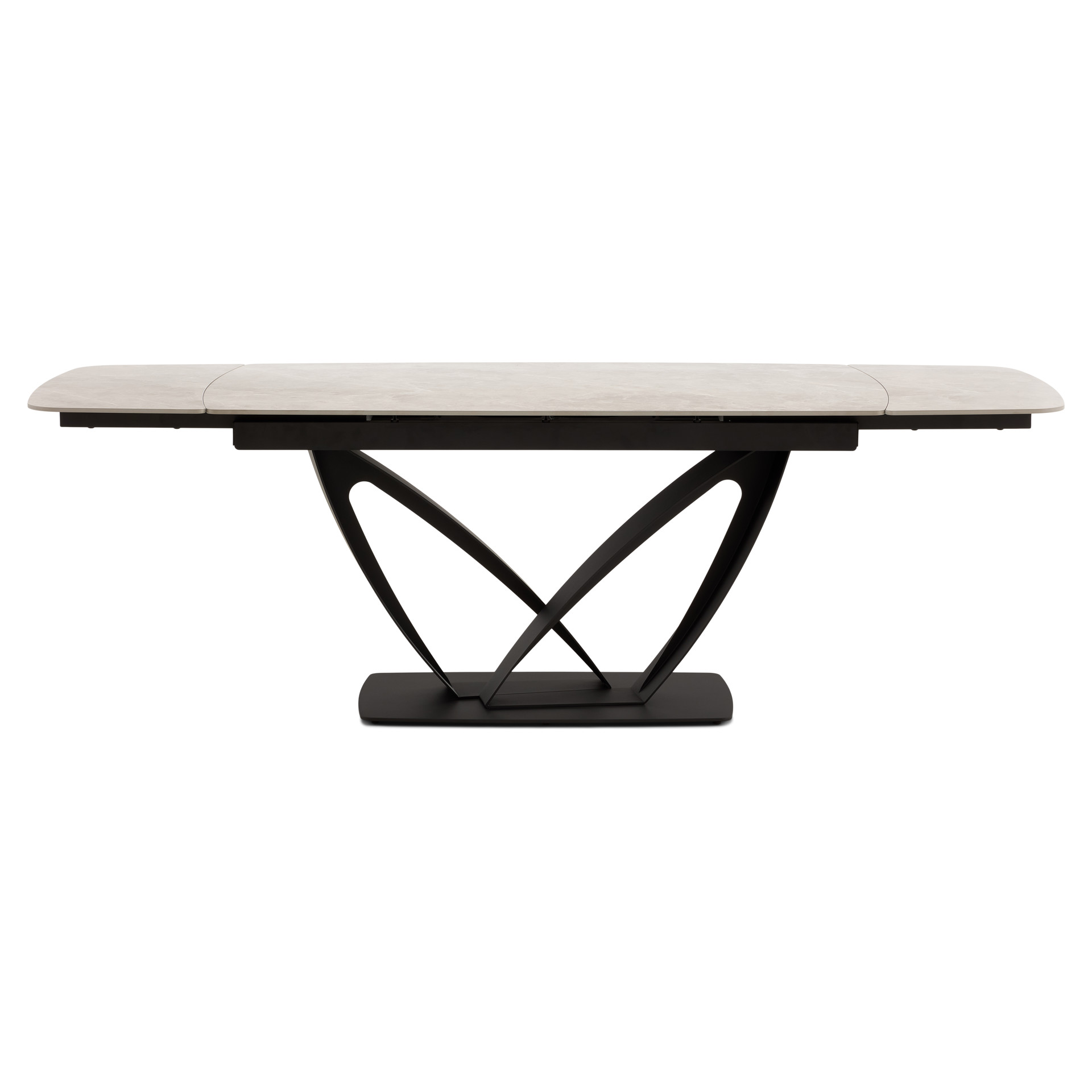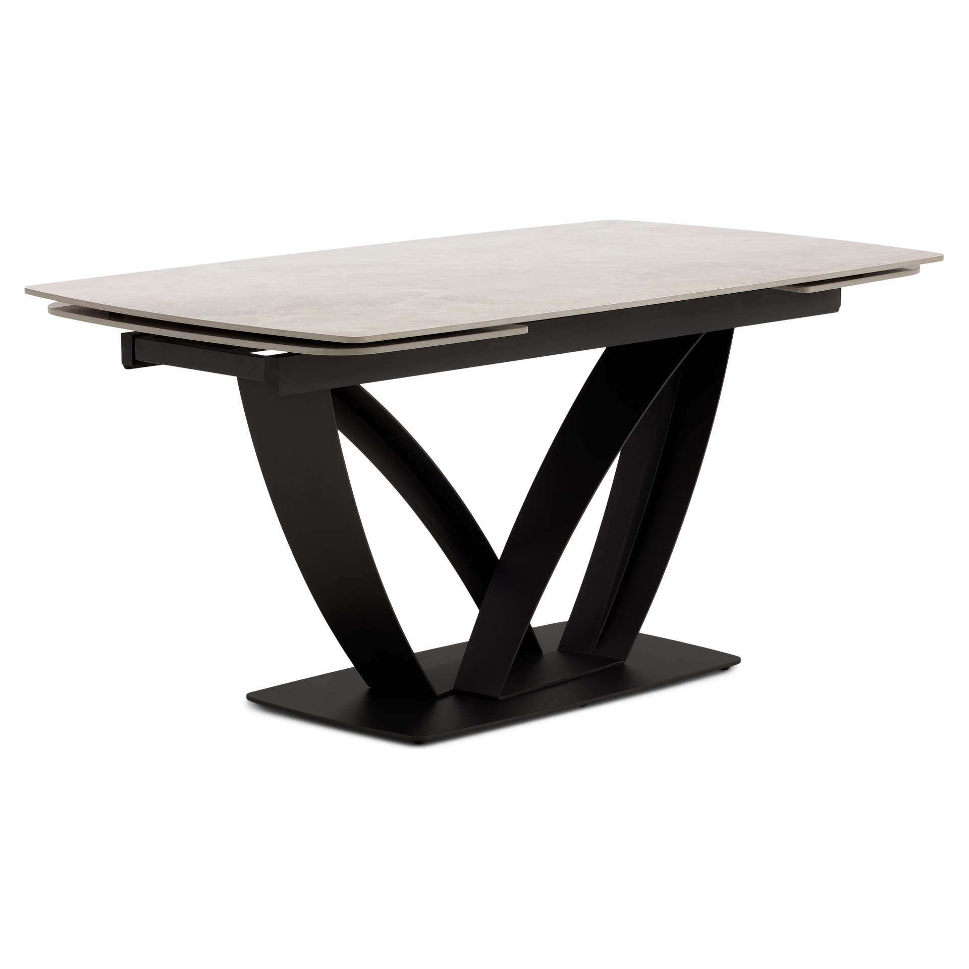 Table à manger extensible de la collection Tammy avec plateau en céramique laquée au fini marbre gris, offrant une surface à la fois élégante et résistante. Dotée de deux rallonges intégrées, elle atteint une longueur maximale de 95 pouces. Sa base sculpturale en métal noir assure stabilité et caractère, s’intégrant parfaitement à un intérieur contemporain ou sophistiqué.