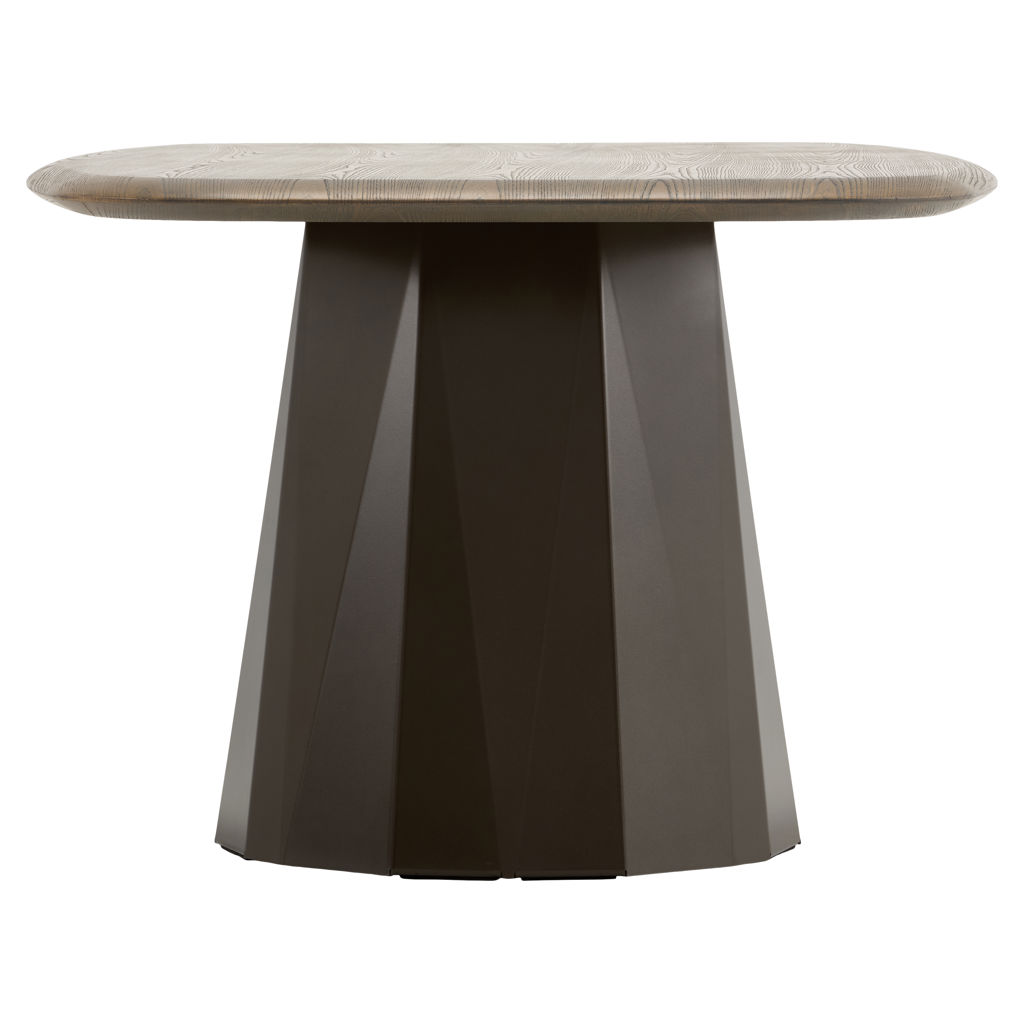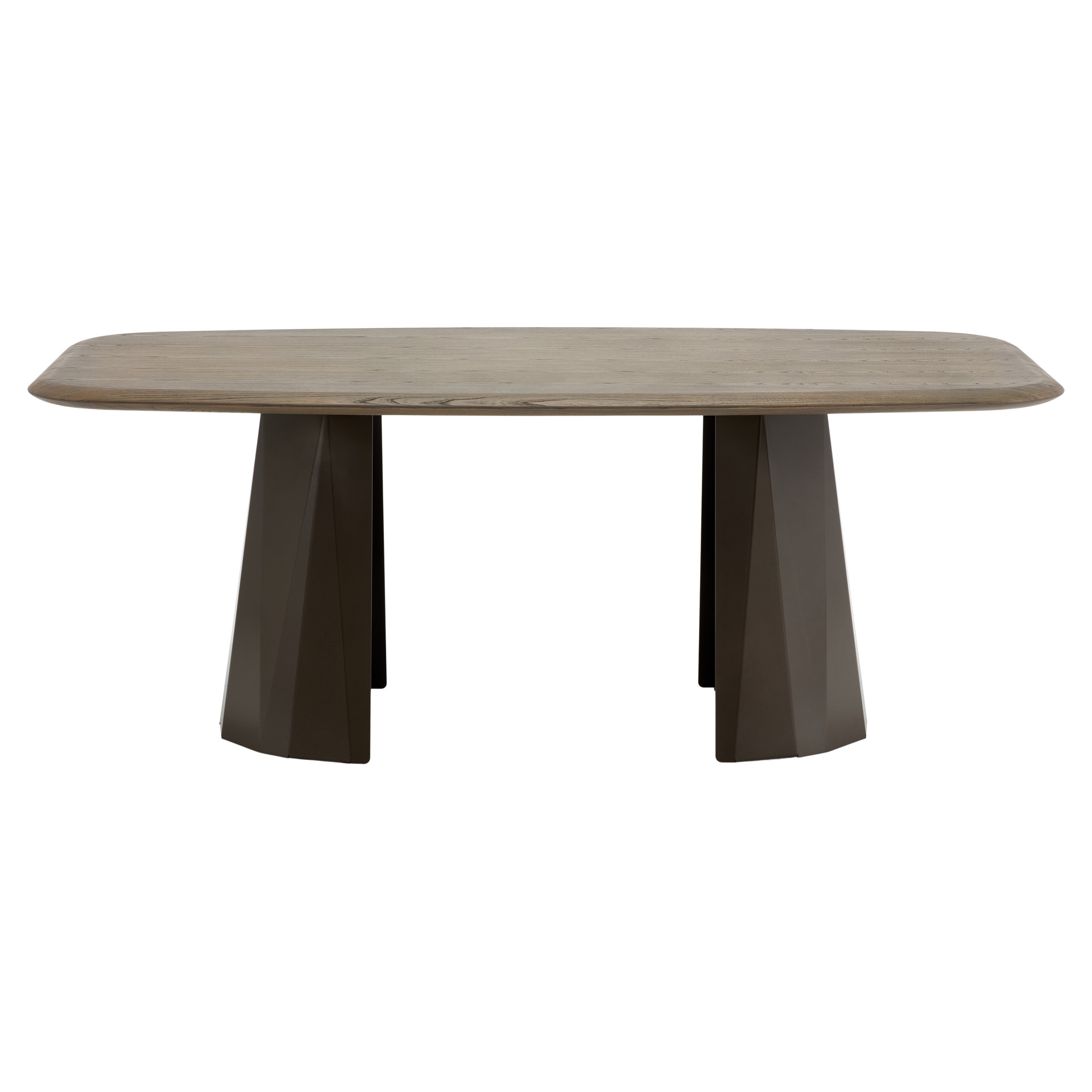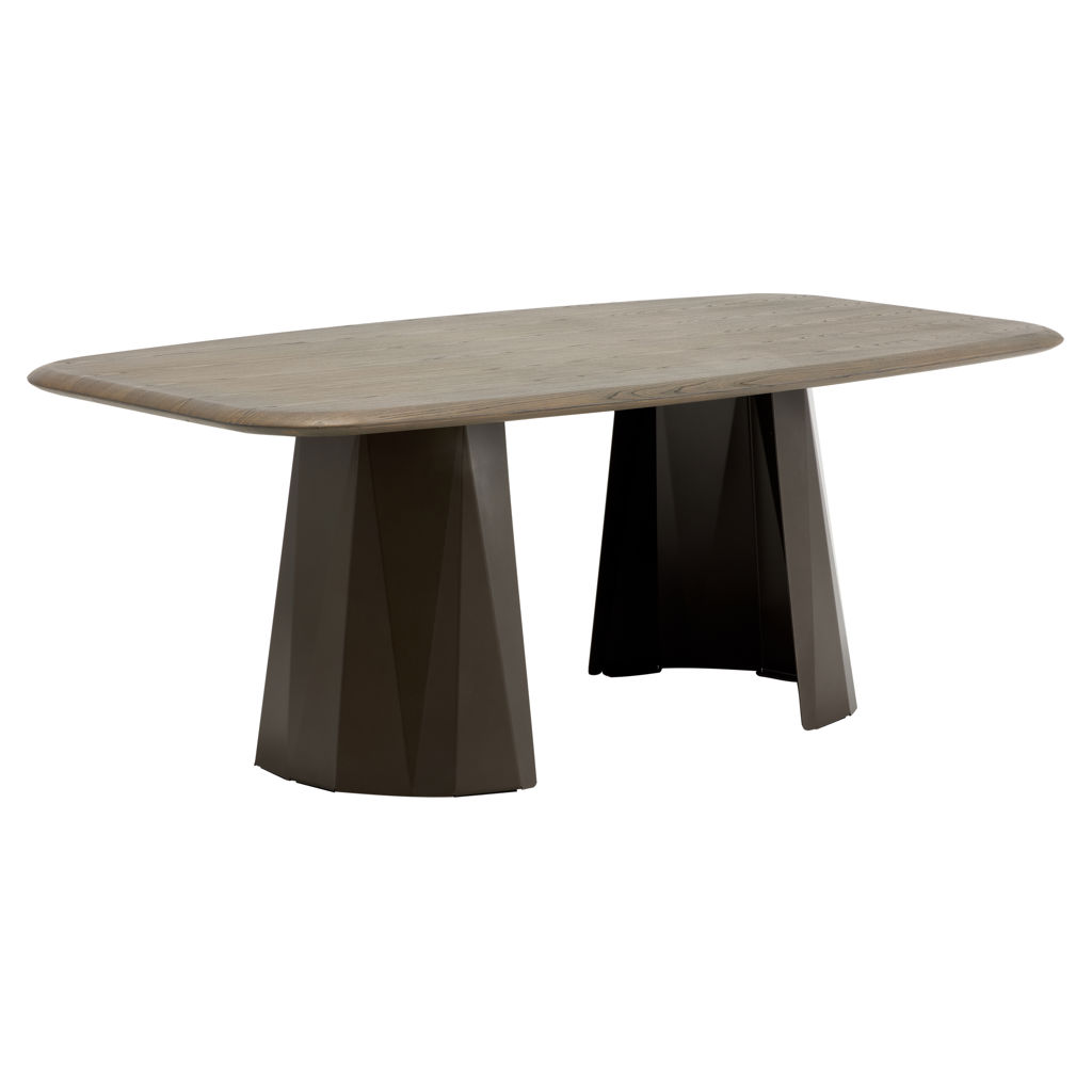 Table avec plateau rectangulaire arrondi en bois naturel aux finitions mate, supporté par un piètement géométrique en métal anthracite teinté bronze.