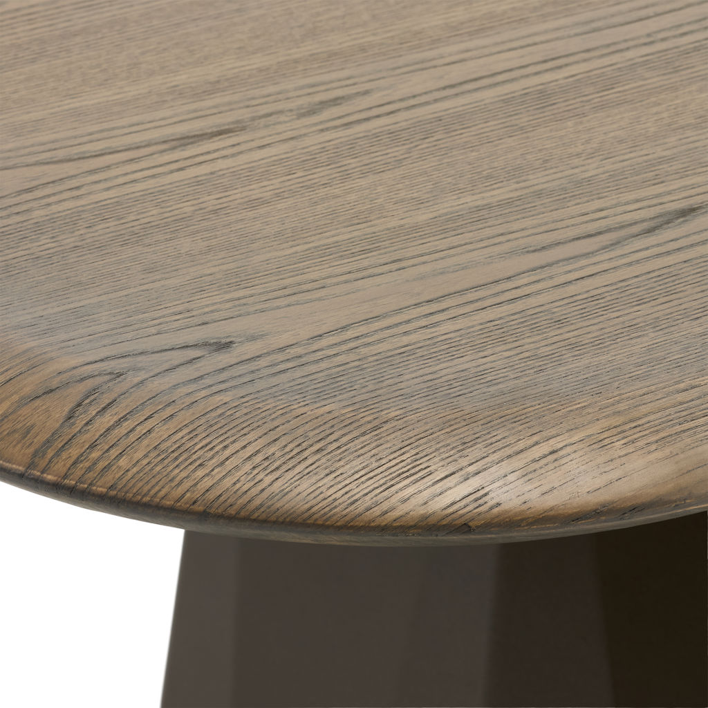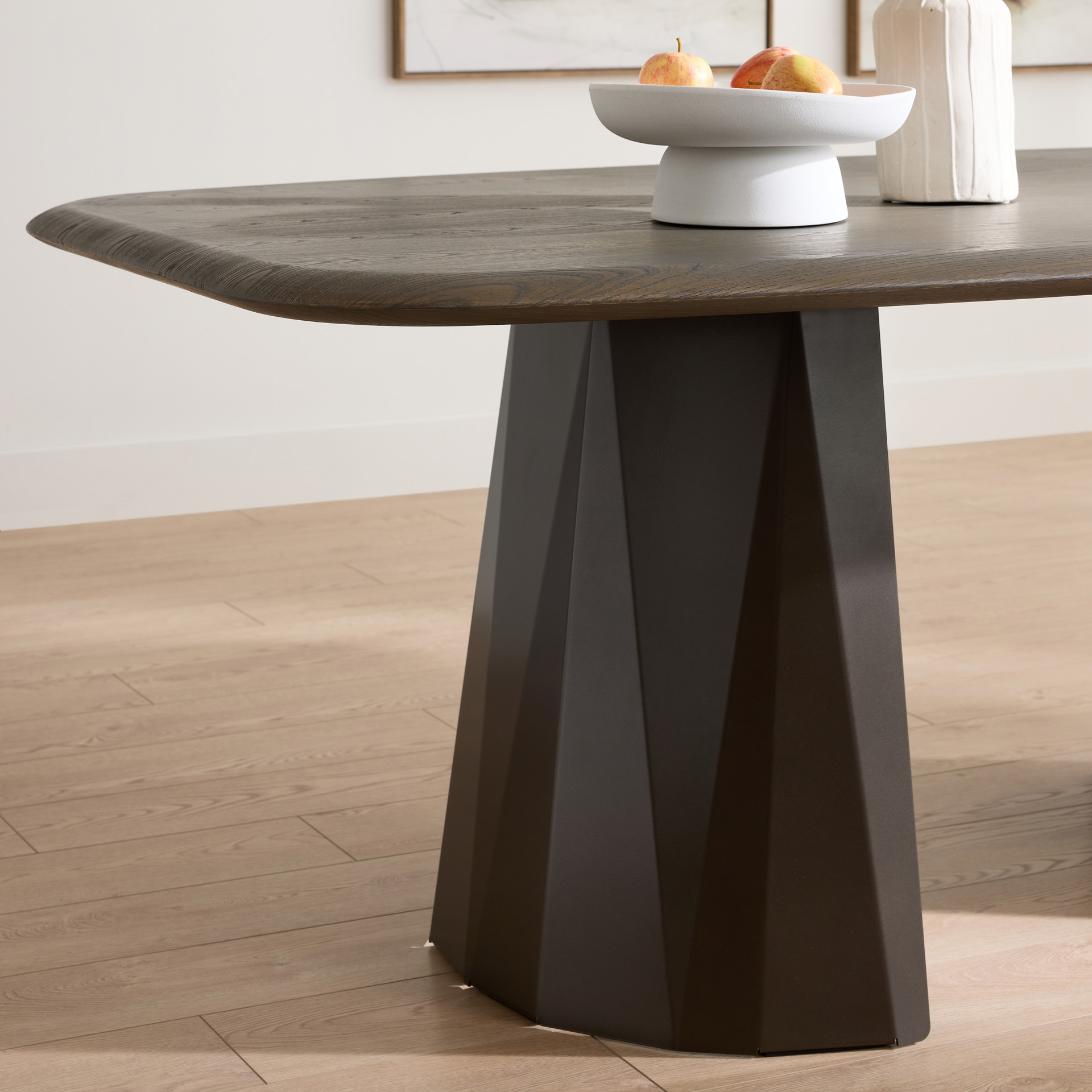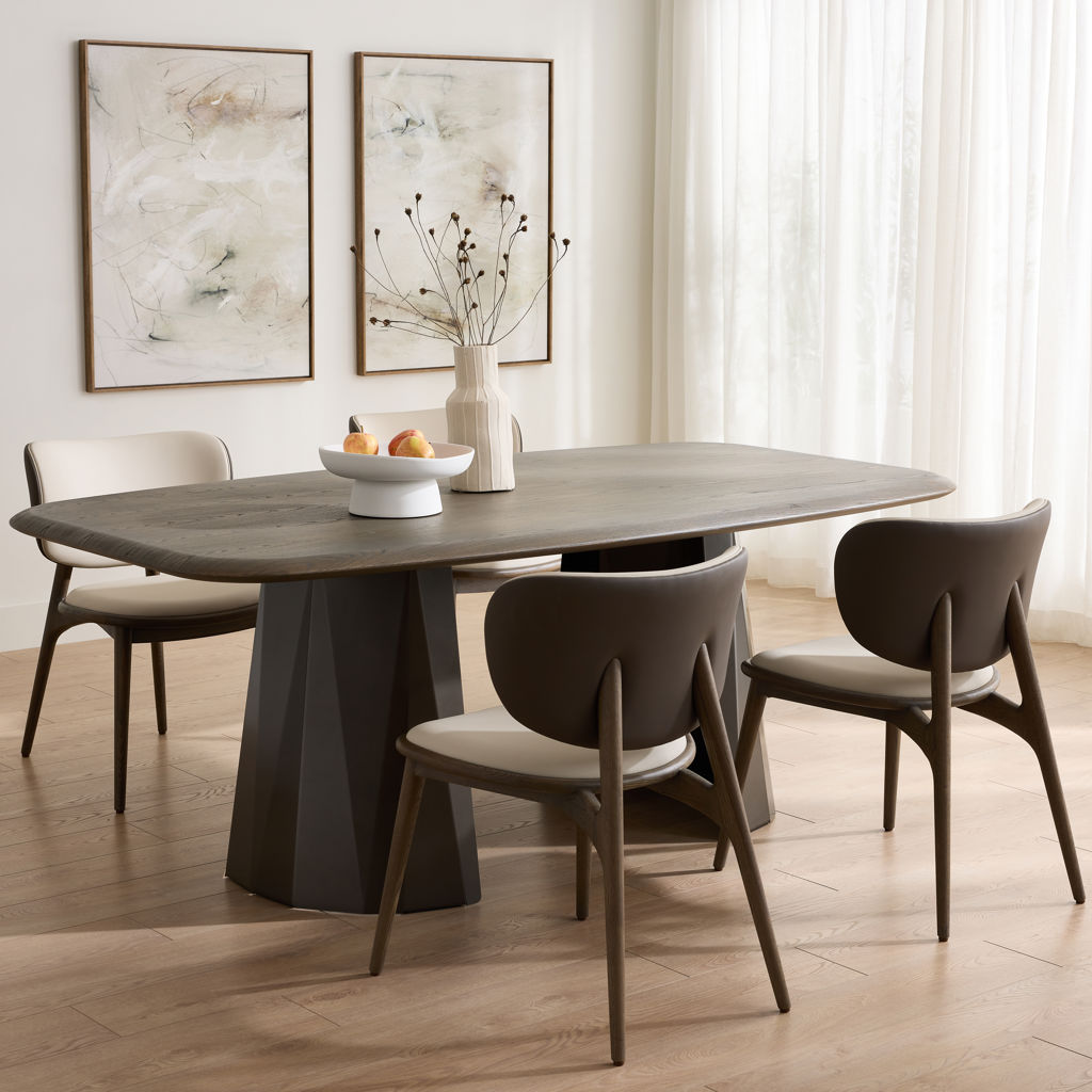 Table avec plateau rectangulaire arrondi en bois naturel aux finitions mate, supporté par un piètement géométrique en métal anthracite teinté bronze.
