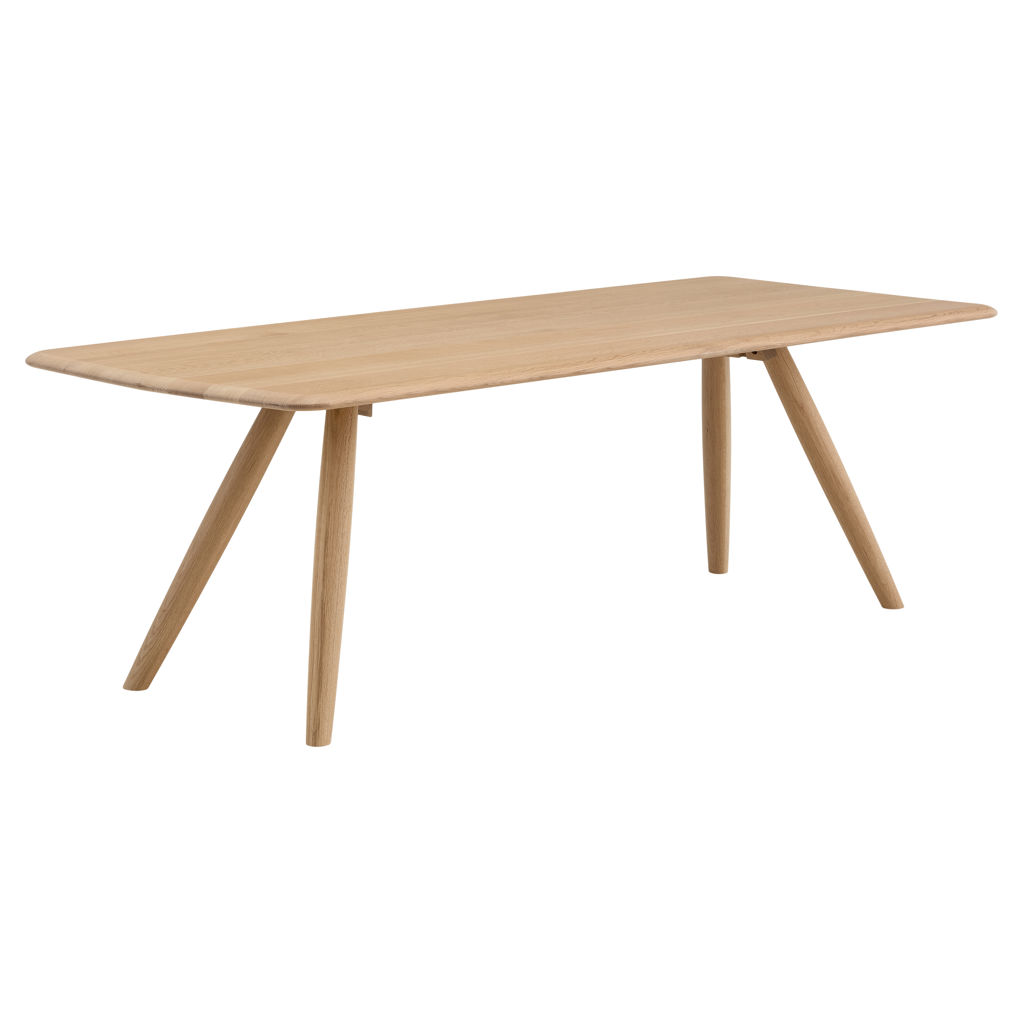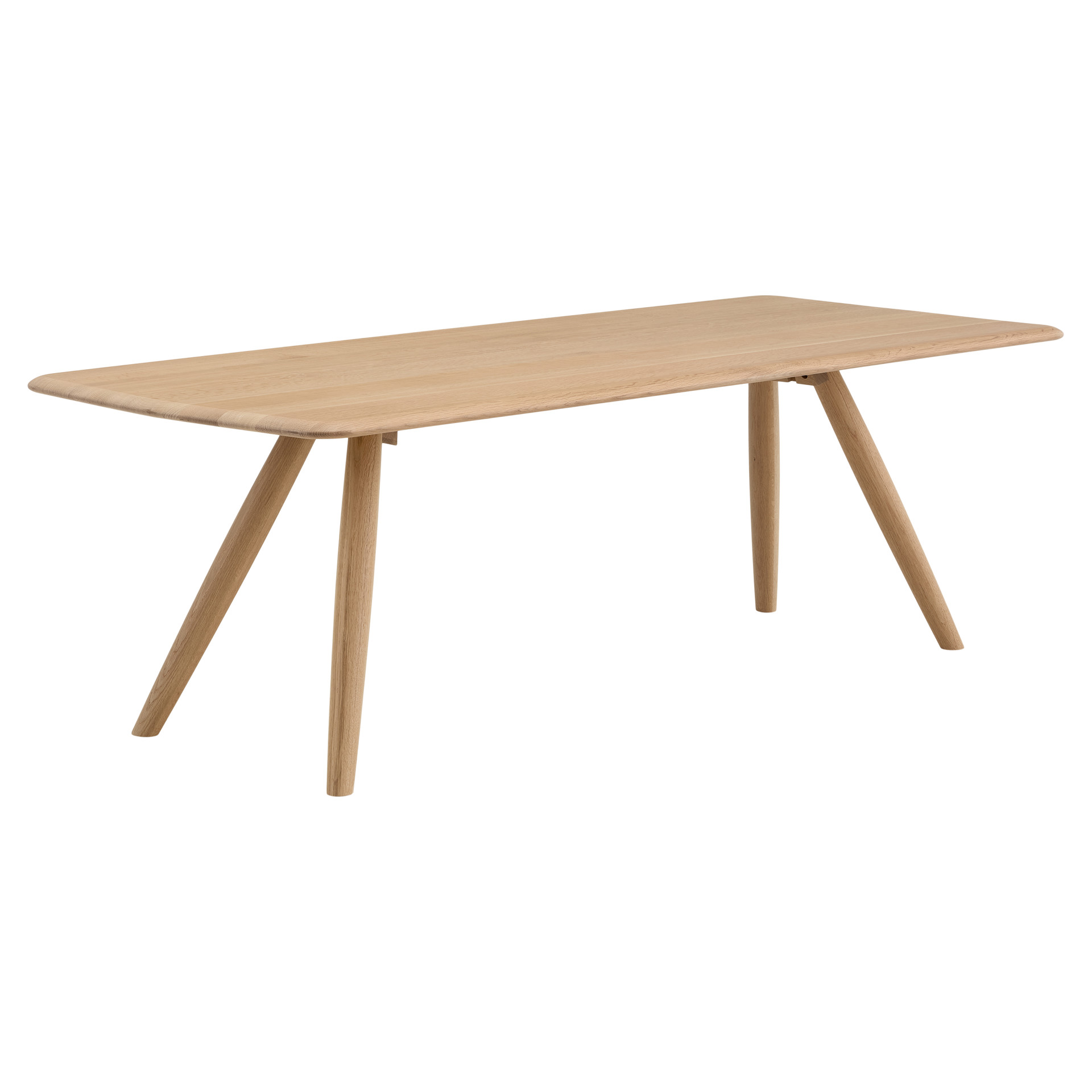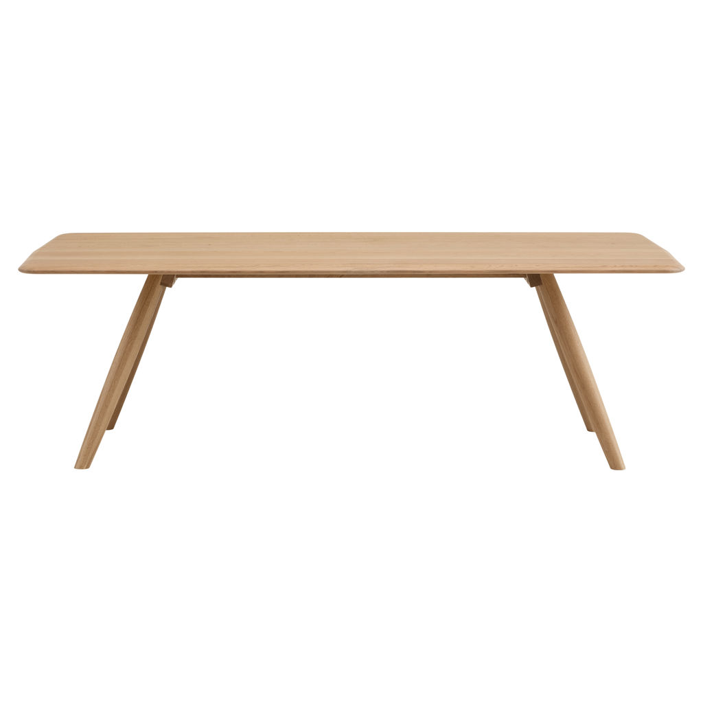 Table à manger en chêne massif de 40" x 94", conçue pour accueillir de 8 à 10 personnes. Structure robuste avec plateau rectangulaire aux coins arrondis. Finition naturelle mettant en valeur le grain du bois. Pieds inclinés assurant stabilité et support. Convient à un usage quotidien ou professionnel. Style minimaliste, compatible avec divers environnements contemporains.