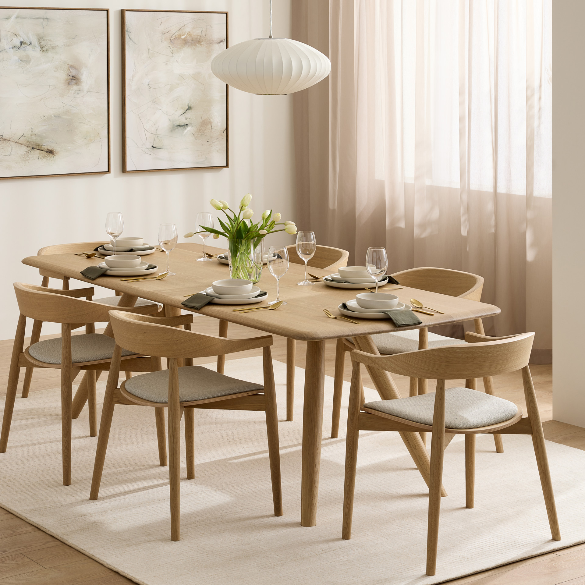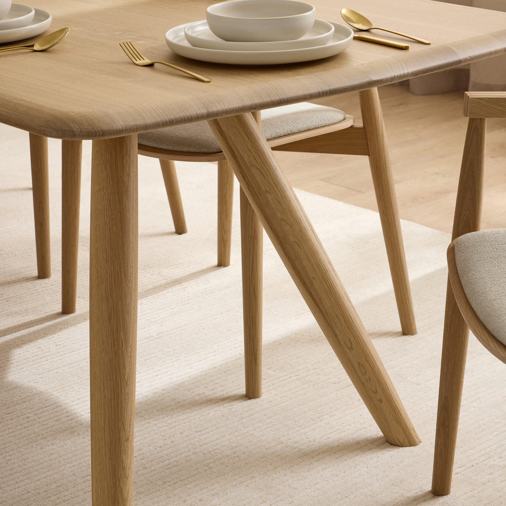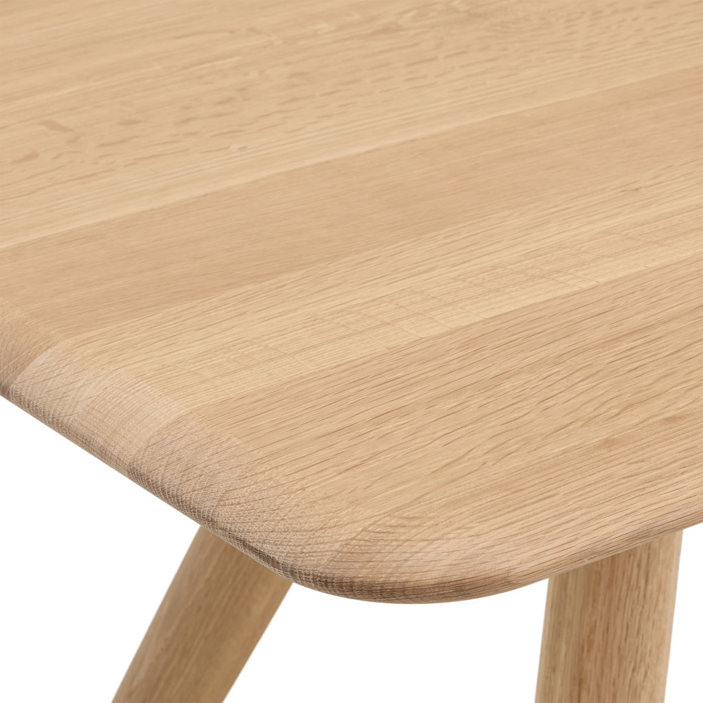 Table à manger en chêne massif de 40" x 94", conçue pour accueillir de 8 à 10 personnes. Structure robuste avec plateau rectangulaire aux coins arrondis. Finition naturelle mettant en valeur le grain du bois. Pieds inclinés assurant stabilité et support. Convient à un usage quotidien ou professionnel. Style minimaliste, compatible avec divers environnements contemporains.
