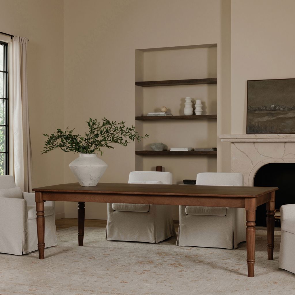 La table de salle à manger Russet présente de magnifiques pieds tournés, des détails finement sculptés et une finition brun moyen qui s'intègre parfaitement dans des intérieurs traditionnels et transitionnels.