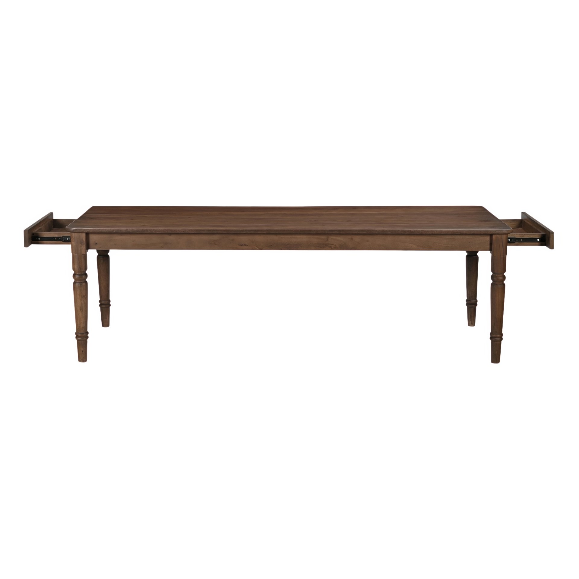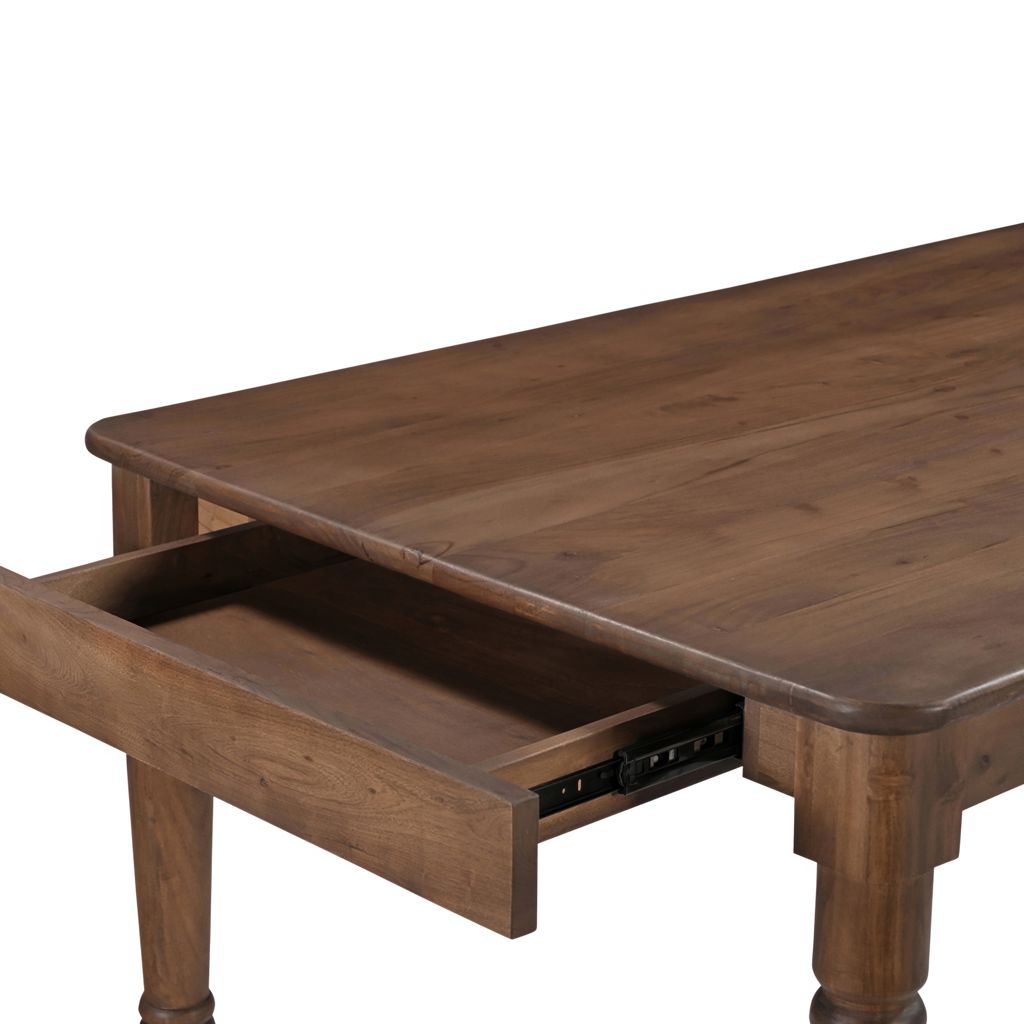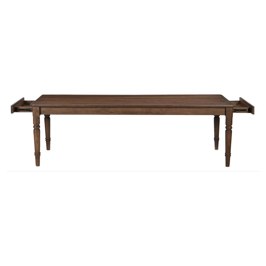 Son charme est renforcé par deux tiroirs horizontaux à chaque extrémité pour un rangement pratique, complétés par un plateau qui surplombe et qui accentue son esthétique classique, un centre de table intemporel, enrichissant l'expérience culinaire avec style et fonctionnalité.