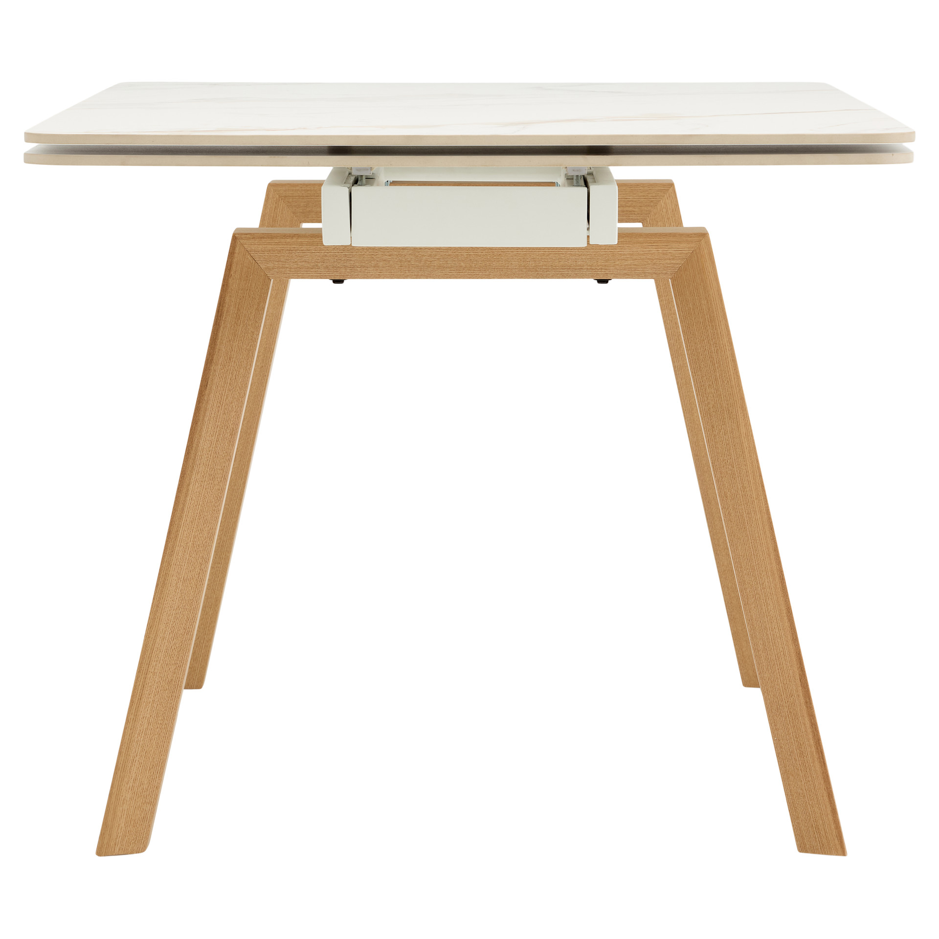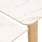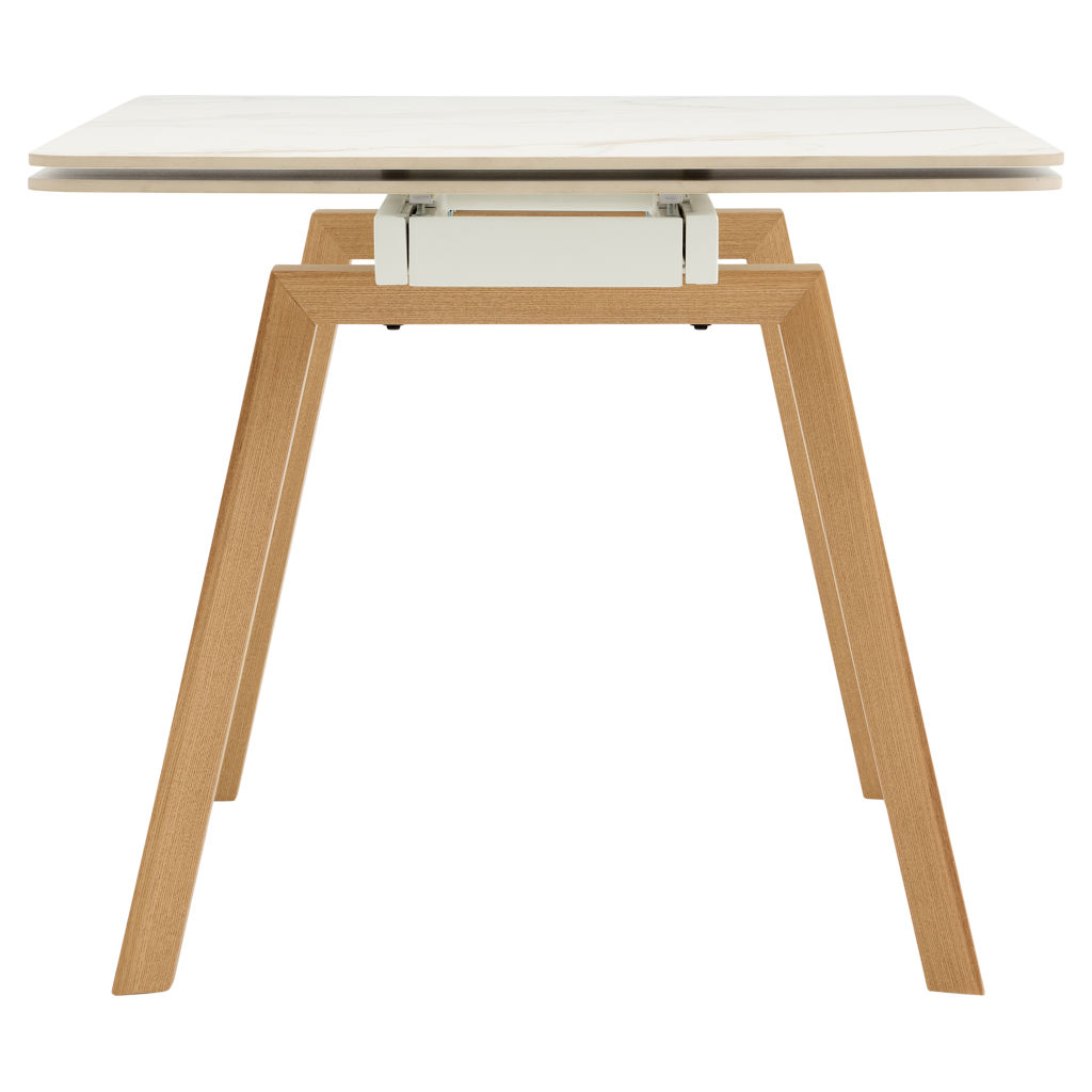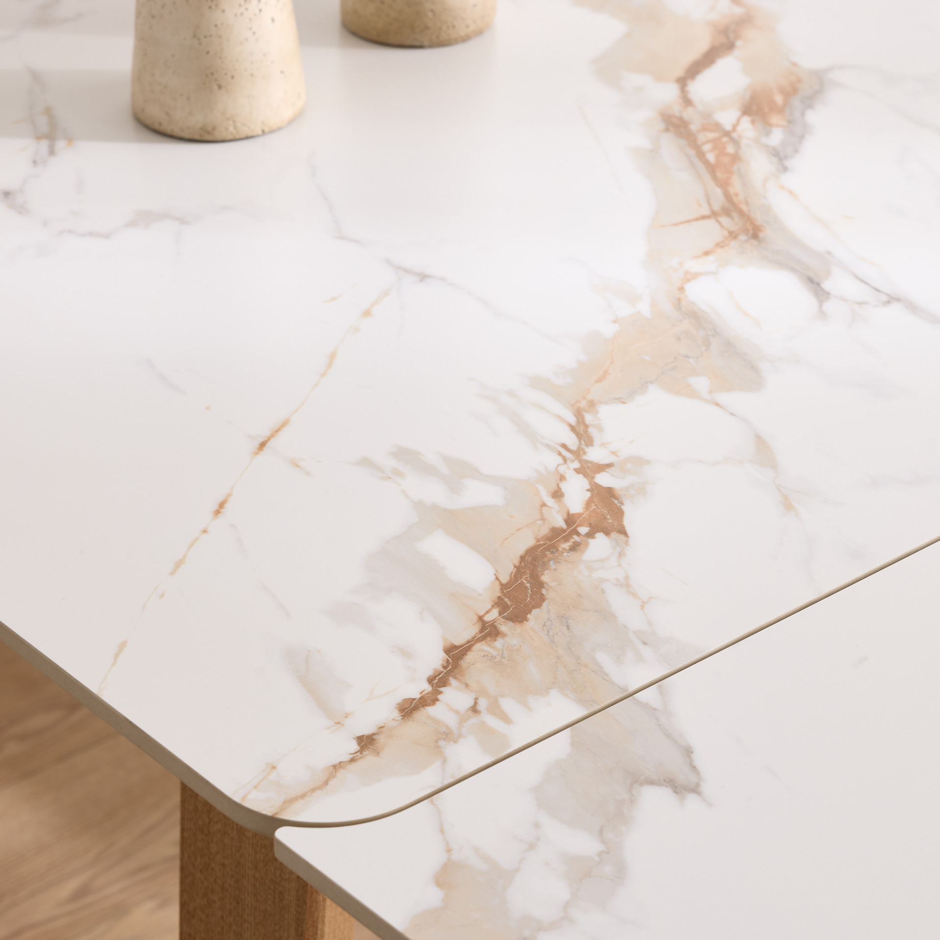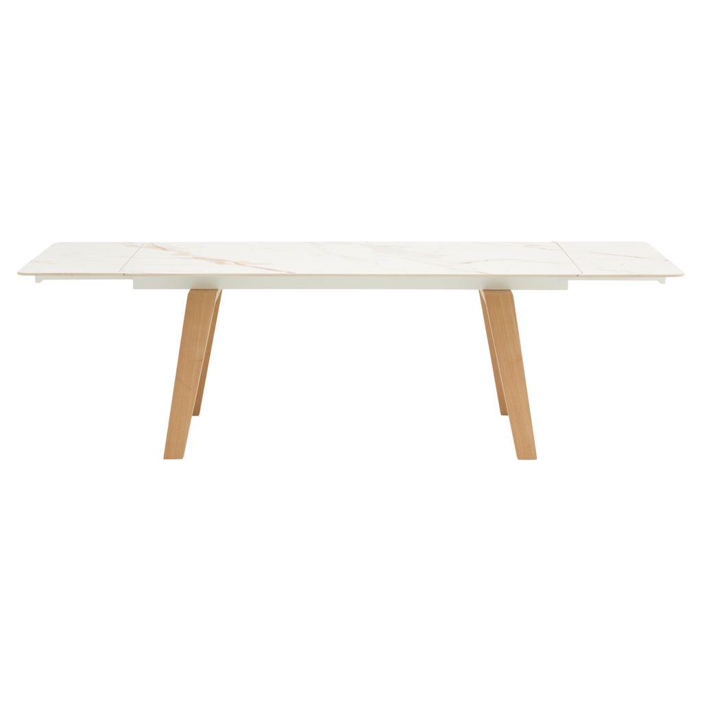 Alliant élégance et praticité, la table extensible Ophélie est dotée d'un plateau en céramique résistant aux rayures et se distingue par son plateau fini marbre et sa structure en bois clair tendance qui rehausseront le charme de votre salle à manger.