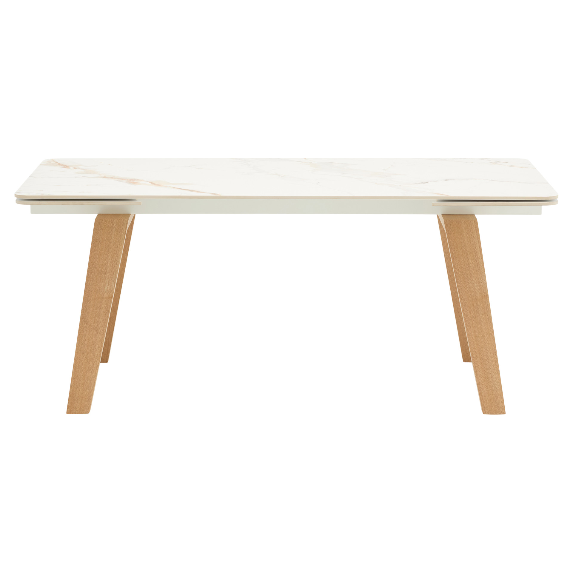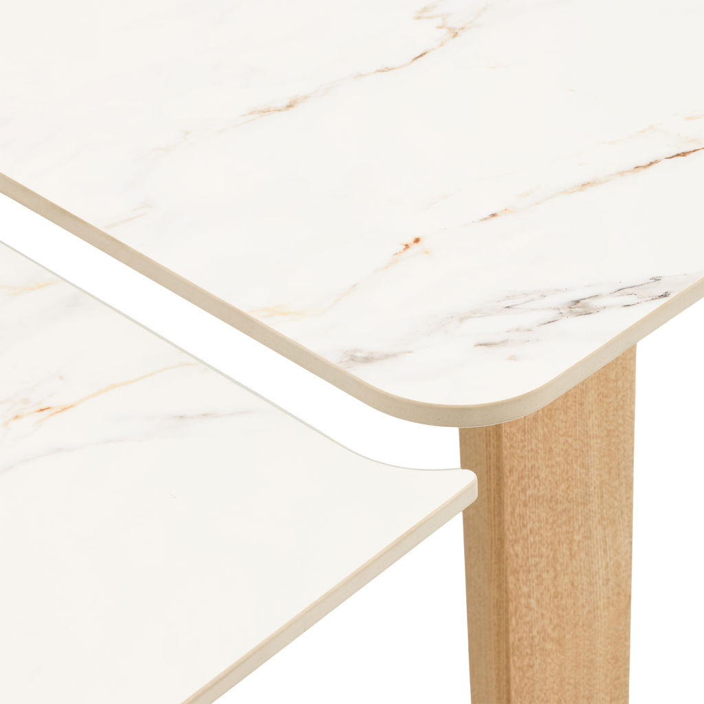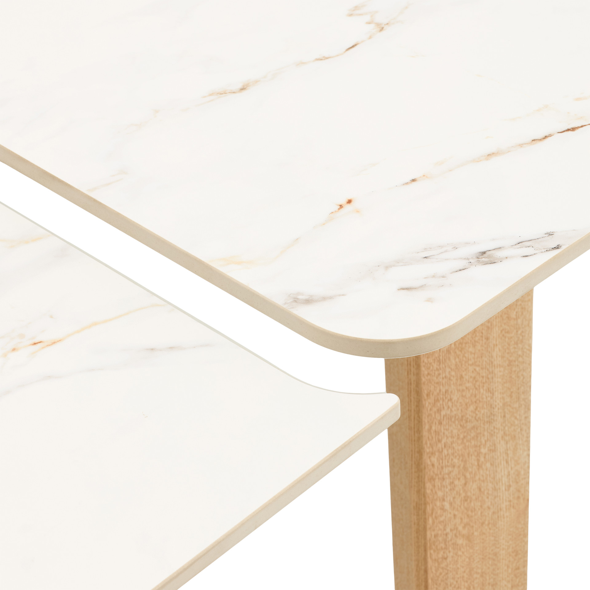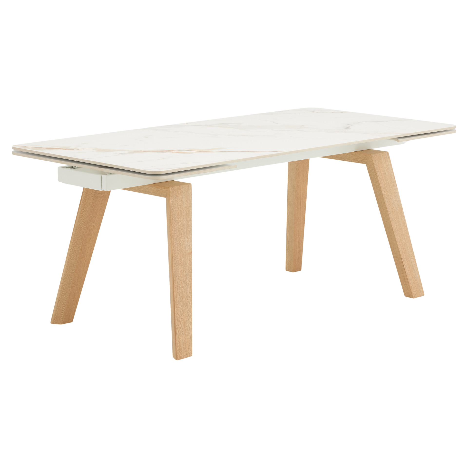 Alliant élégance et praticité, la table extensible Ophélie est dotée d'un plateau en céramique résistant aux rayures et se distingue par son plateau fini marbre et sa structure en bois clair tendance qui rehausseront le charme de votre salle à manger.