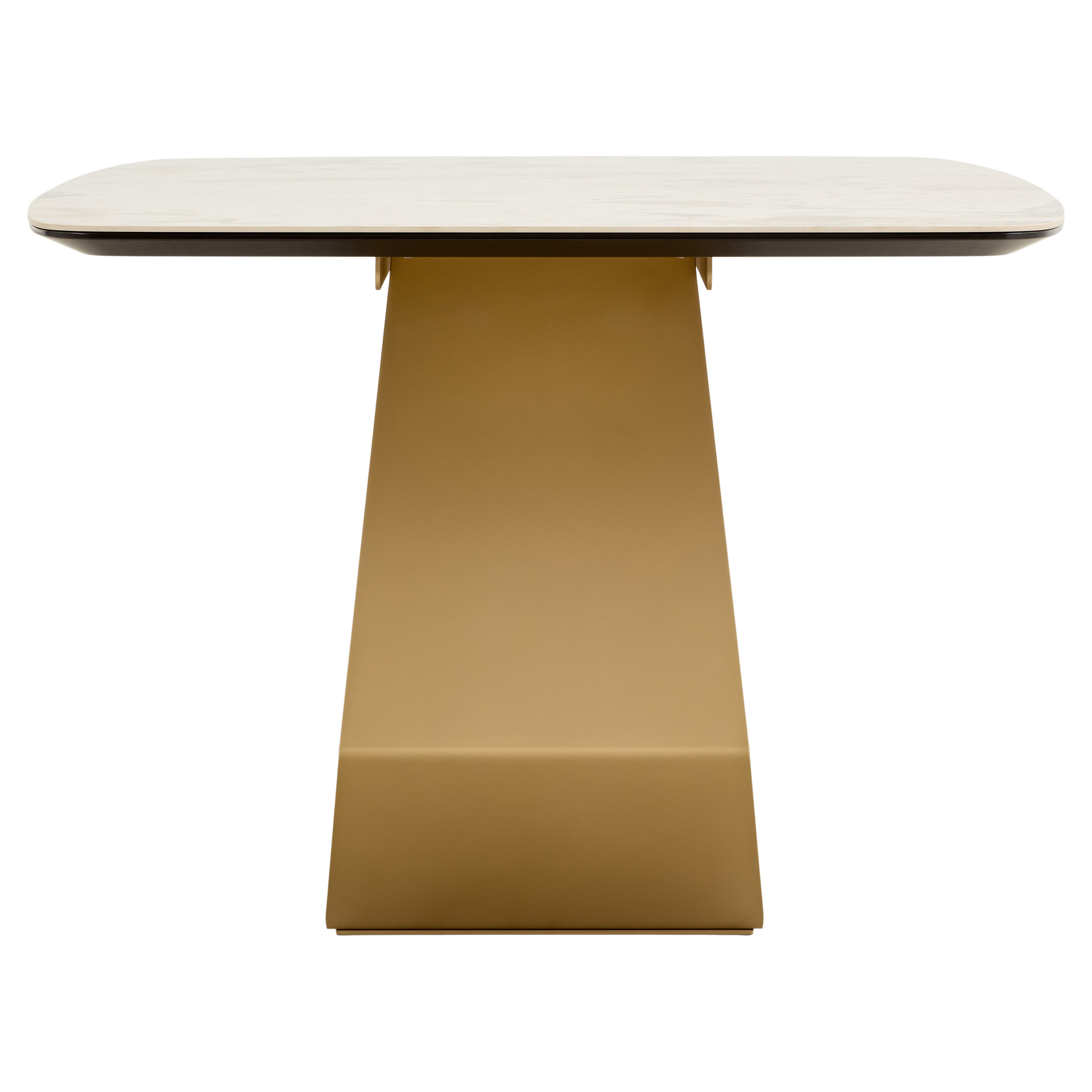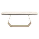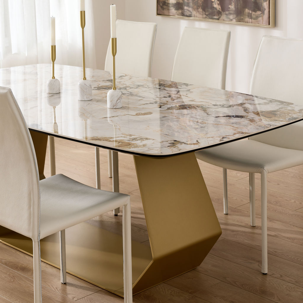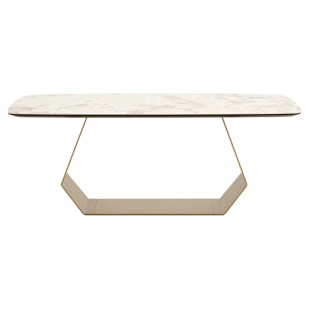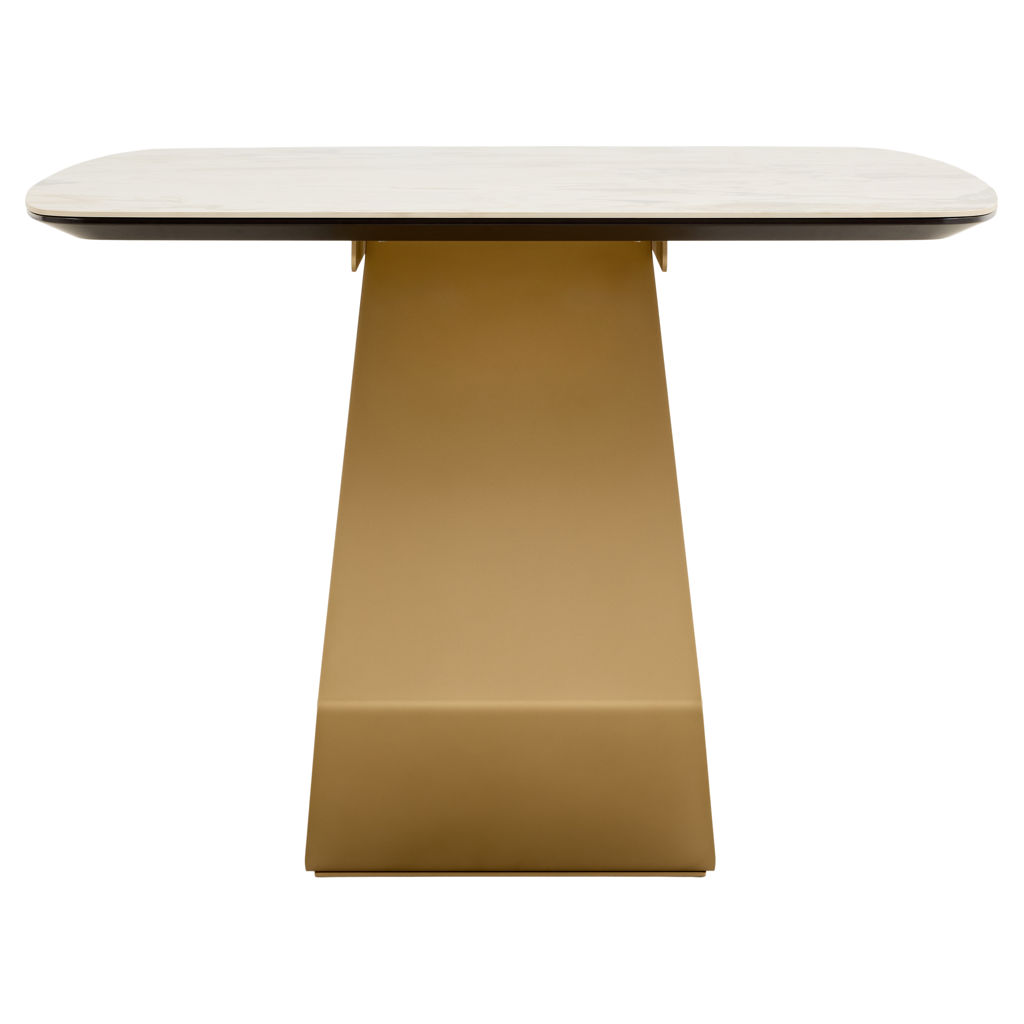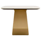 Inspirée du design contemporain italien, elle séduit par ses lignes épurées et son allure sculpturale. Son pied en métal couleur champagne apporte une touche luxueuse et unique, tandis que le dessus en céramique offre une surface durable et facile d’entretien.