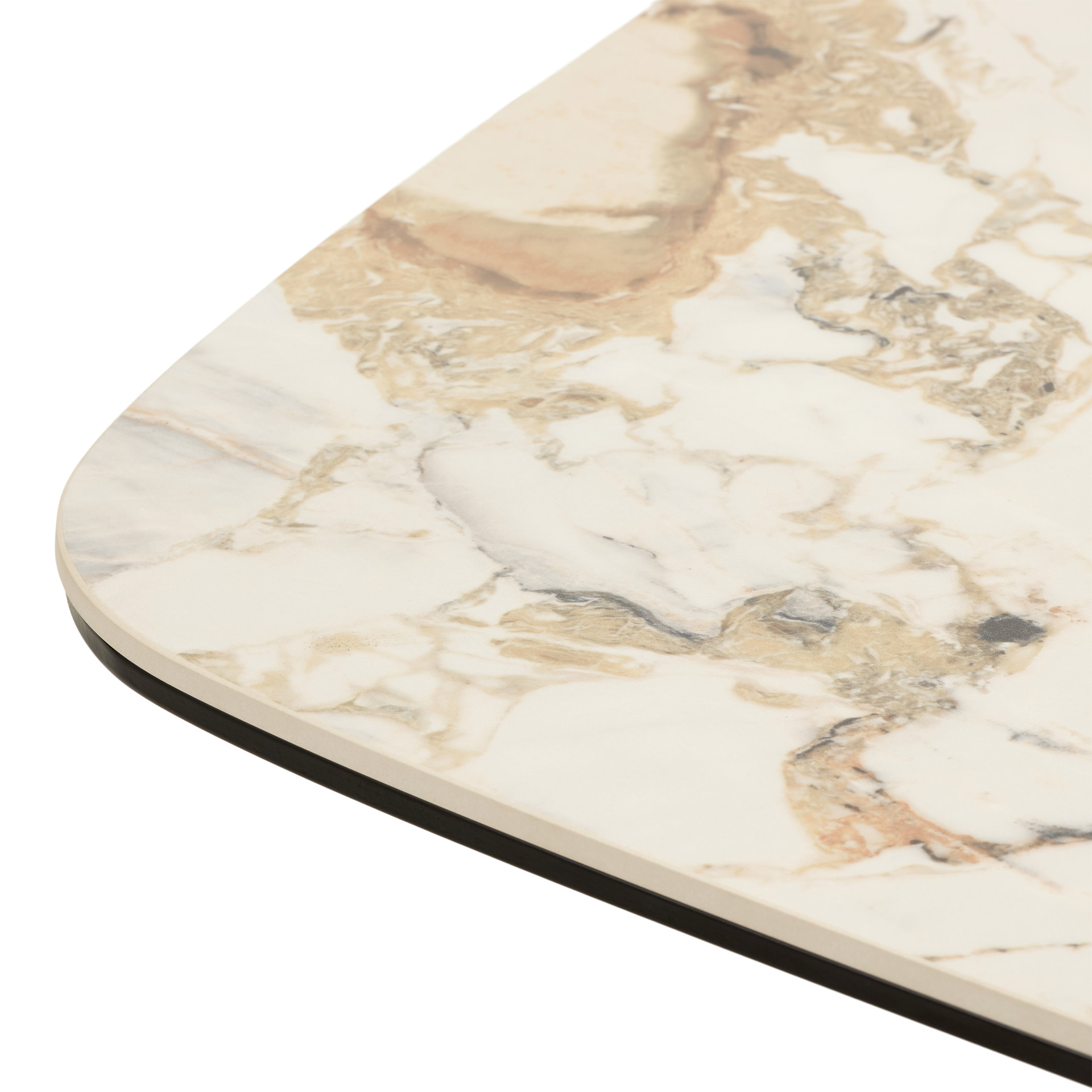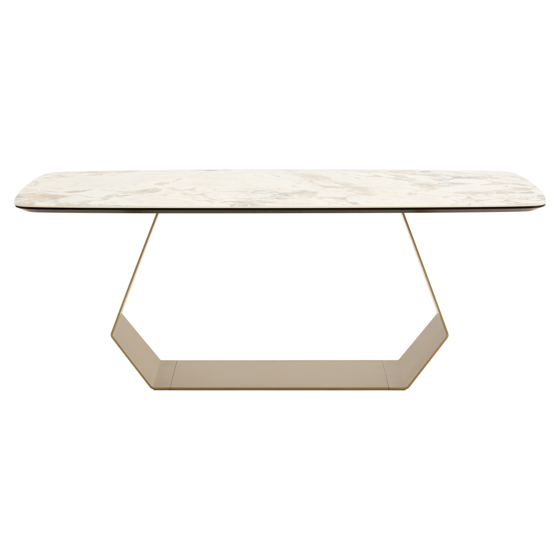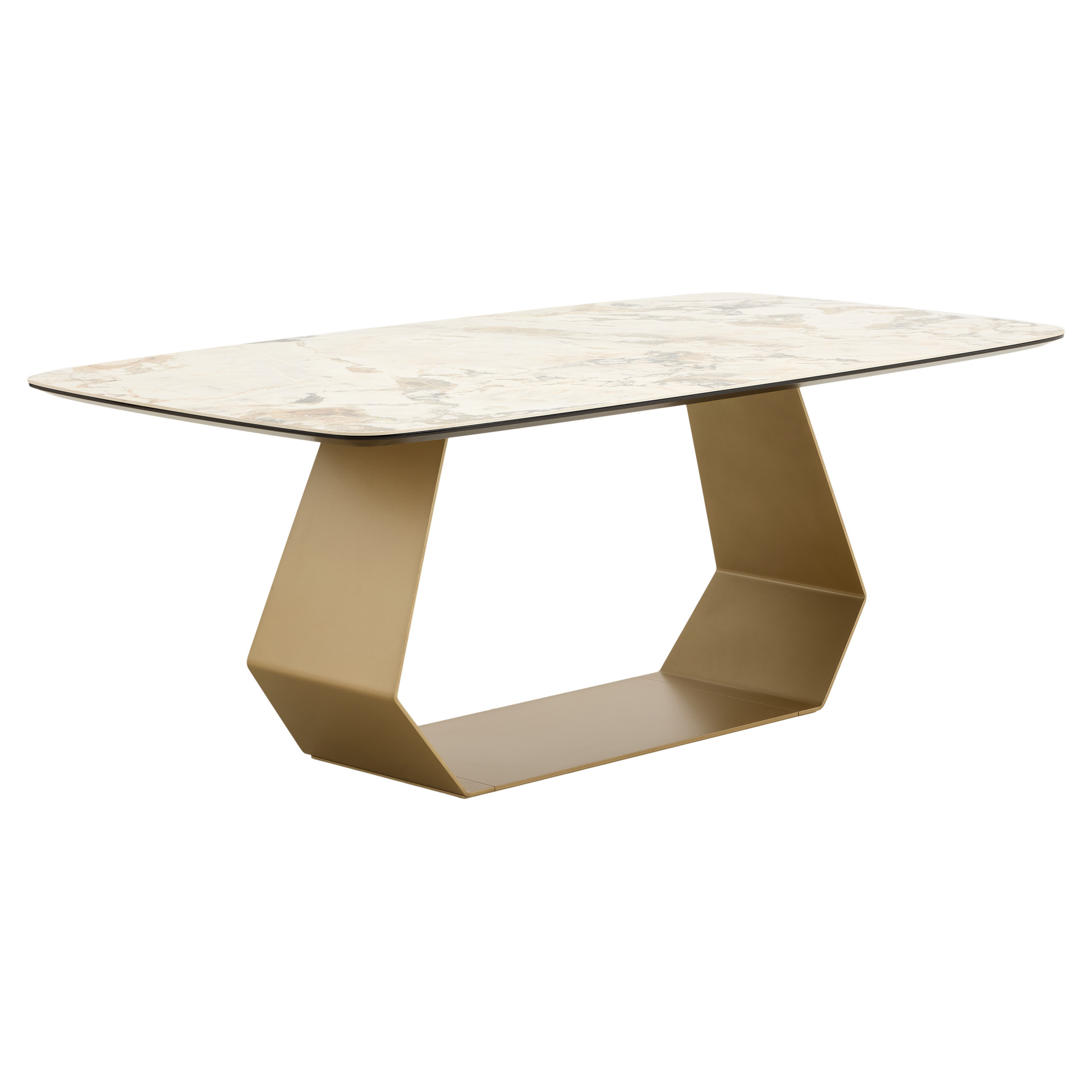 Inspirée du design contemporain italien, elle séduit par ses lignes épurées et son allure sculpturale. Son pied en métal couleur champagne apporte une touche luxueuse et unique, tandis que le dessus en céramique offre une surface durable et facile d’entretien.
