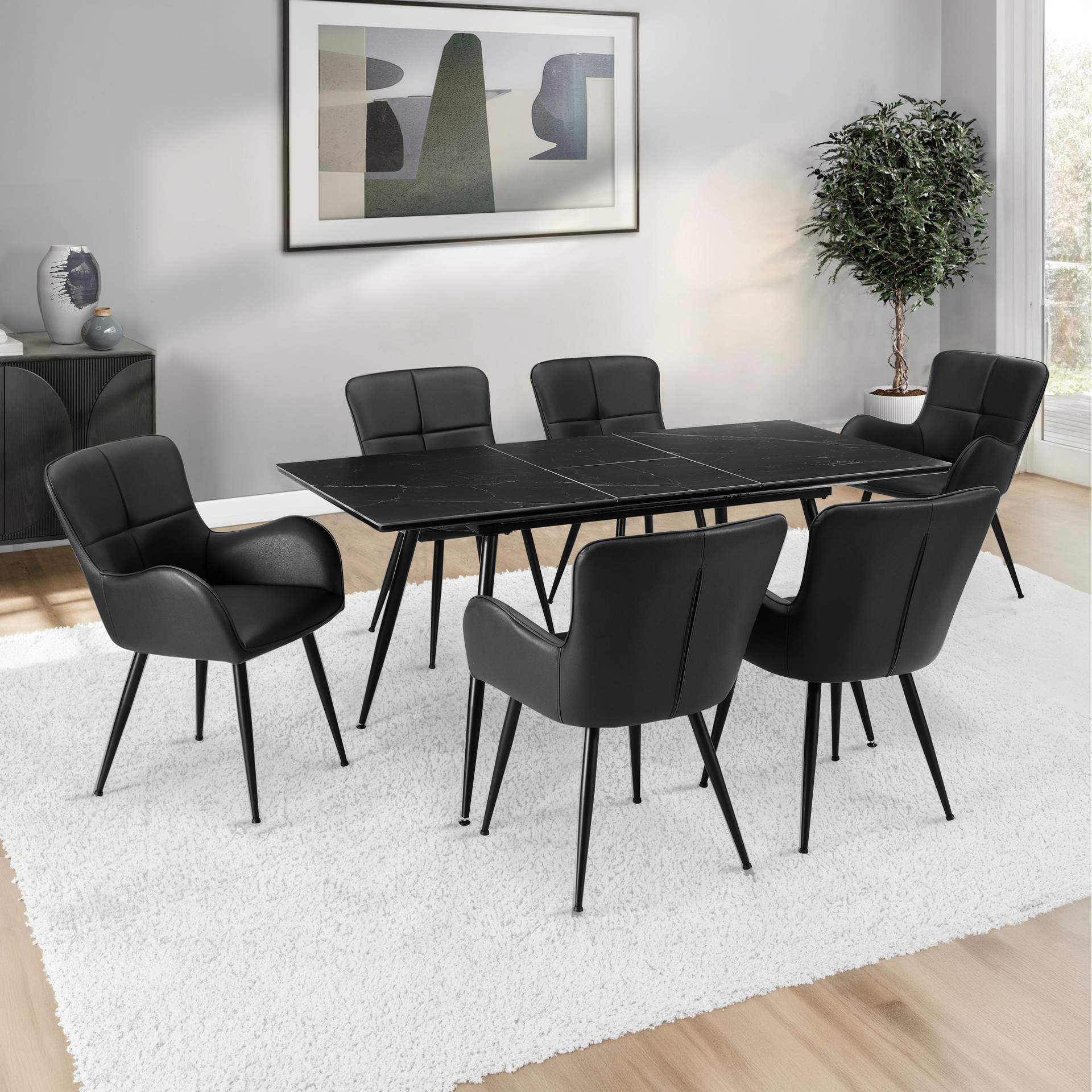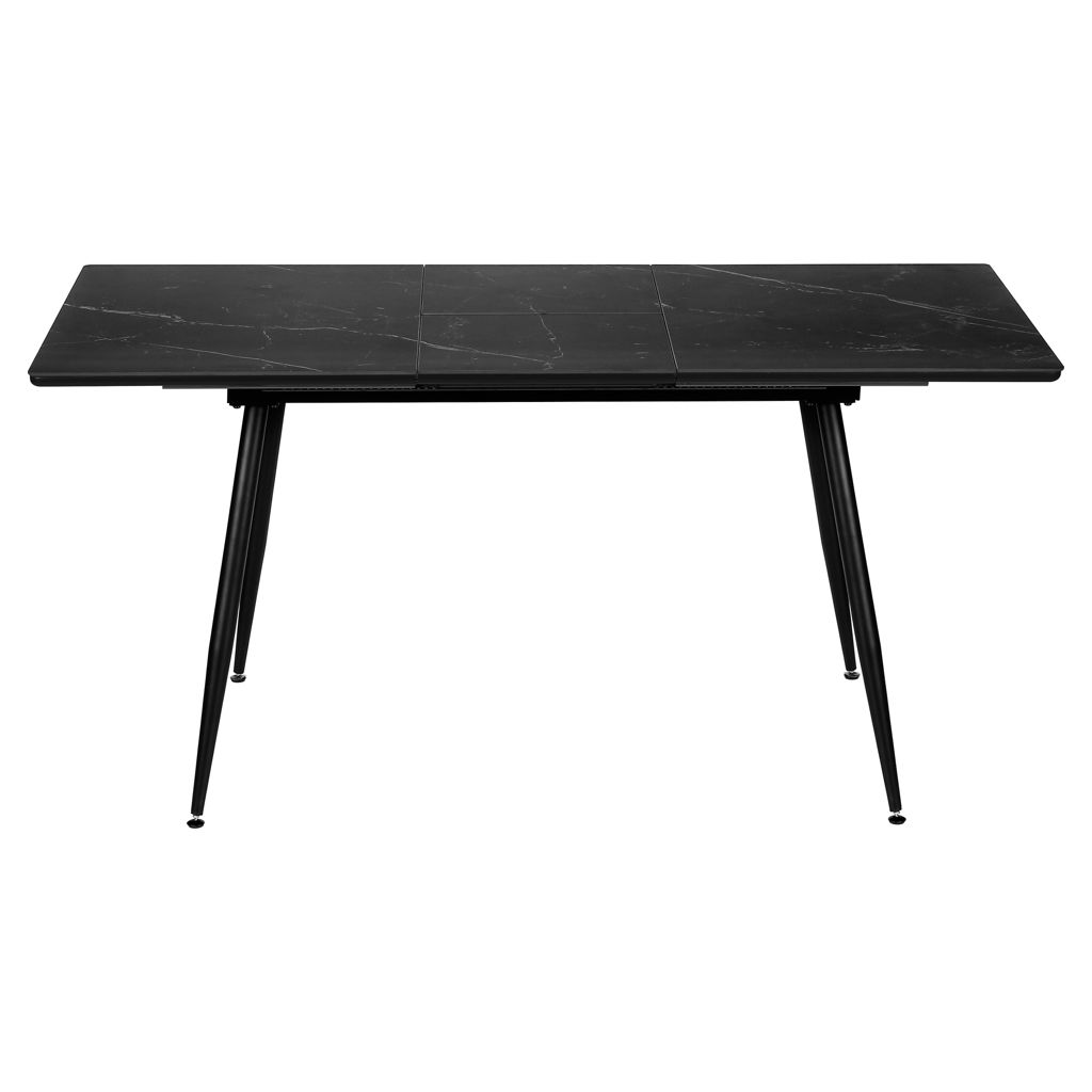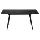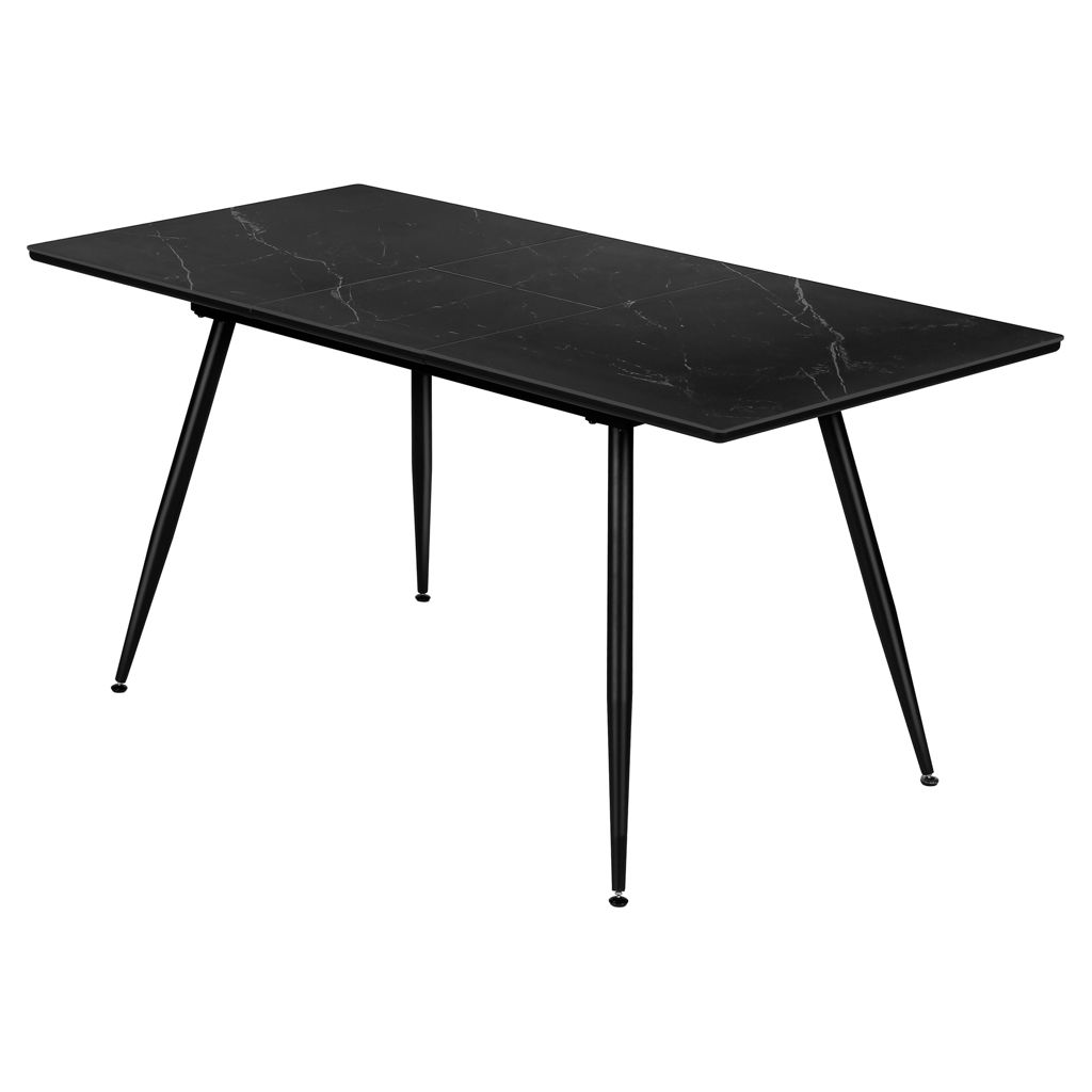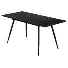 La table repose sur des pieds en métal noir robustes, inclinés de manière distinctive, apportant stabilité et style contemporain à l'ensemble. Conçue pour une utilisation durable, cette table à manger est facile à assembler et est accompagnée d'une garantie limitée de 2 ans, offrant fiabilité et élégance moderne.