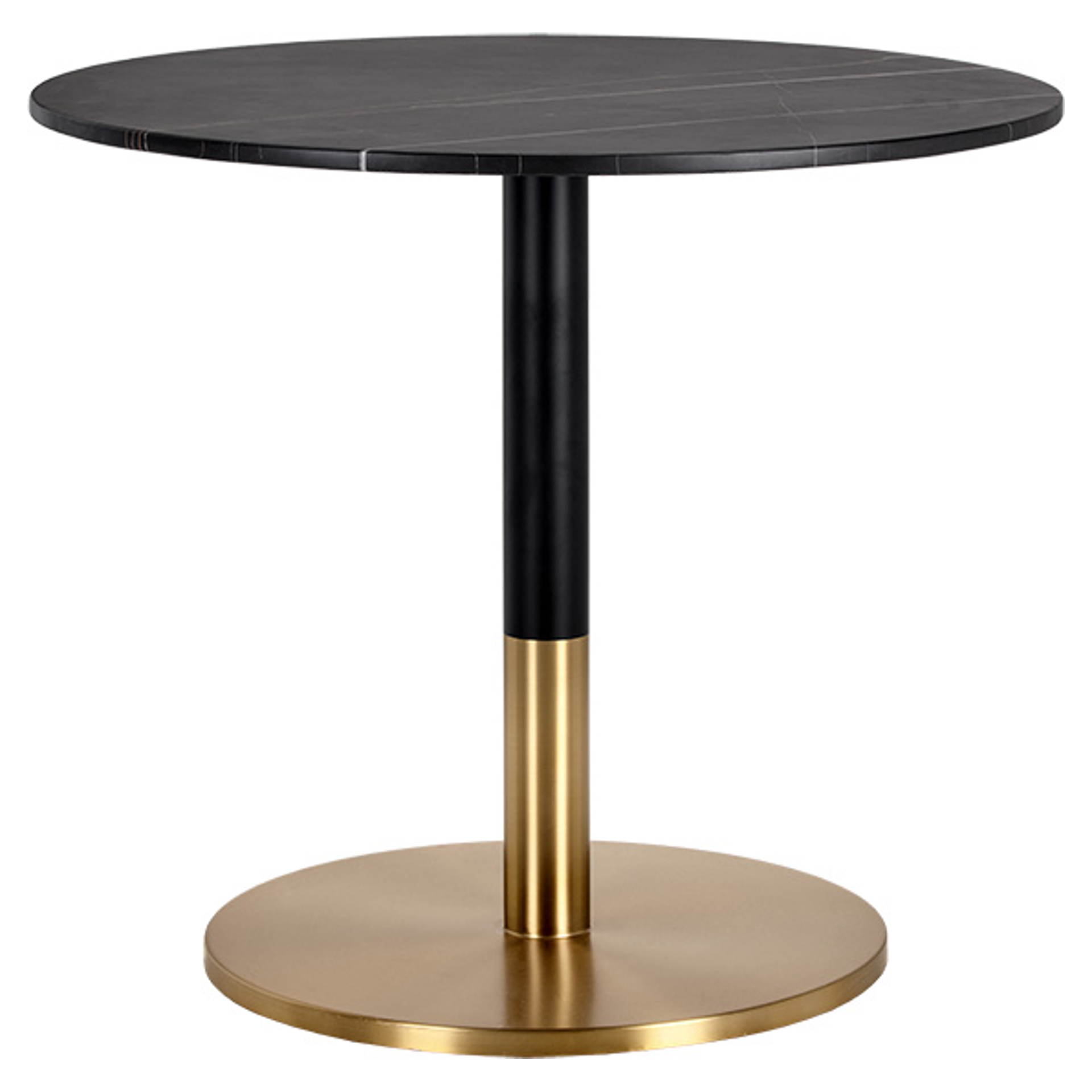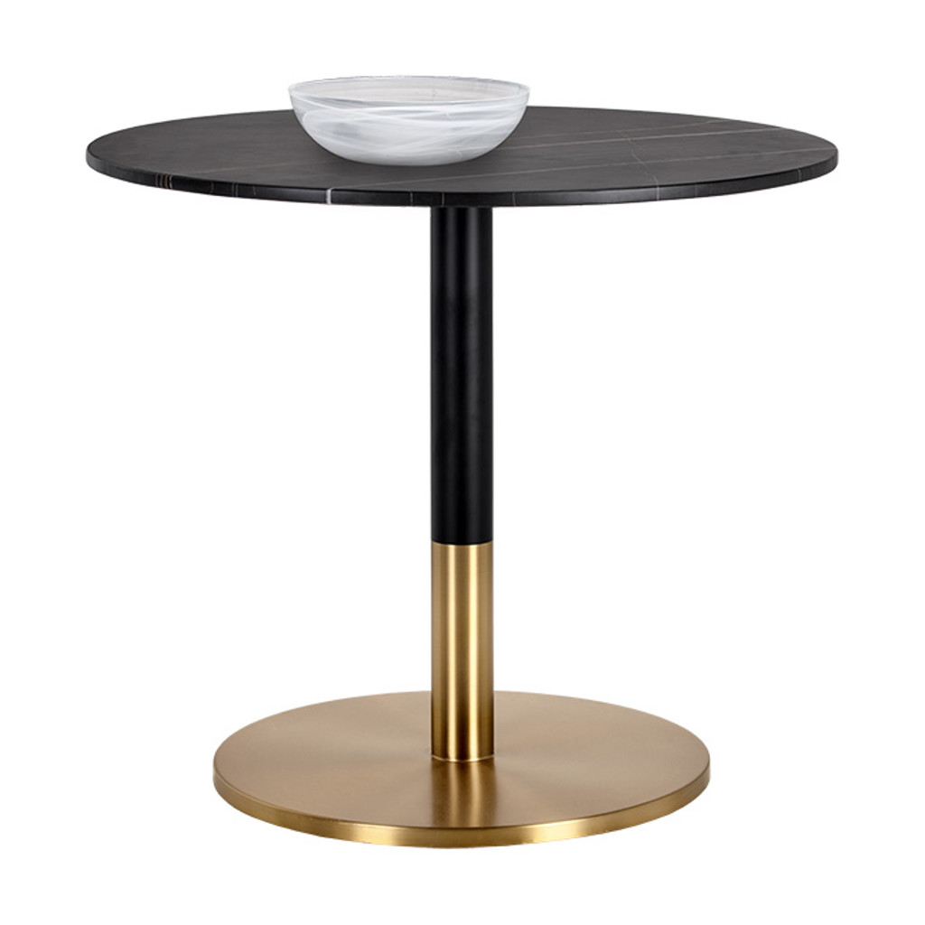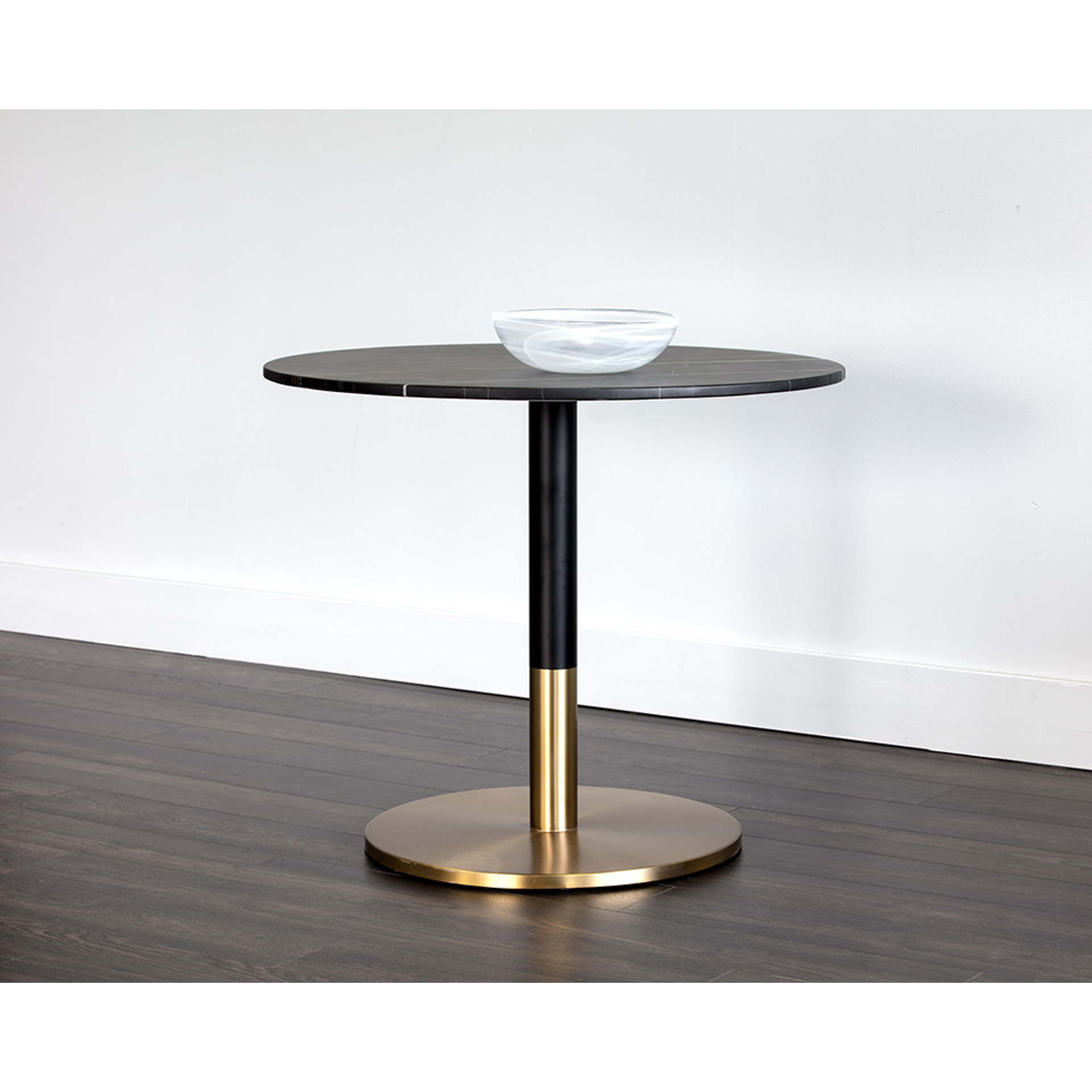 Une table de bistrot ronde de notre collection Ikon inspirée du luxe Art Déco. Comprend un dessus en marbre avec des veines dorées et blanches frappantes et une base en acier. Parfait pour les petites cuisines et salles à manger. Le marbre étant un matériau naturel, veines uniques, piqûres, fissures, micro-fissures et variations de couleur sont toutes des caractéristiques qui ajoutent à l'unicité et à la beauté de chaque pièce.