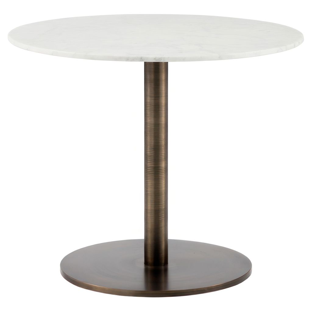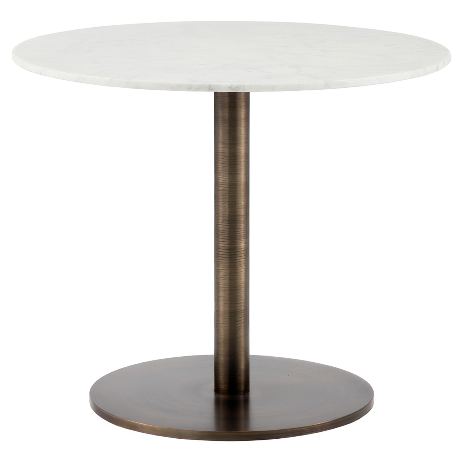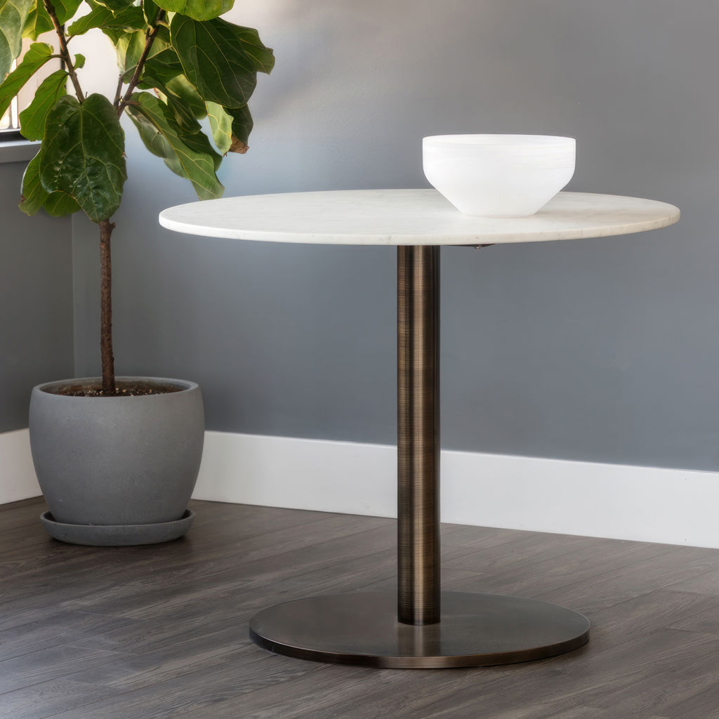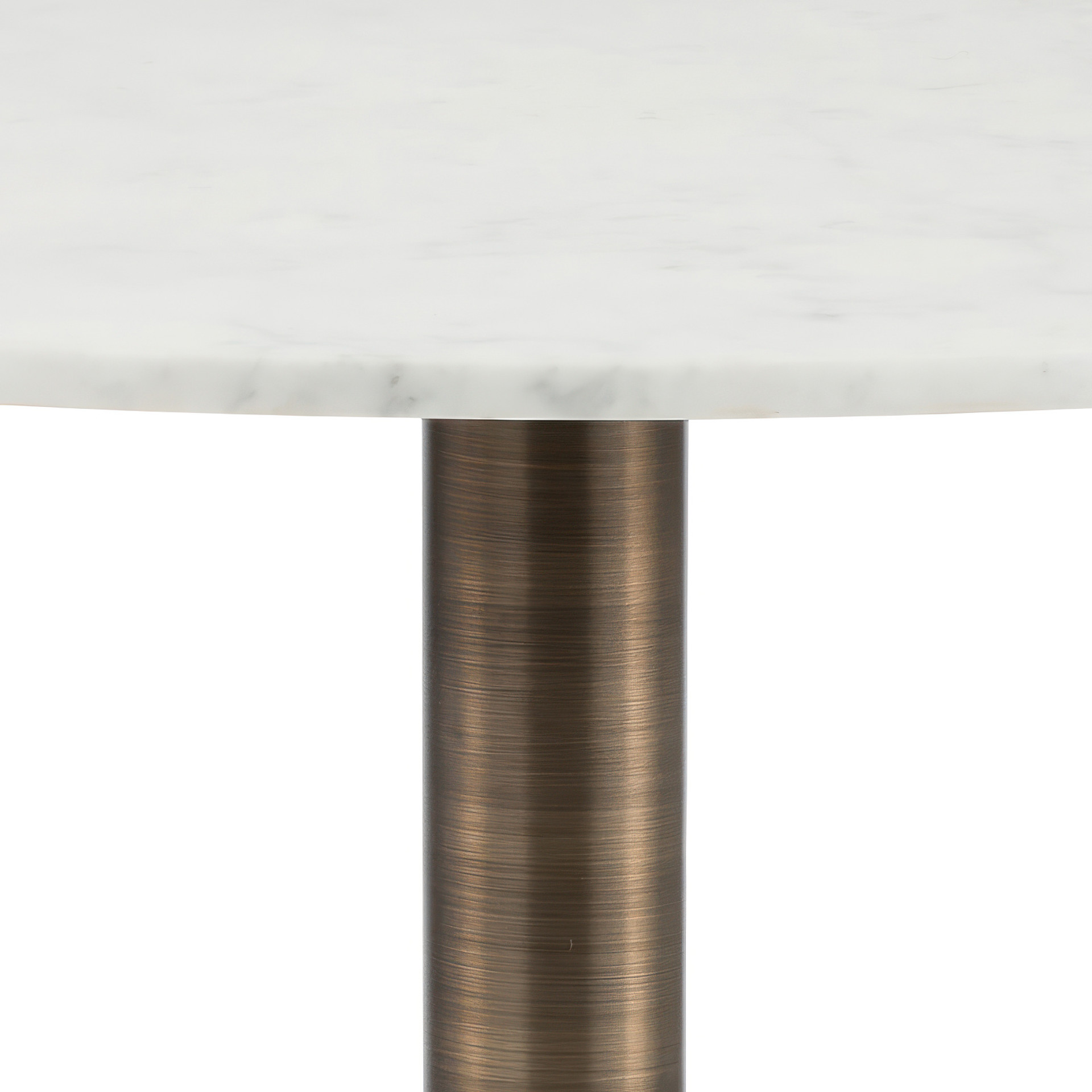 Une table de bistro ronde d'inspiration Art Déco de la collection Ikon, avec un plateau en marbre de Carrare massif et une base en acier bronze antique. Parfait pour les restaurants et les petites cuisines et salles à manger.