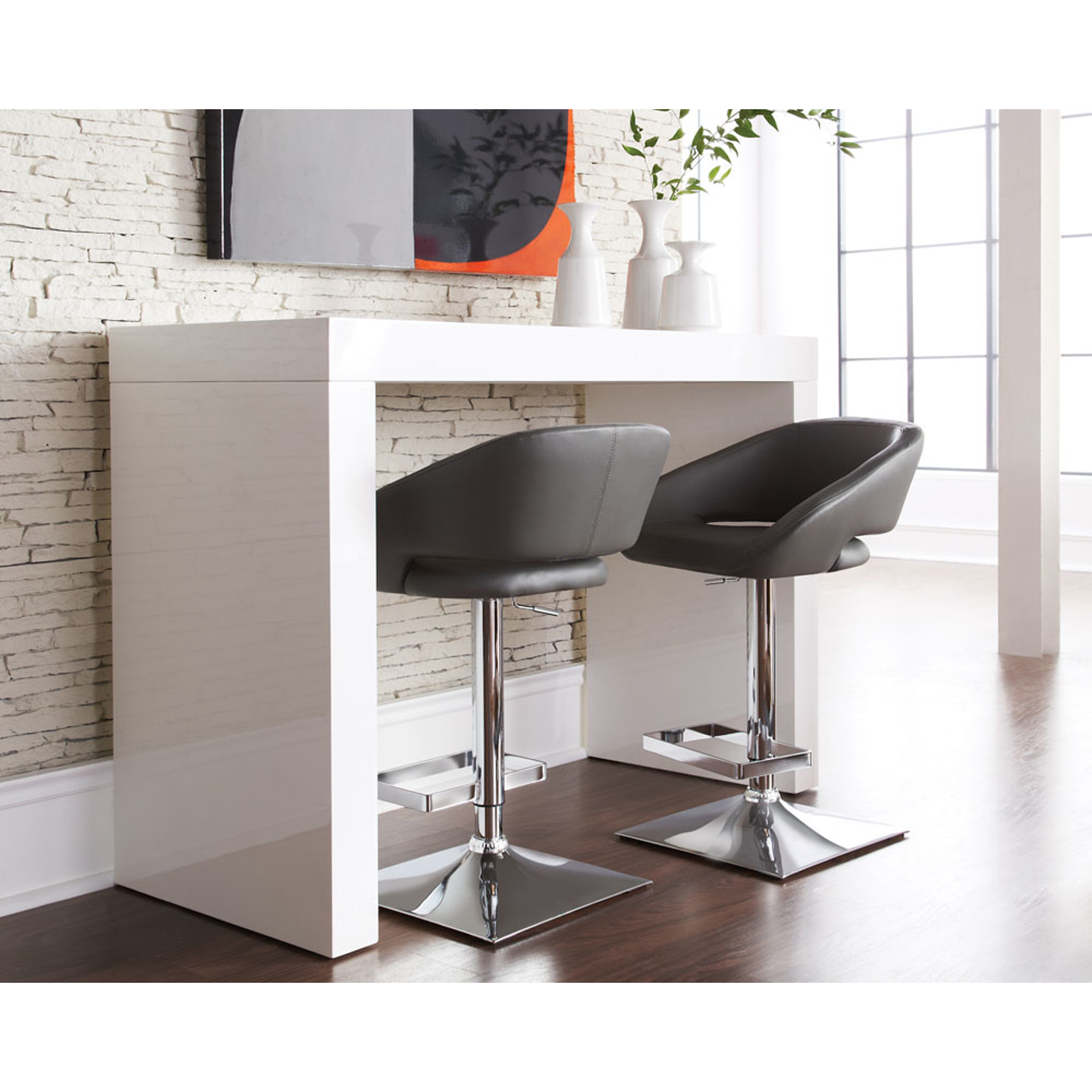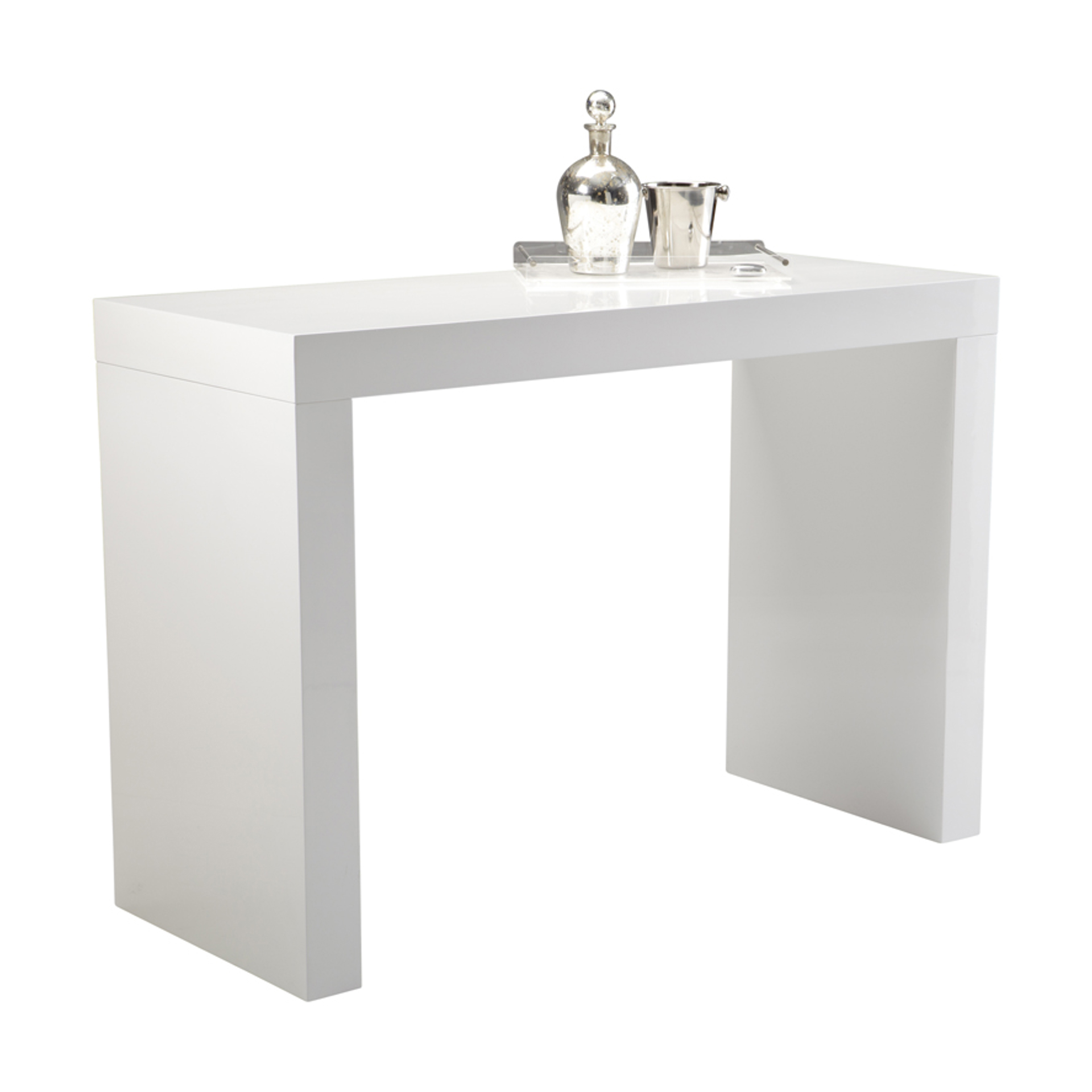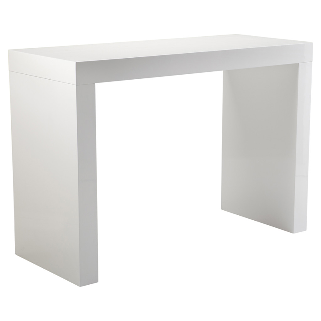 Table à hauteur de bar avec place pour deux tabourets. Superbe finition blanche brillante. Également disponible en noir.