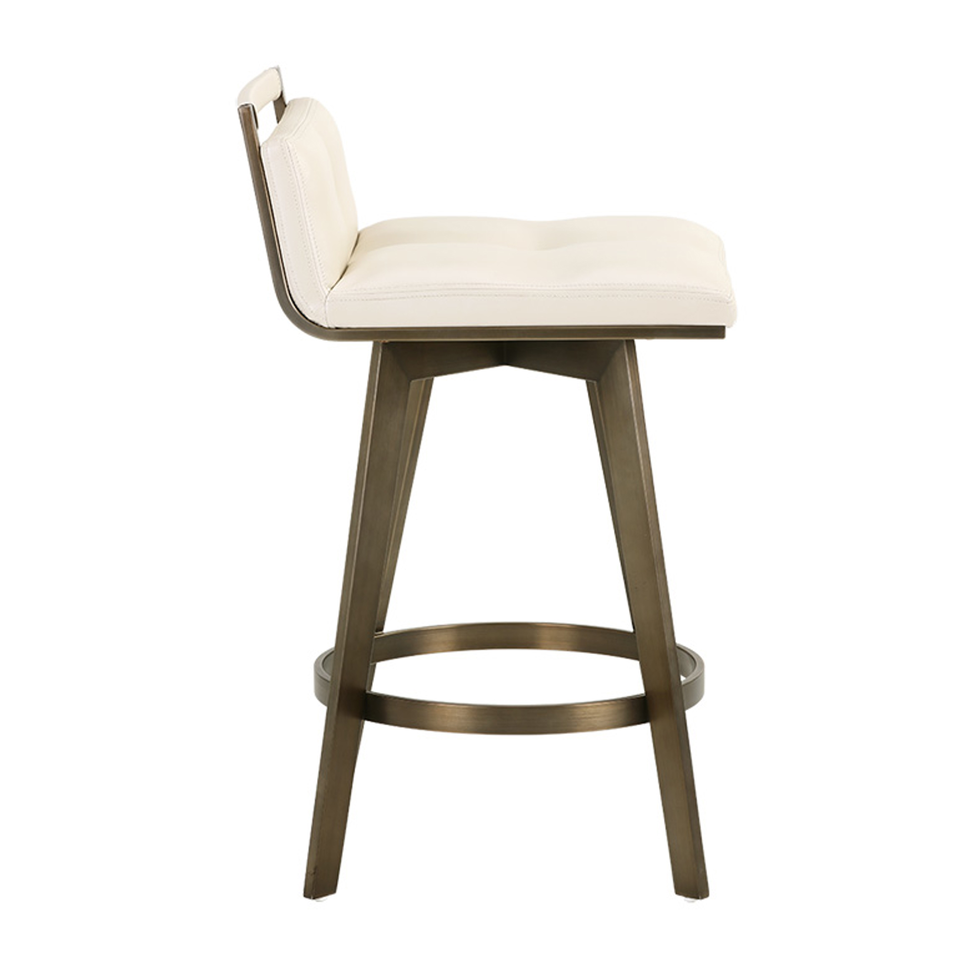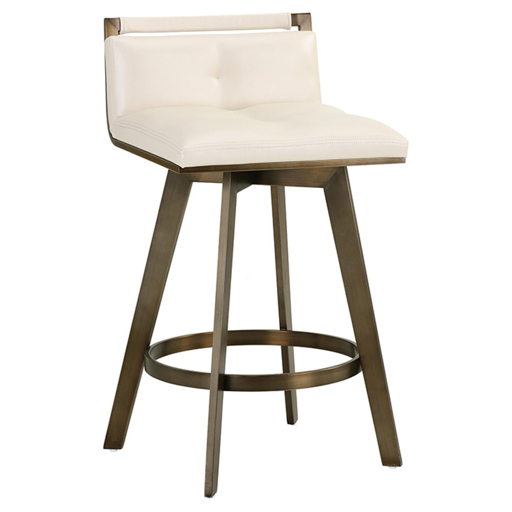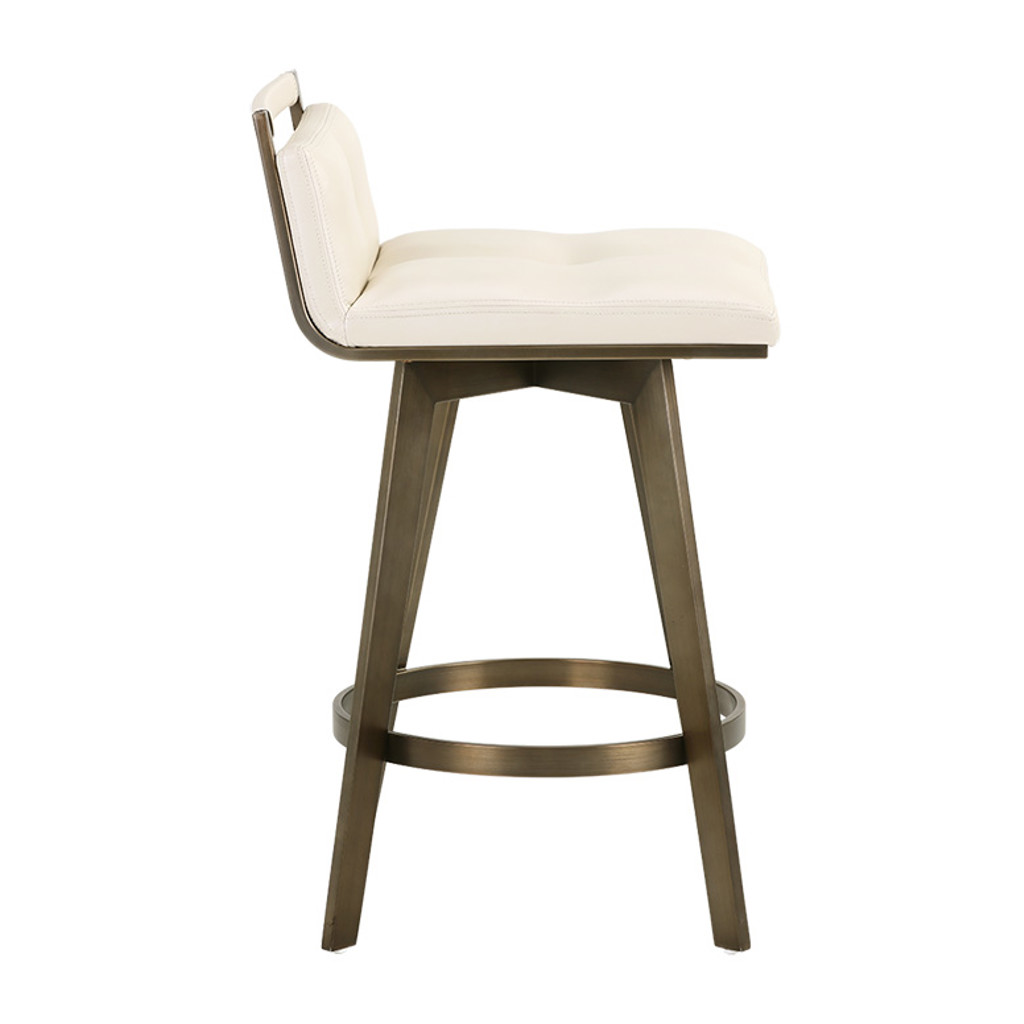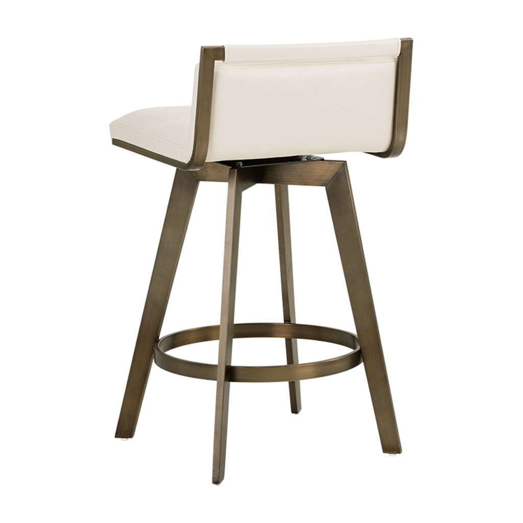 Un élégant tabouret de comptoir pivotant inspiré de l'Art Déco avec un dossier de siège bas de notre collection Ikon. Comprend un cadre et des pieds partiellement exposés en acier inoxydable avec une finition en laiton antique. Le pivot comprend un pivot à 360 degrés avec un retour à 180 degrés.