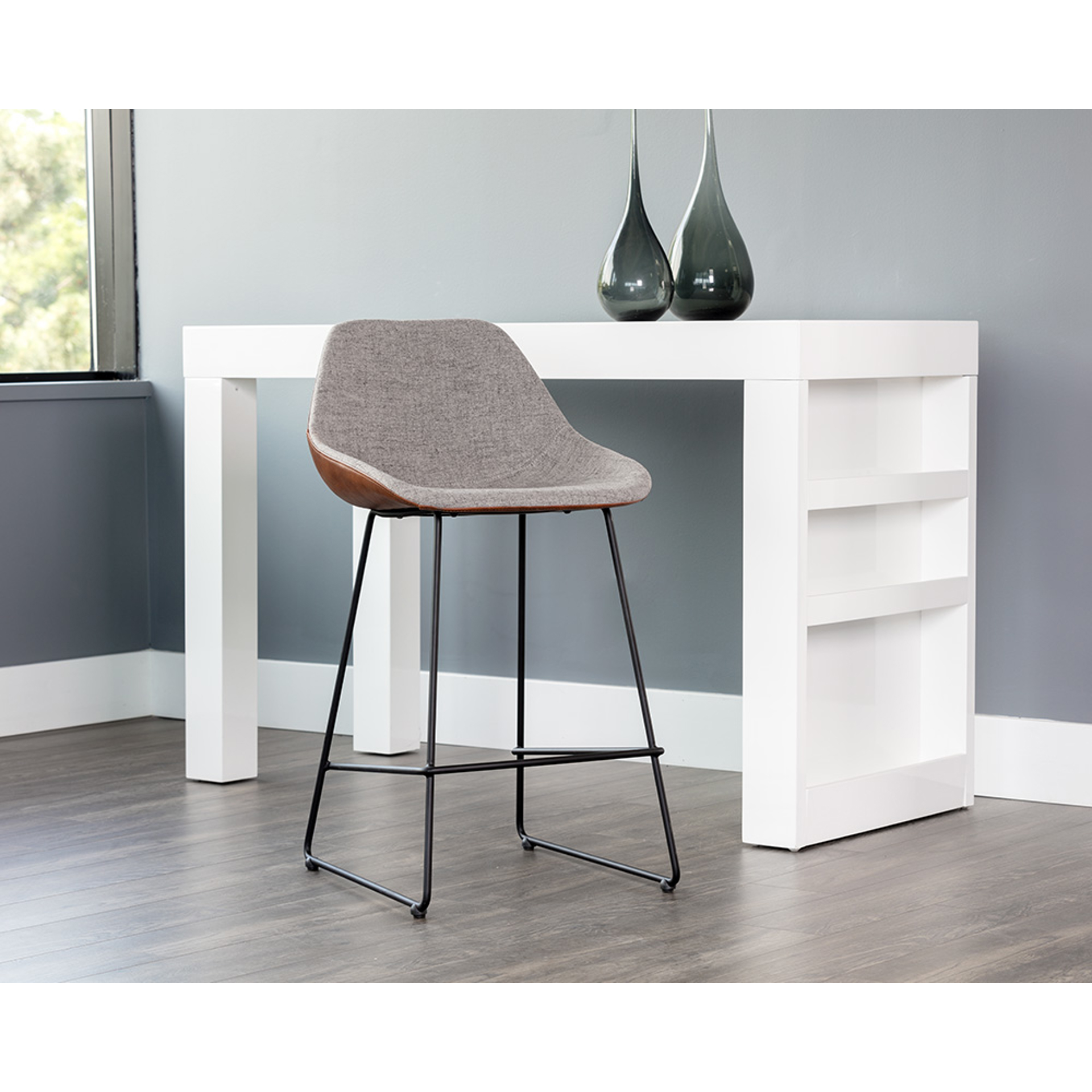Ce tabouret de comptoir de notre collection dégage un charme masculin. Comprend un siège sculpté bicolore en tissu gris novembre avec un extérieur en similicuir brun cannelle. Les pieds effilés en acier noir créent un look lumineux et aéré. Également disponible avec un siège en tissu gris novembre et un extérieur en similicuir noir Nightfall. Convient à divers espaces de restauration, de cuisine et de bar de toutes tailles.