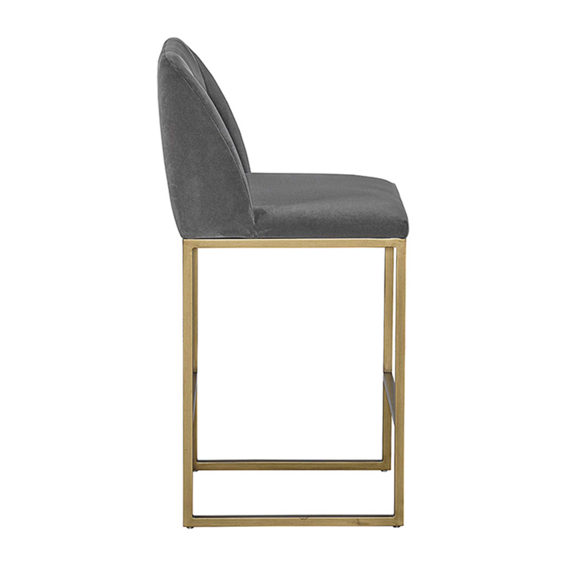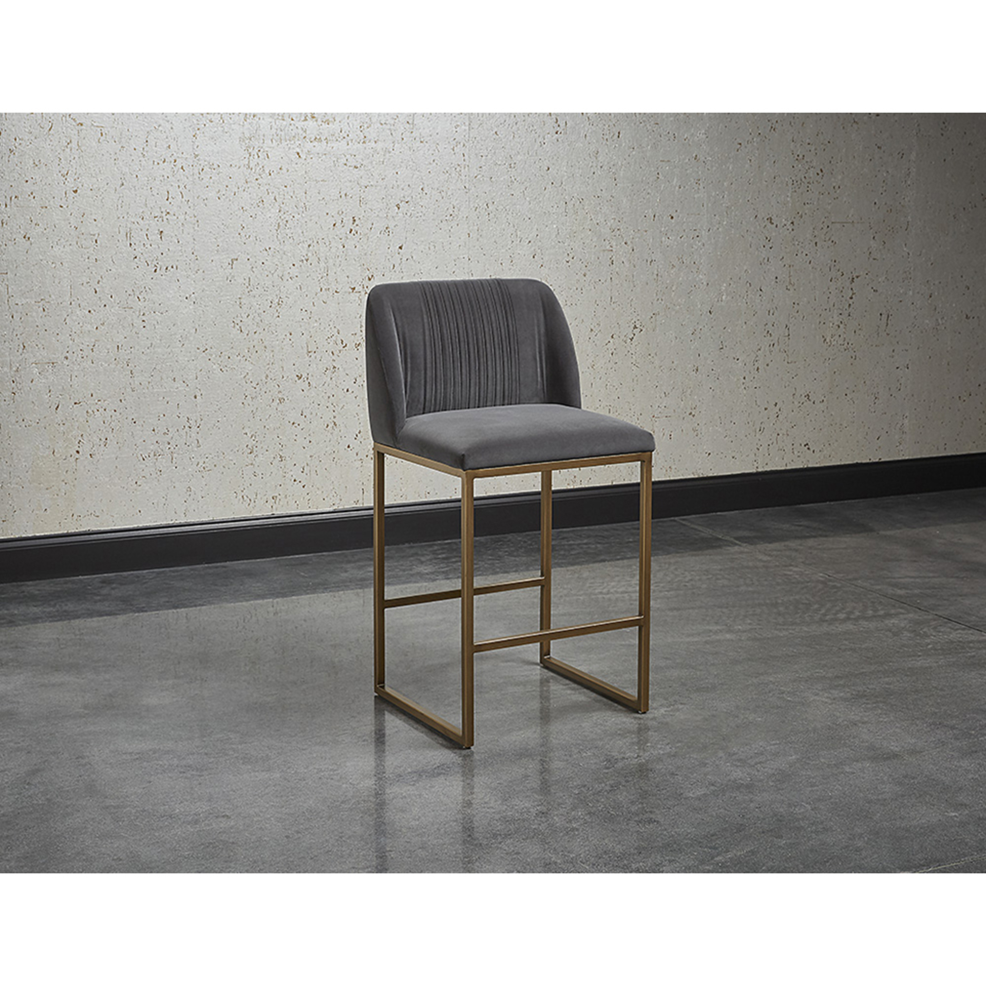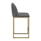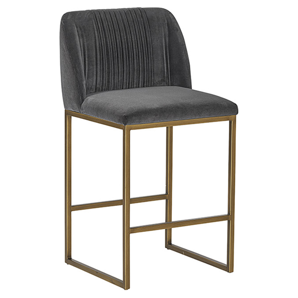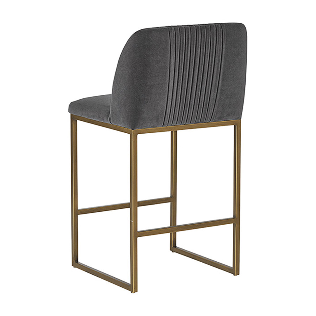 Un tabouret de comptoir transitionnel offre style et confort. Comporte des fronces délicates sur le dossier arrondi et des pieds en laiton antique exposés. Disponible en tissu bleu saphir, gris ombre et tissu de performance en mousseline. Le tissu de performance est hydrofuge, résistant aux taches et facile à nettoyer. Convient à divers espaces de restauration, de cuisine et de bar de toutes tailles.