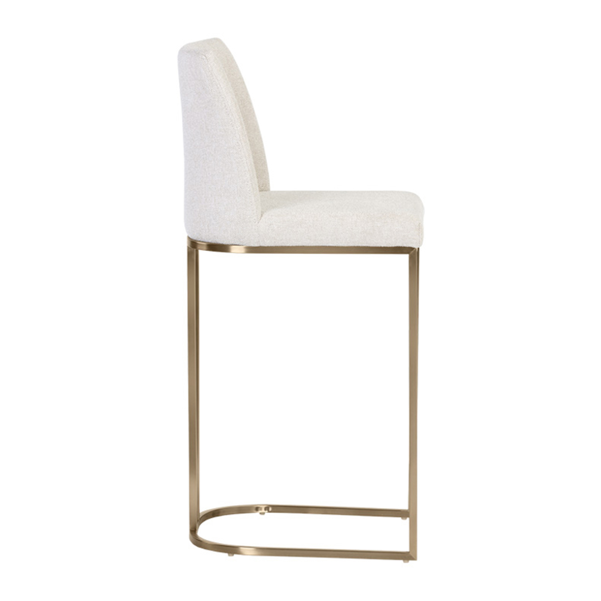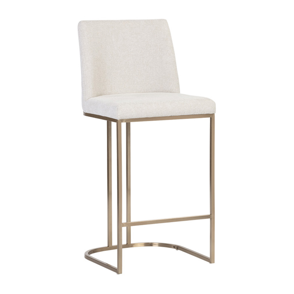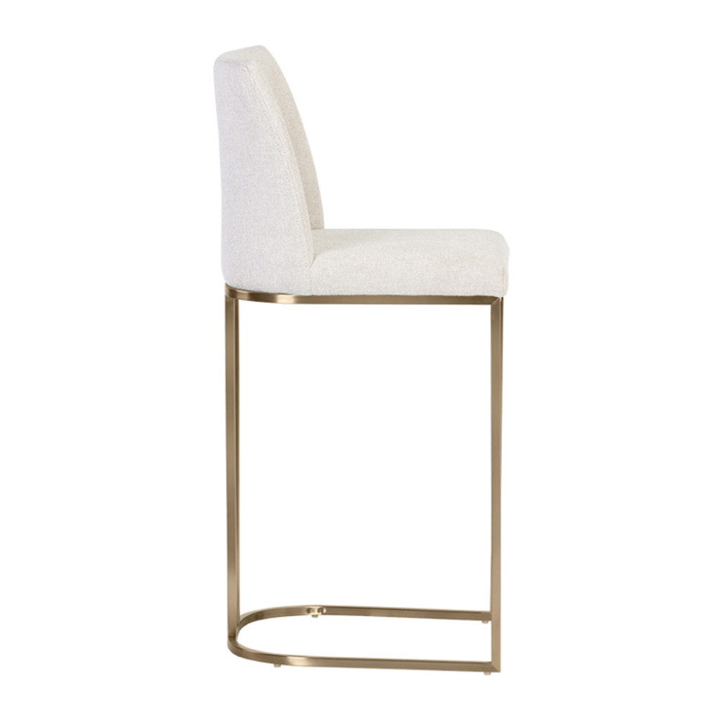 Un élégant tabouret de comptoir en porte-à-faux conçu avec un tissu d'avoine de Belfast doux et texturé et un cadre en acier inoxydable en laiton antique exposé.