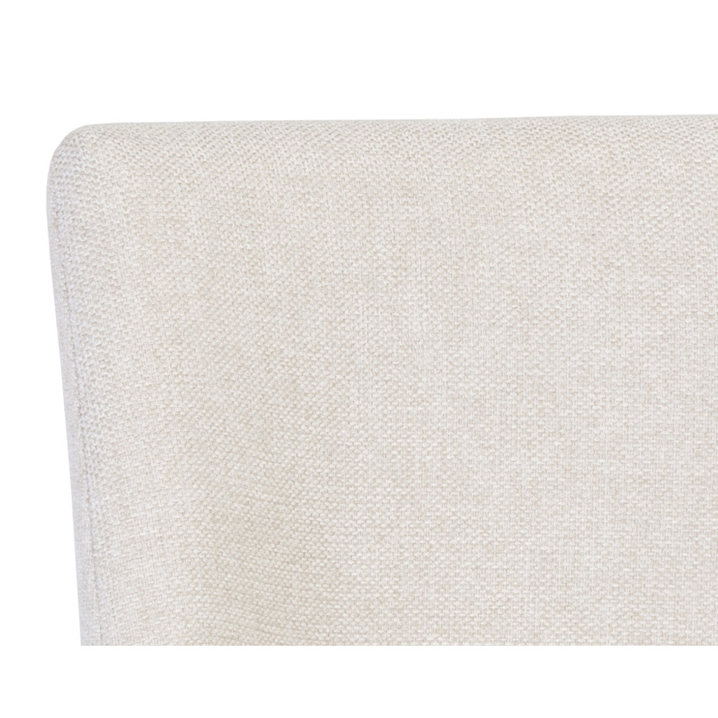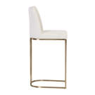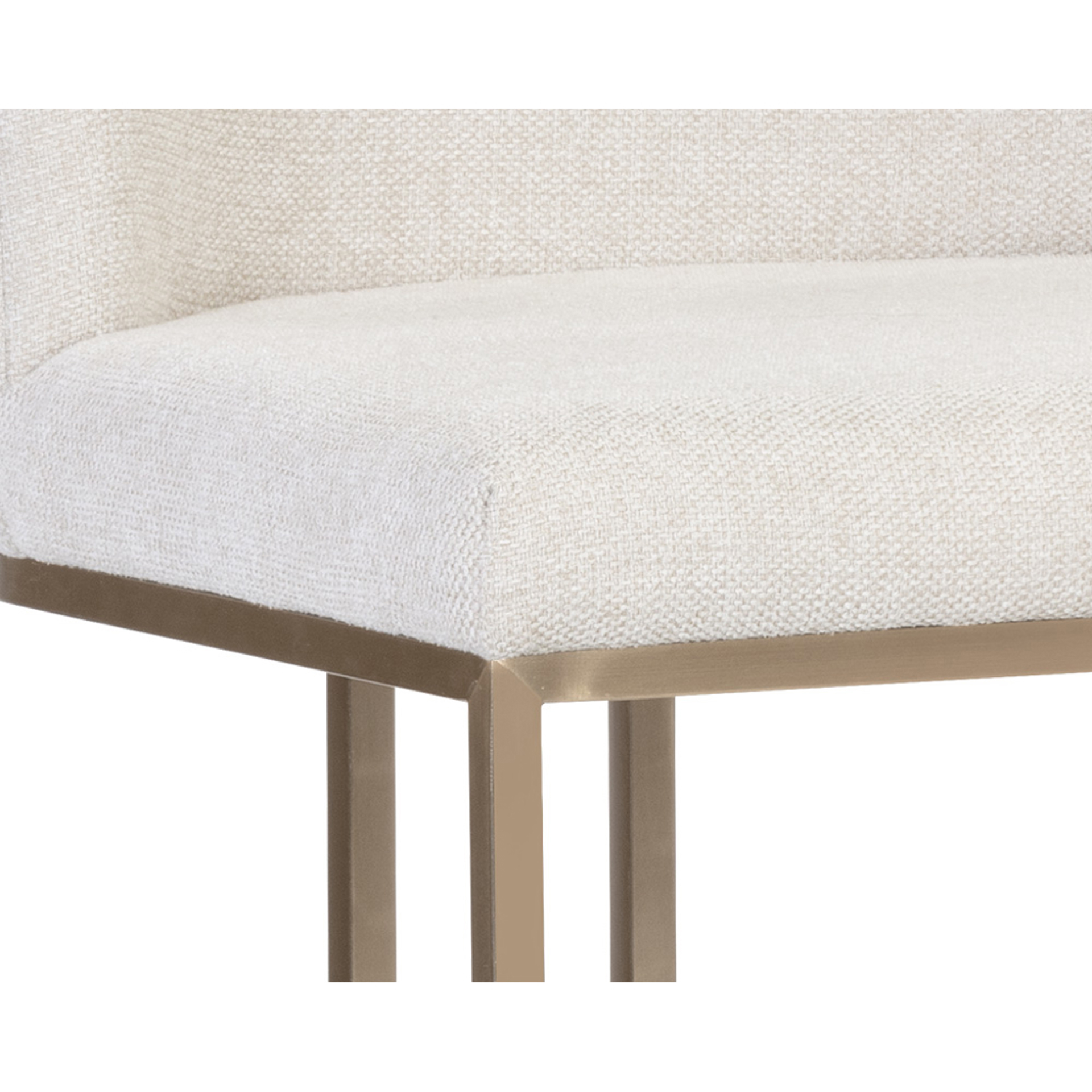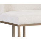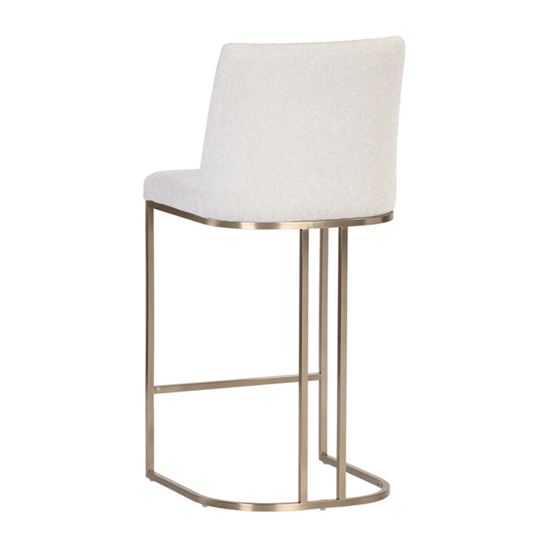 Un élégant tabouret de comptoir en porte-à-faux conçu avec un tissu d'avoine de Belfast doux et texturé et un cadre en acier inoxydable en laiton antique exposé.