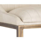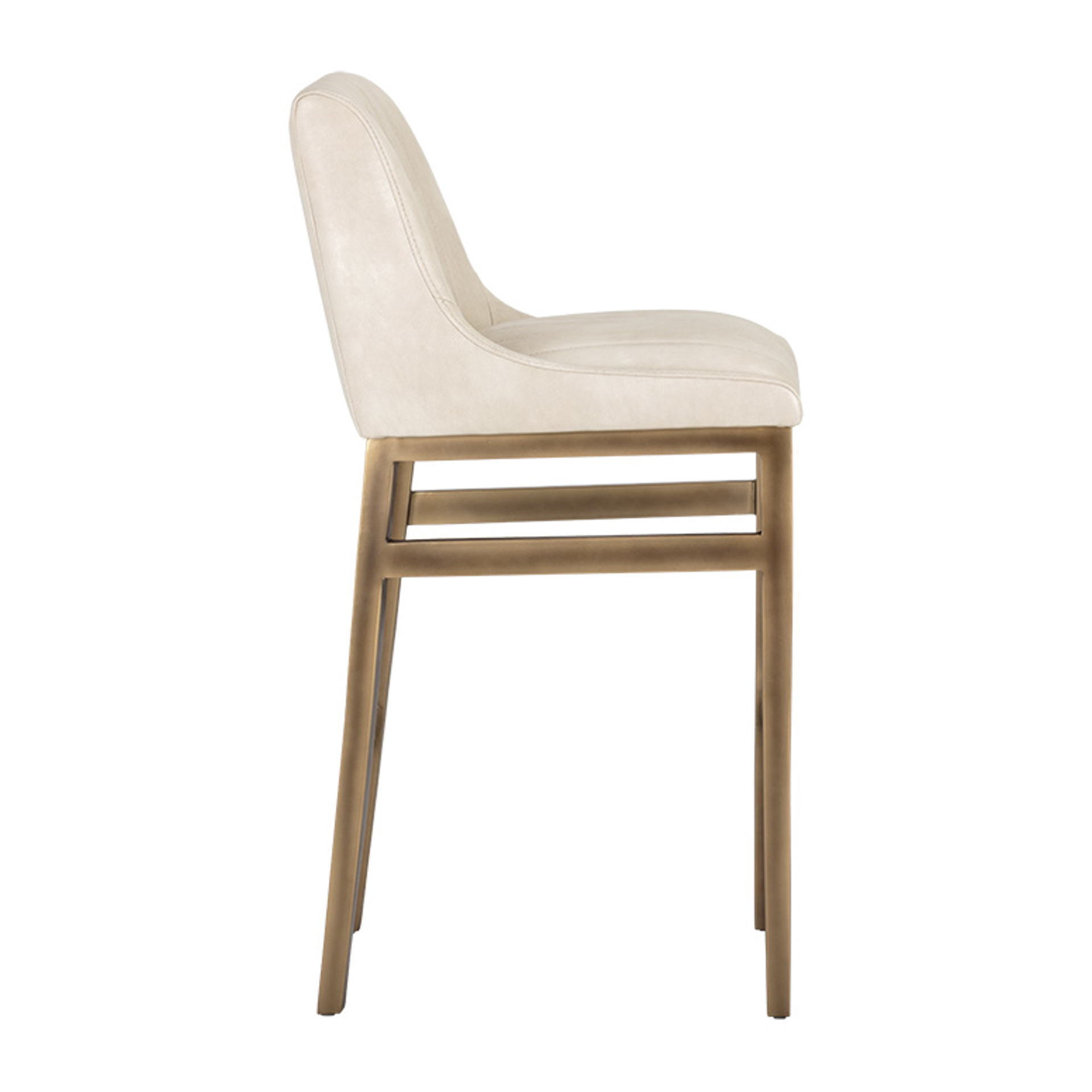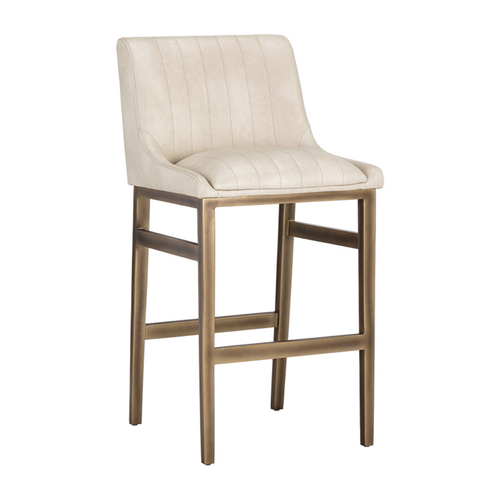 Un tabouret au design urbain avec un capitonnage audacieux à canaux verticaux sur l'assise et le dossier en faux cuir. Fini avec un cadre et des civières en acier bronze rustique. Idéal pour les environnements résidentiels et commerciaux. Convient à divers espaces de restauration, de cuisine et de bar de toutes tailles.