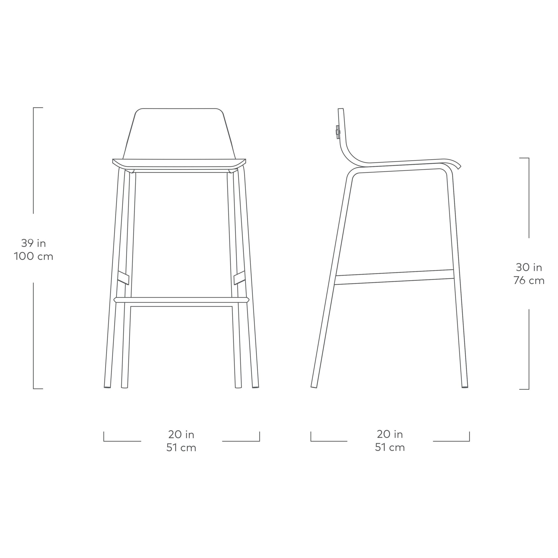 Le tabouret de bar Lecture est une réinterprétation moderne d'une conception classique de chaise d'école primaire, adaptée à une utilisation à hauteur de bar. La conception comprend un siège et un dossier monobloc en contreplaqué courbé, avec une poignée fonctionnelle en cuir et en laiton. Les pieds en acier enduit de poudre noire sont renforcés par des stabilisateurs à barre plate robustes et un repose-pieds ergonomique simple. Le tabouret de bar Lecture allie confort, design et durabilité. Disponible en noir, noyer ou frêne.