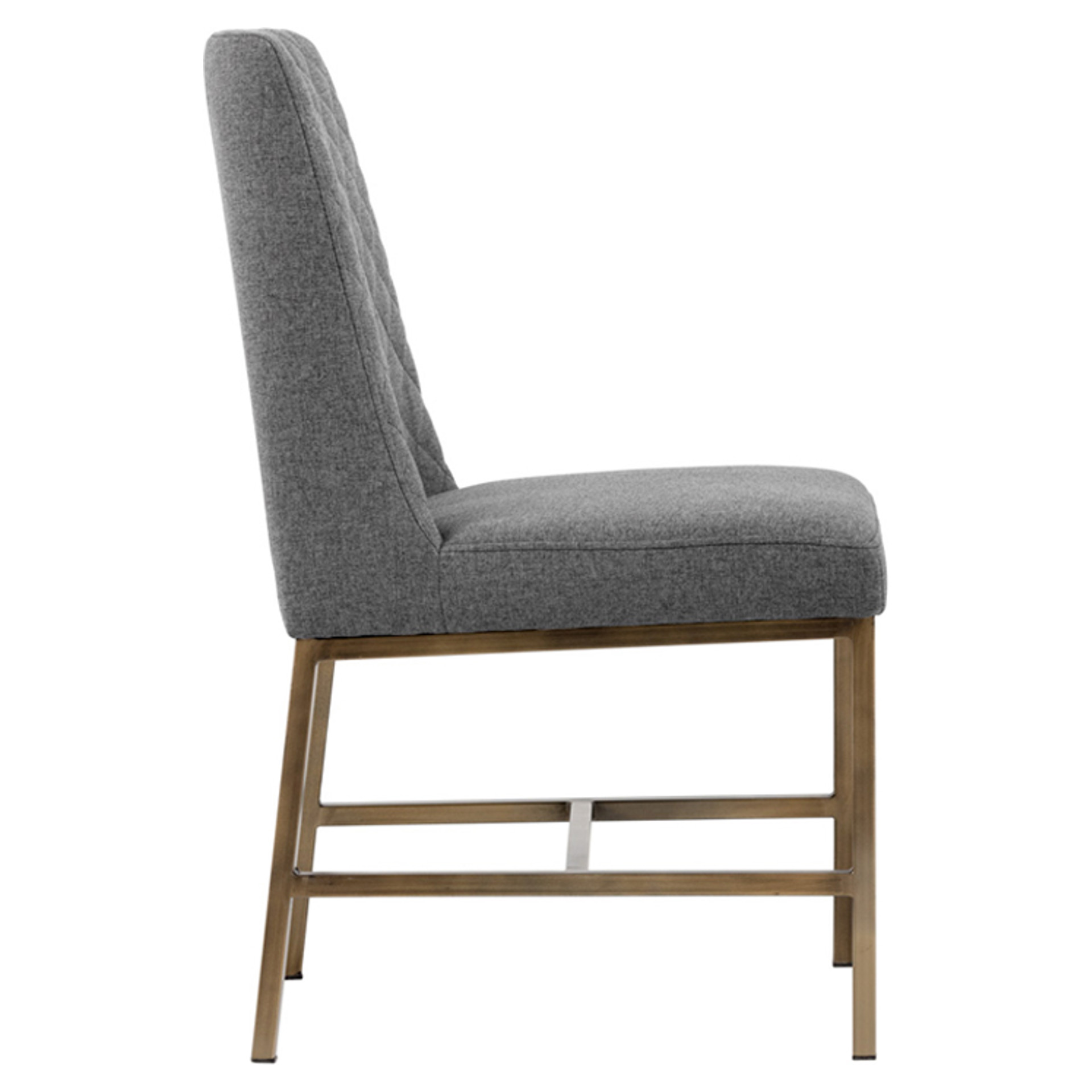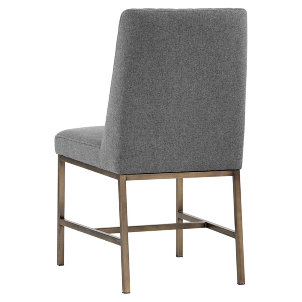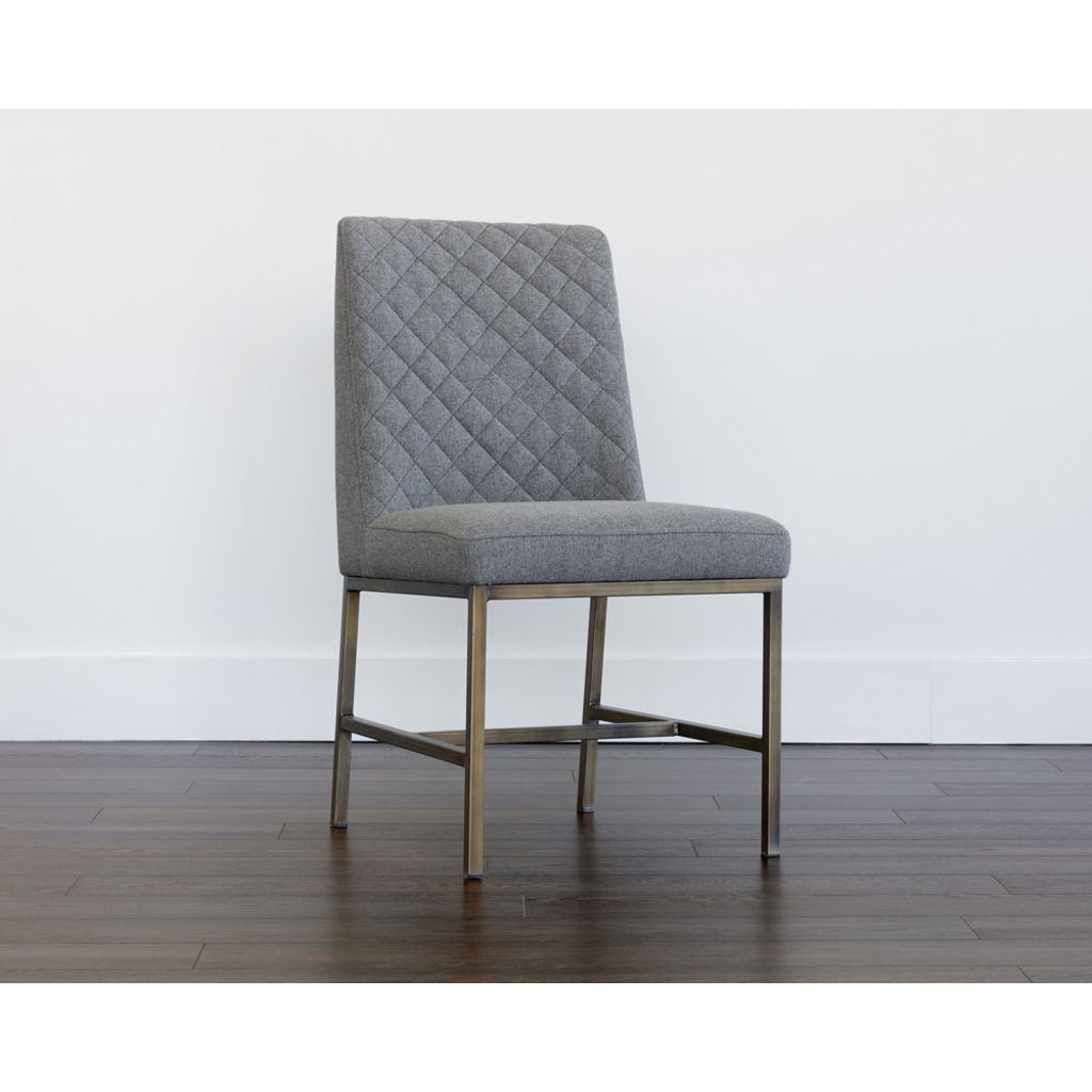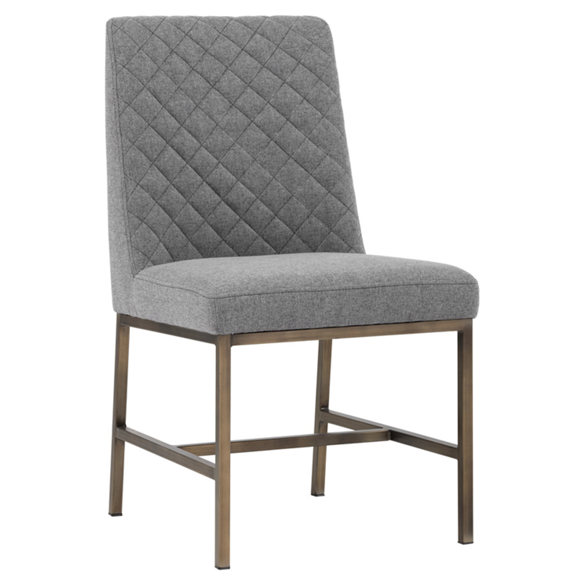 Revigorez les espaces de salle à manger de transition avec cette chaise de salle à manger de notre collection 5West. Comprend de belles coutures en diamant sur l'arrière du dossier et un cadre en acier en laiton antique.