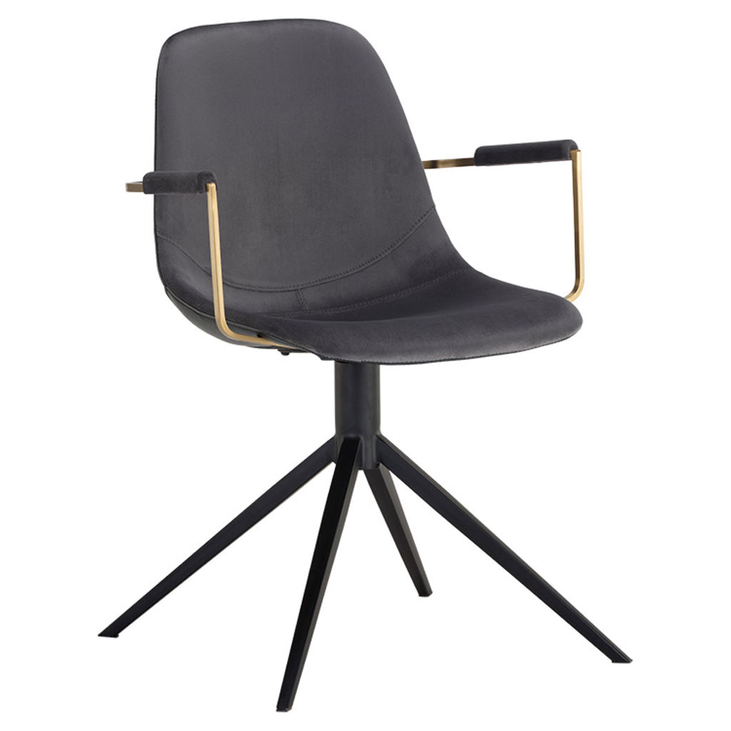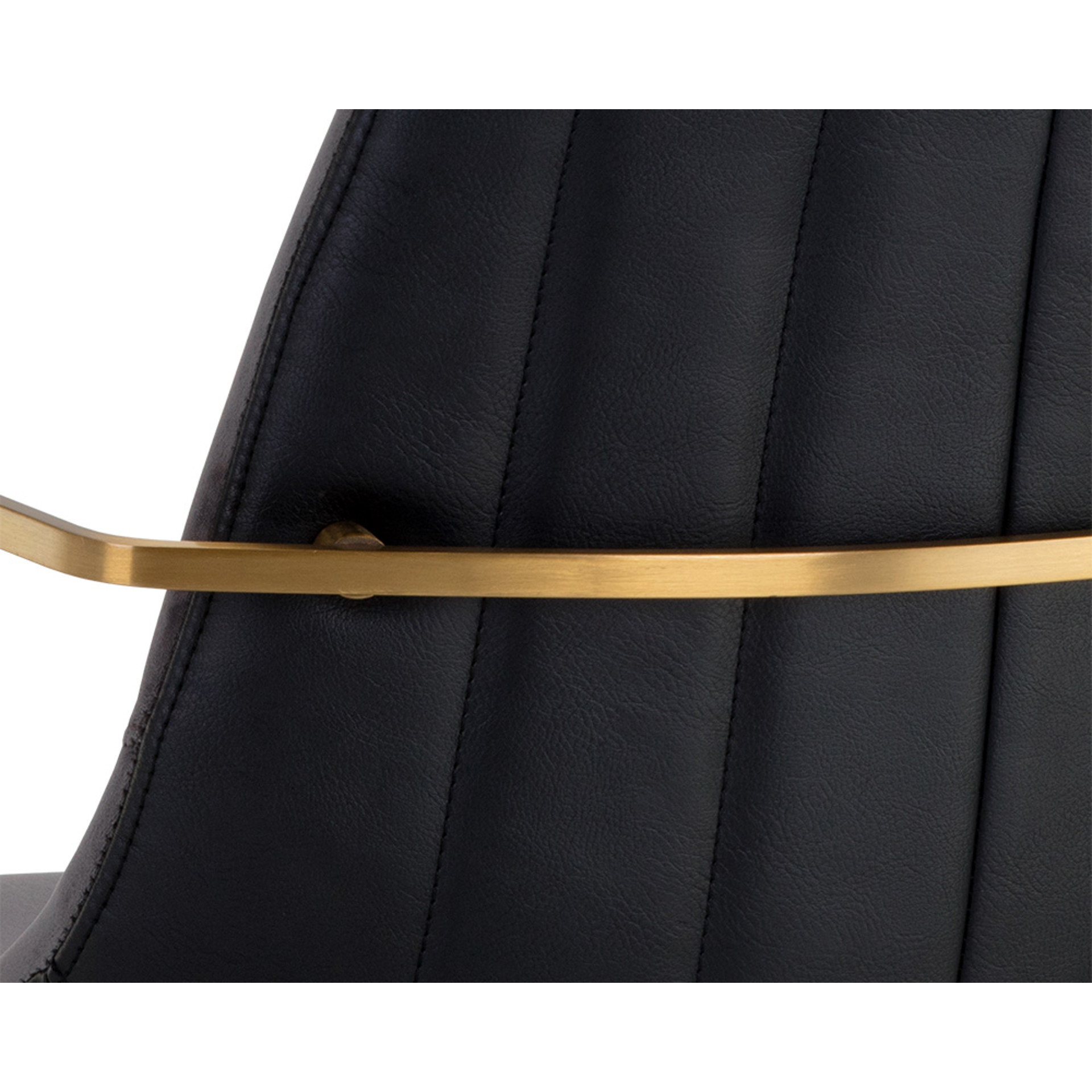 Découvrez le parfait équilibre entre confort et sophistication avec cette chaise pivotante de la collection Cassius. Son revêtement en cuir synthétique gris premium s'harmonise élégamment avec les accents dorés de sa structure métallique, créant un contraste saisissant qui rehausse n'importe quel espace.