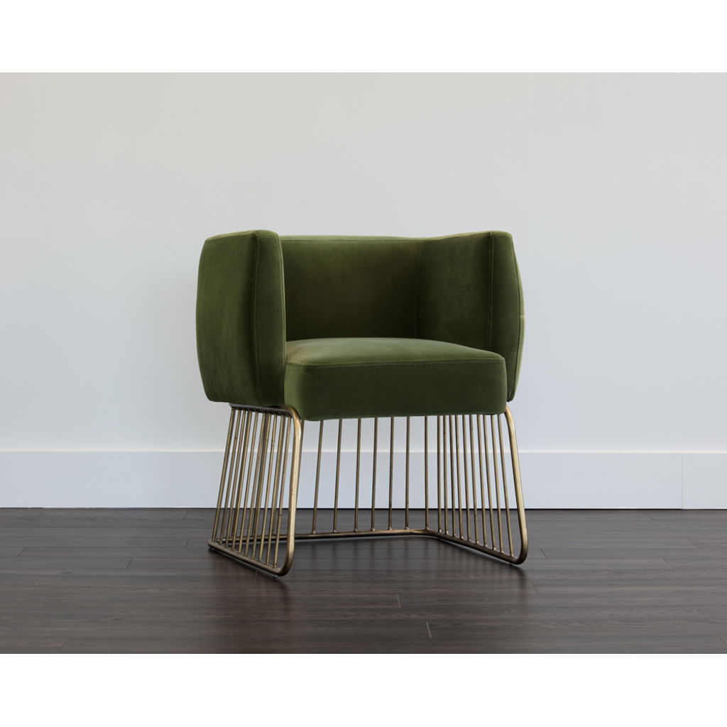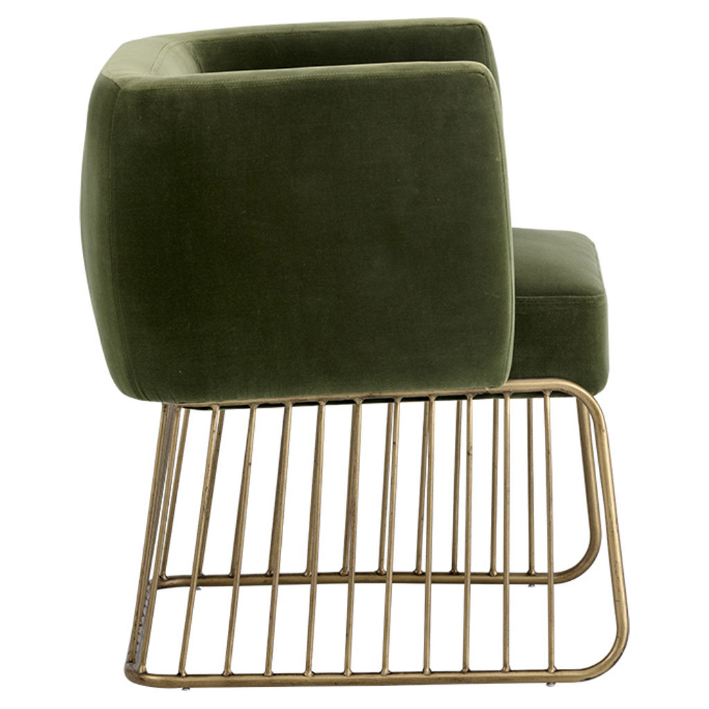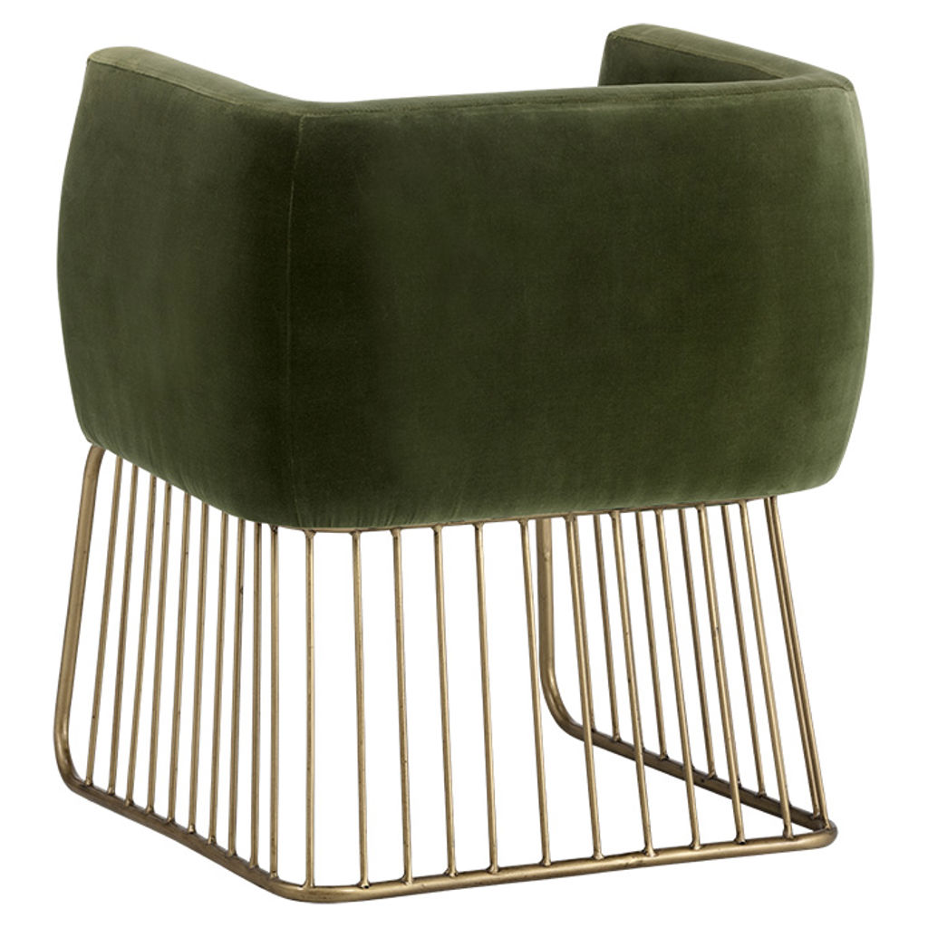 Le charme rustique et moderne se marient dans cette chaise de salle à manger de notre collection MIXT. Fabriquée dans notre tissu doux vert forêt et gris ombre avec un siège confortable et une base unique de style cage en laiton antique brossé. Parfaite pour les espaces de restauration, de salon et de bureau.