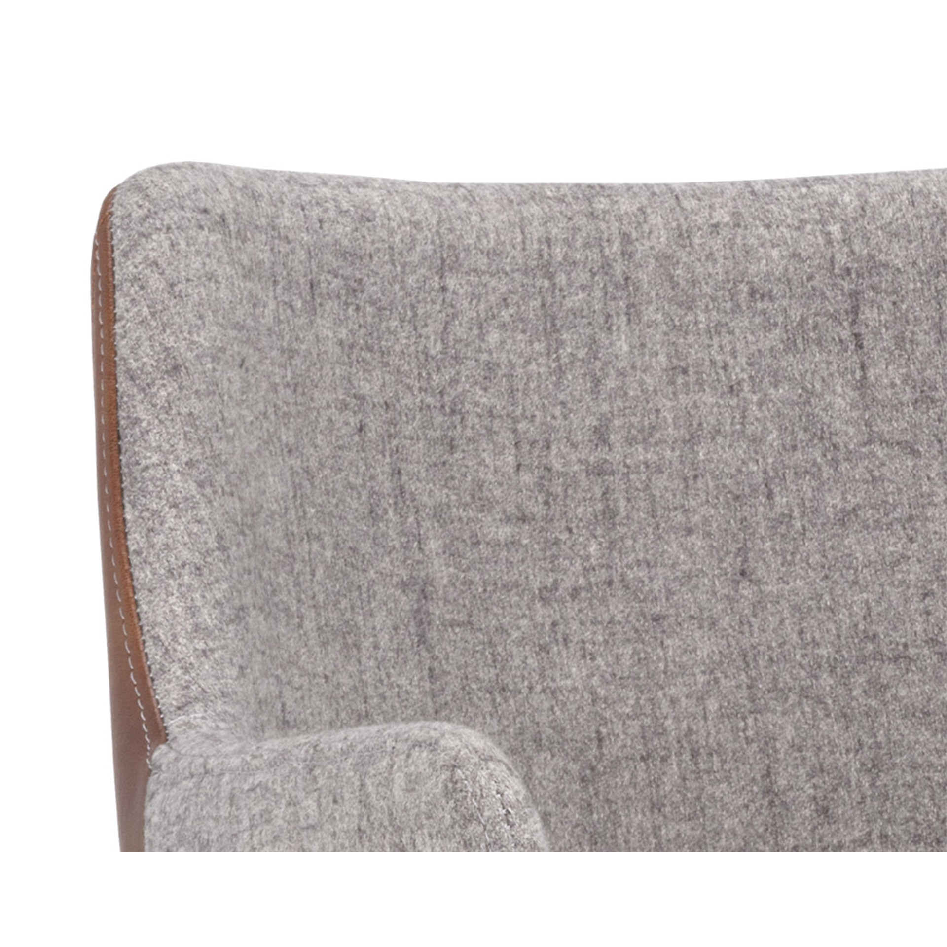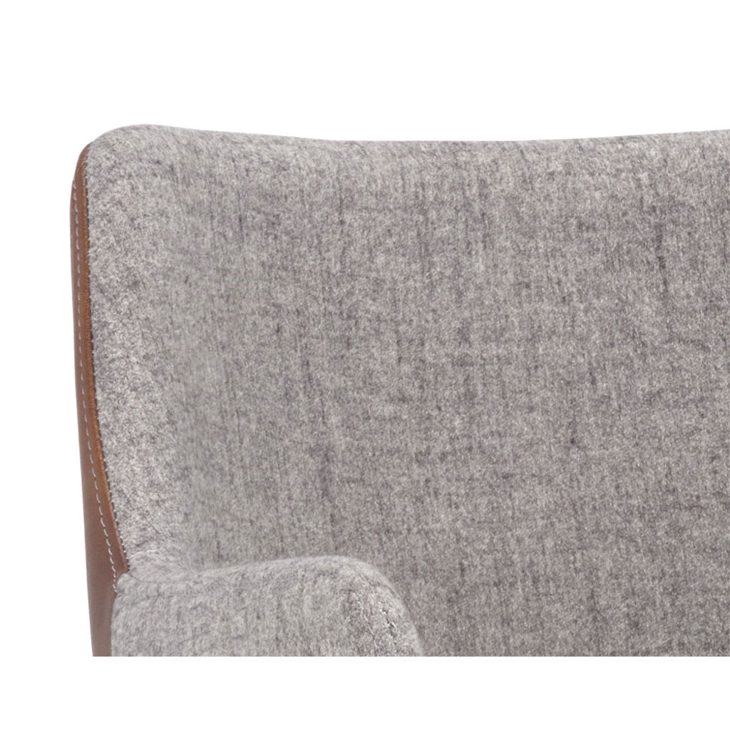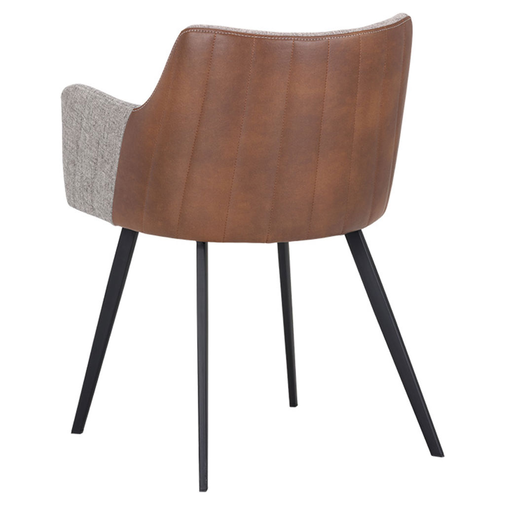 Cette cahise de salle à manger moderne apportera confort et style à tout espace résidentiel ou commercial. Comprend un siège intérieur en tissu gris November et un dossier de siège extérieur à coutures contrastantes en similicuir cognac bravo. Fini avec des pieds en fer enduits de poudre noire robustes.