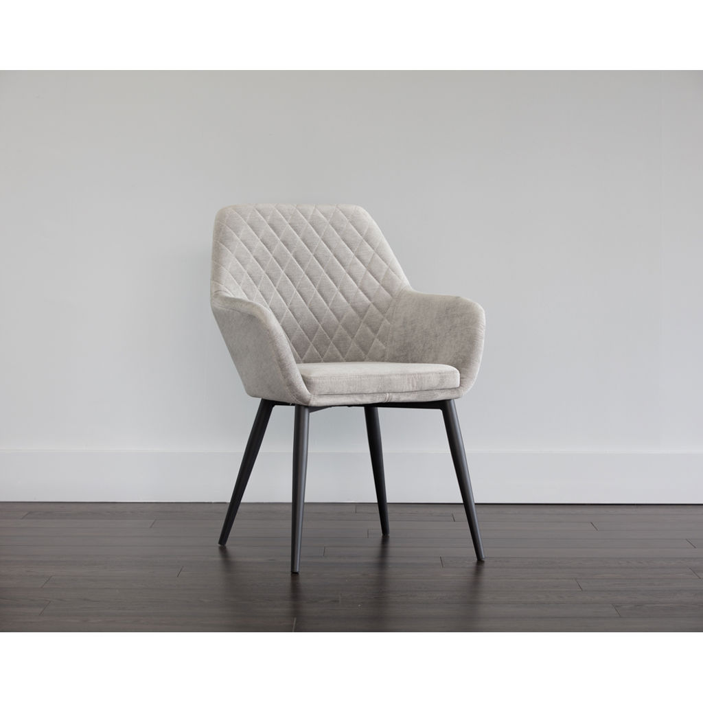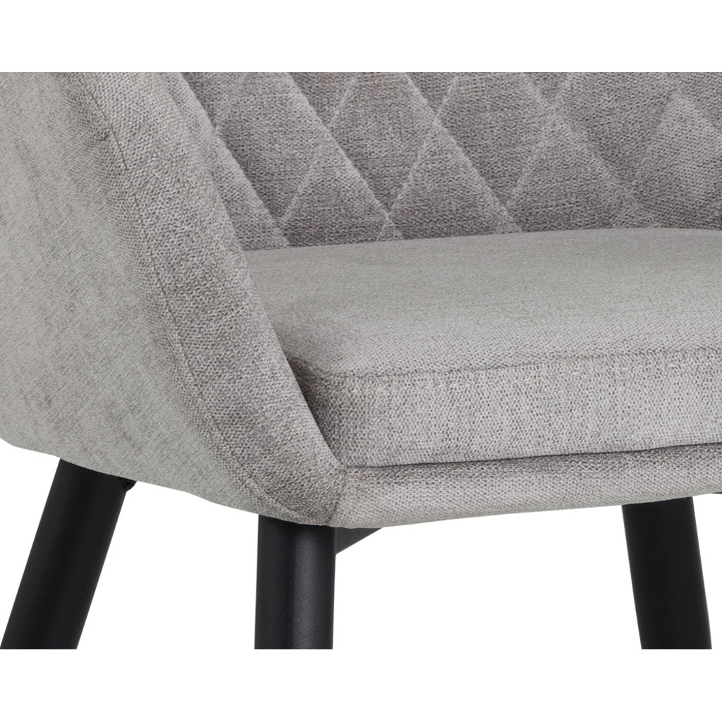 Un fauteuil de salle à manger chic et confortable de notre collection Urban Unity. Comprend un beau capitonnage en diamant sur le dossier. Fabriqué en tissu polo club stone avec pieds en acier noir brossé et en tissu en lin antonio avec pieds en acier brossé or.