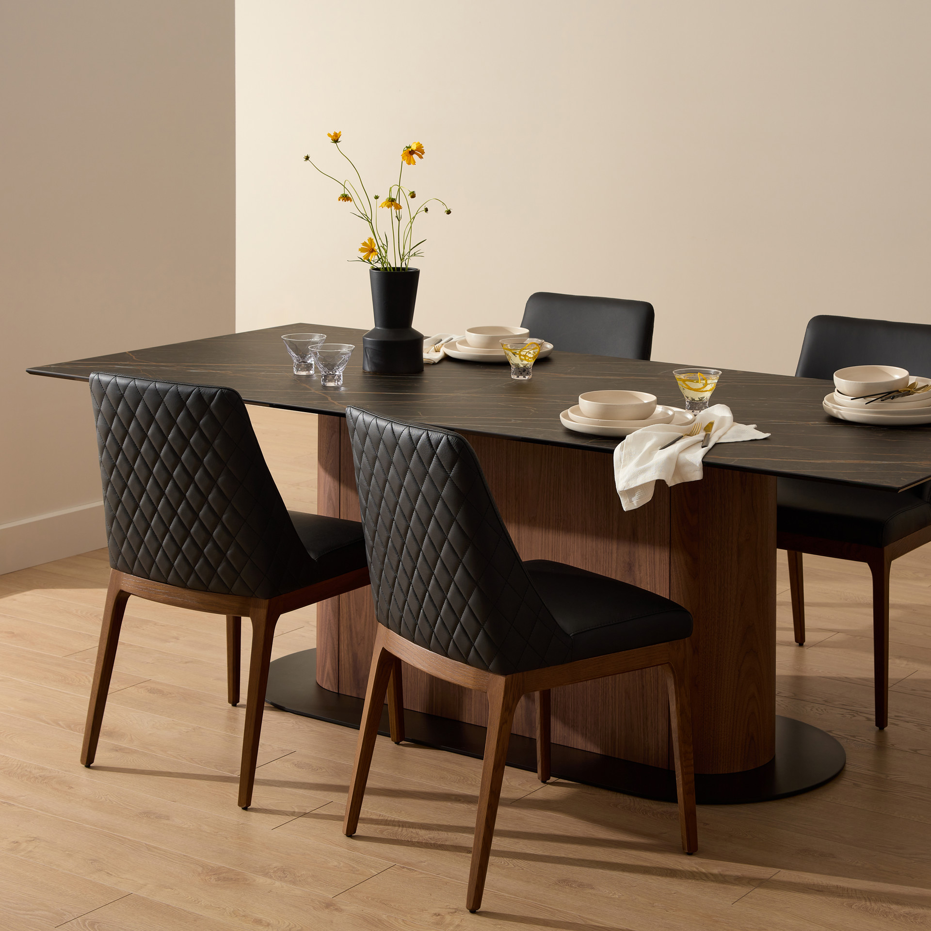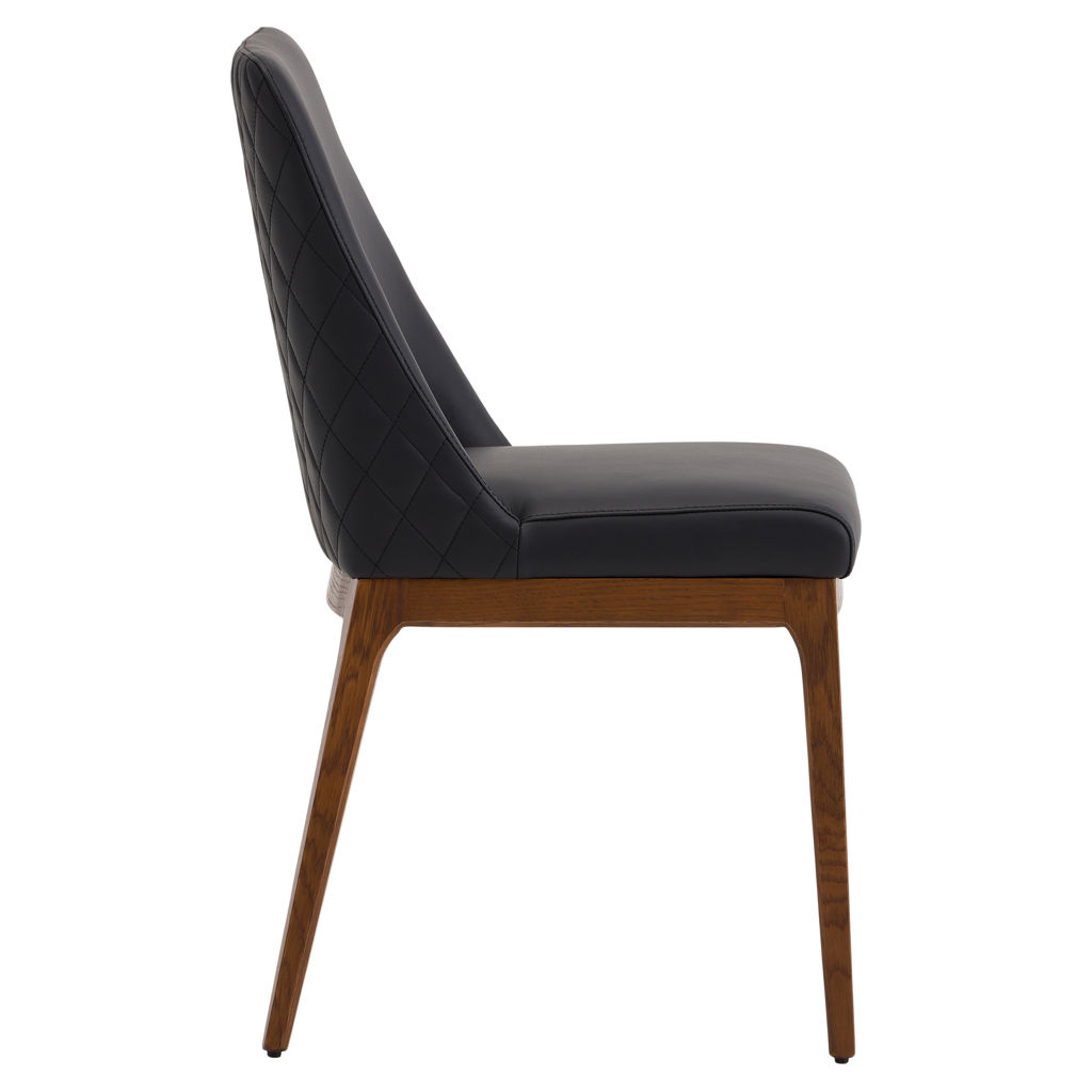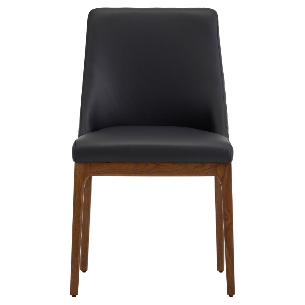 Transformez votre espace repas avec la chaise Gigi, où le raffinement rencontre le confort. Son cuir véritable noir aux surpiqûres diamant apporte une touche de luxe discret, tandis que sa structure en bois naturel réchauffe l'ensemble.