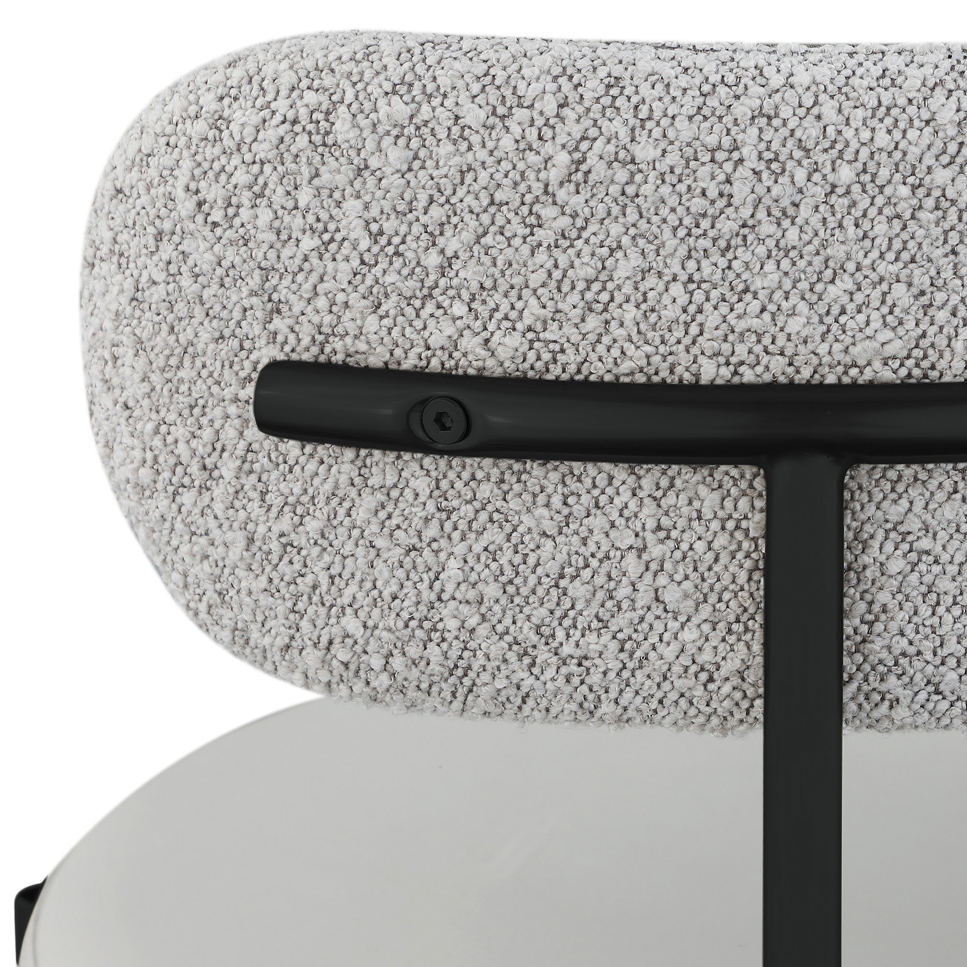 Le siège est recouvert de similicuir pour un look luxueux tandis que le dossier est recouvert d'un riche tissu bouclé taupe.