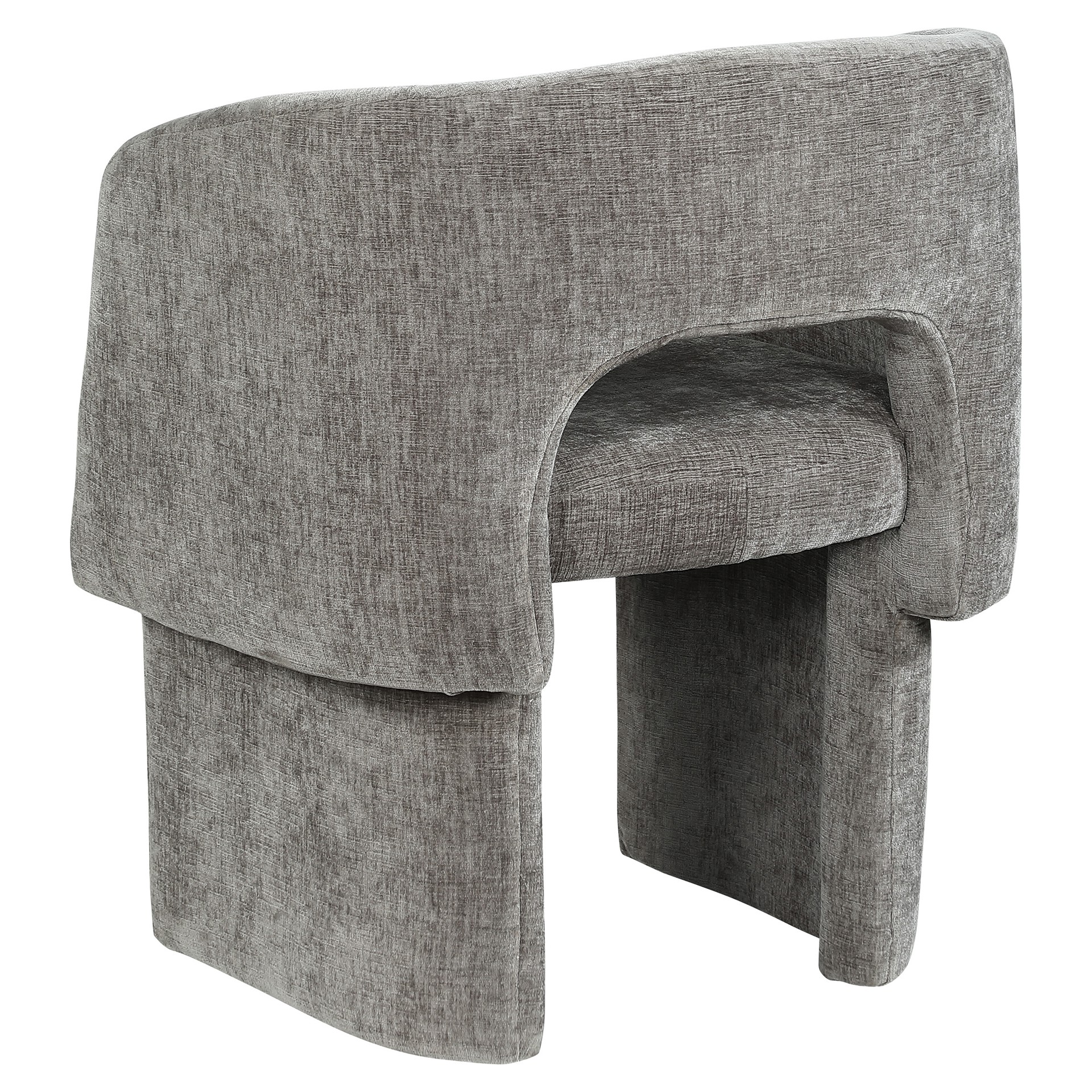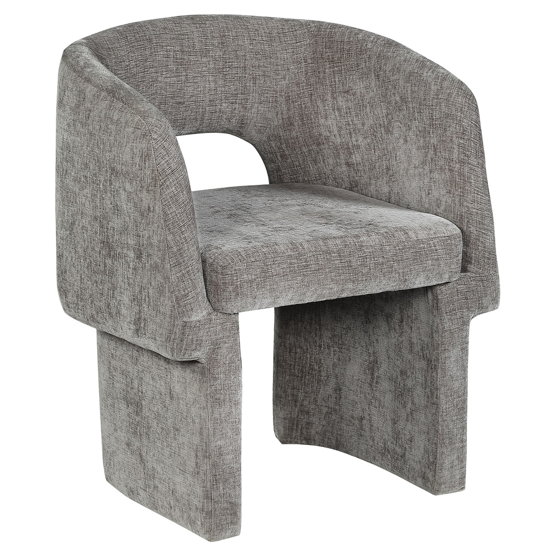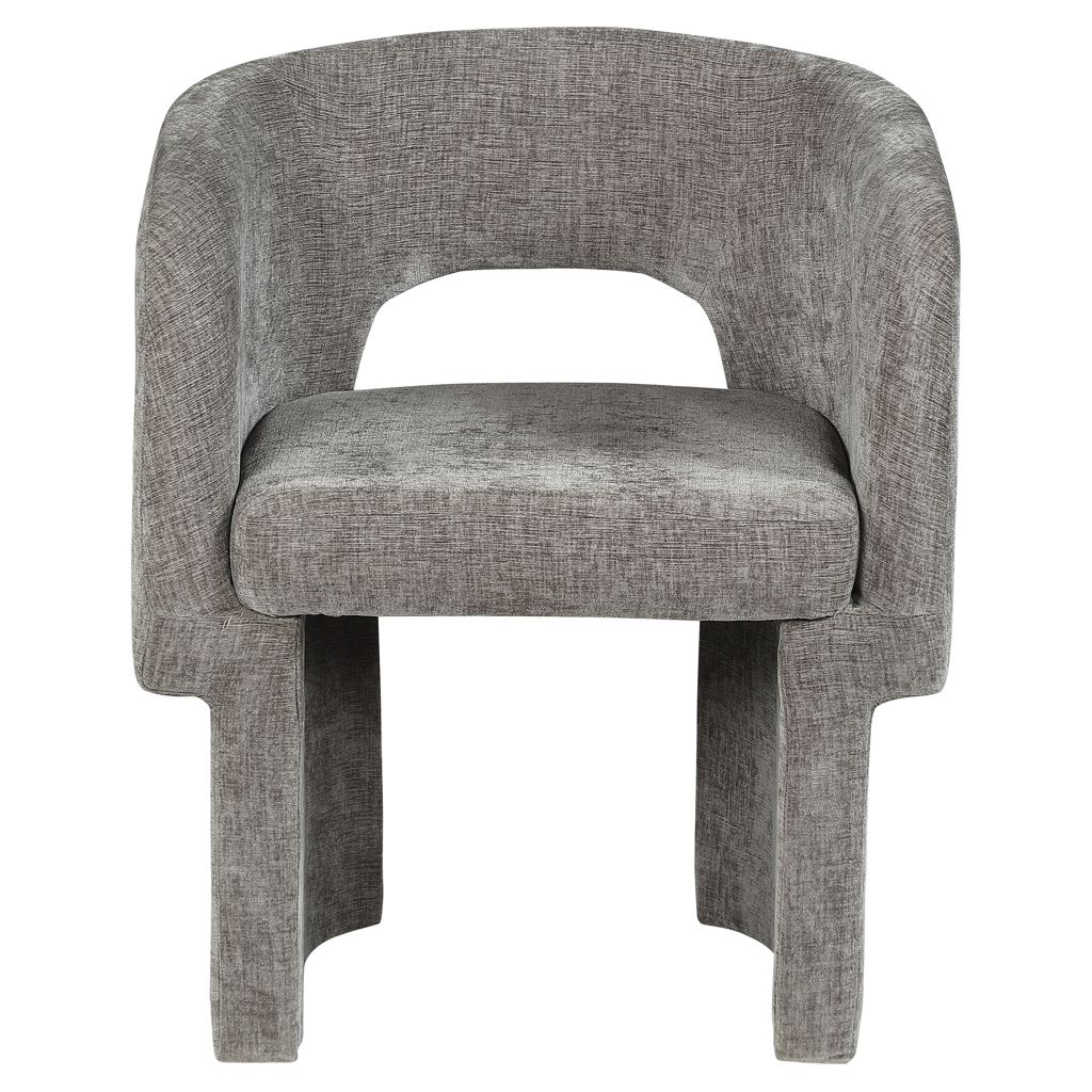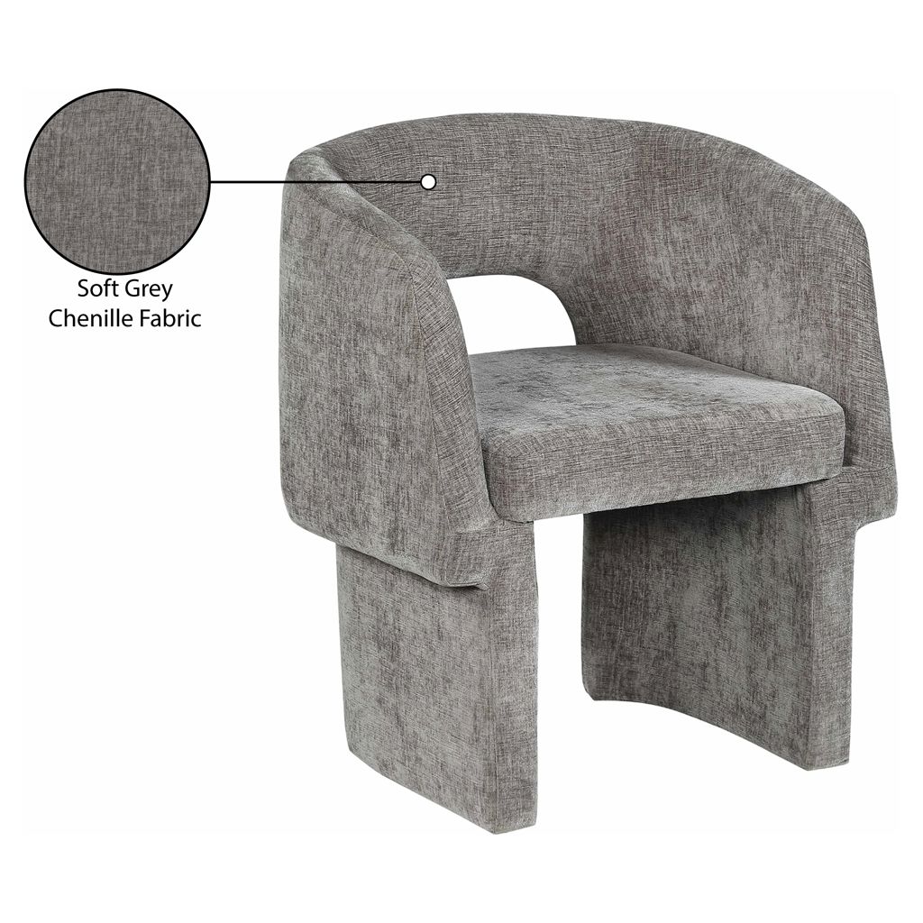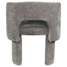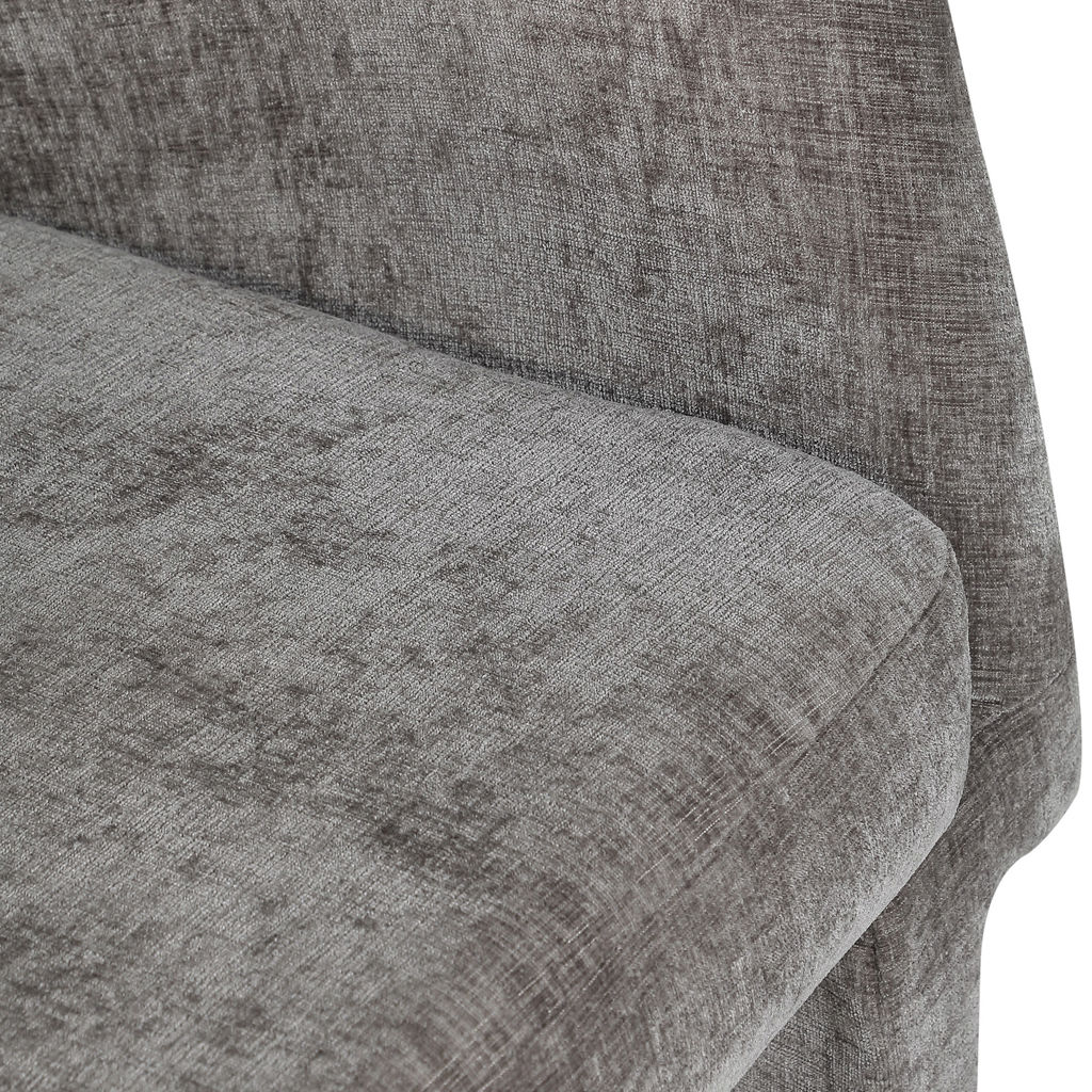 Le revêtement en tissu chenille gris riche recouvre cette chaise de haut en bas, lui conférant une sensation de luxe douce au toucher.