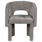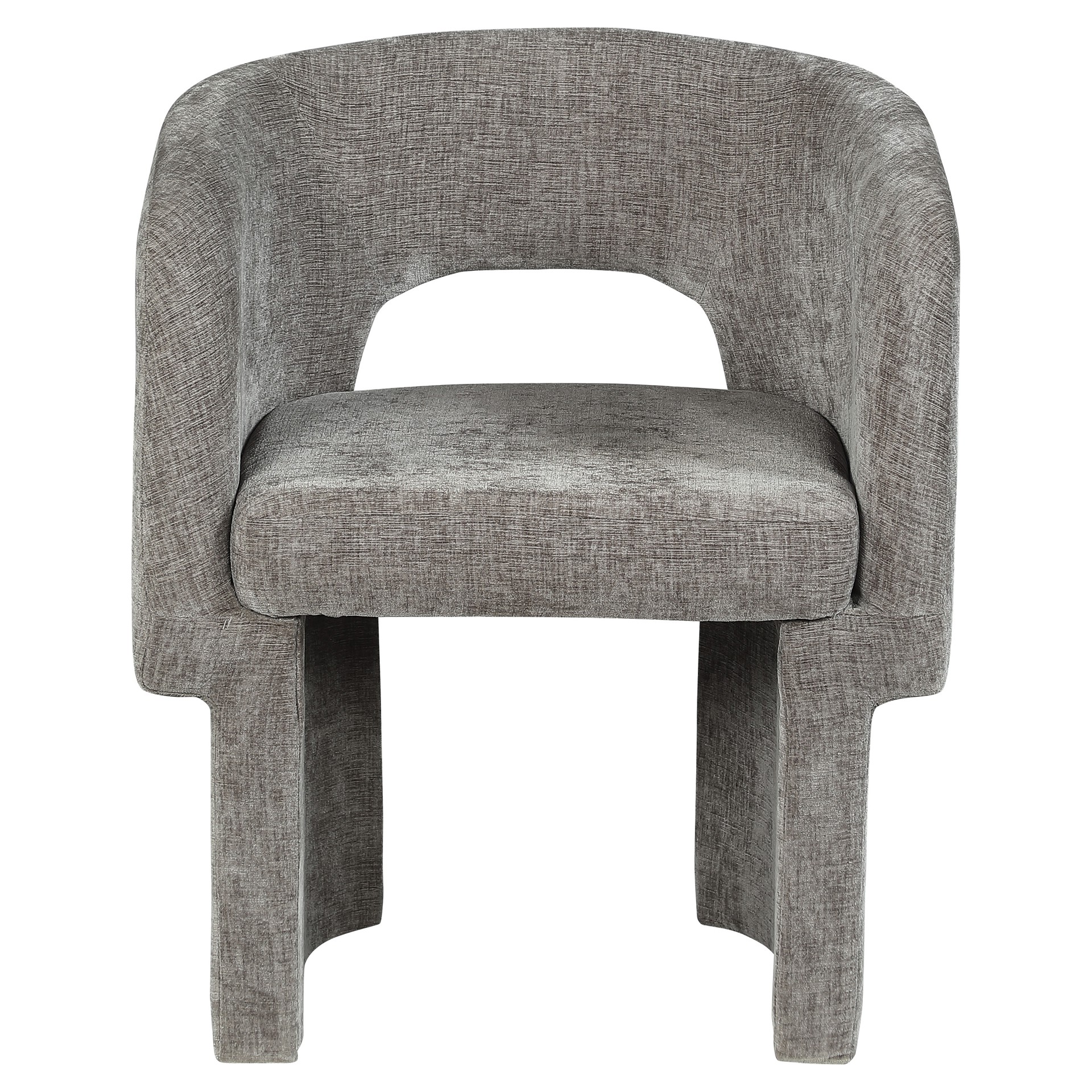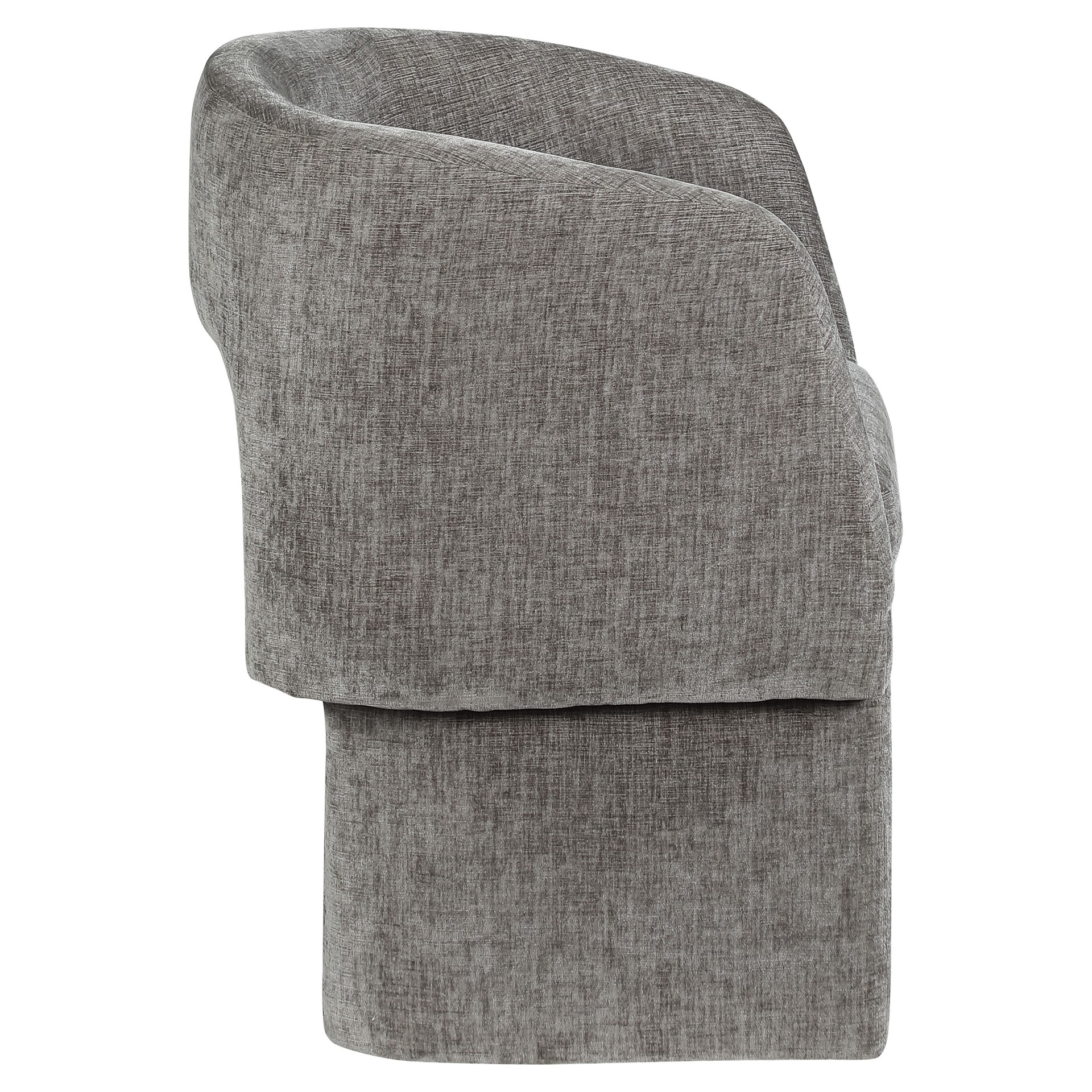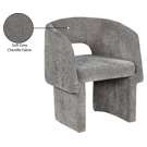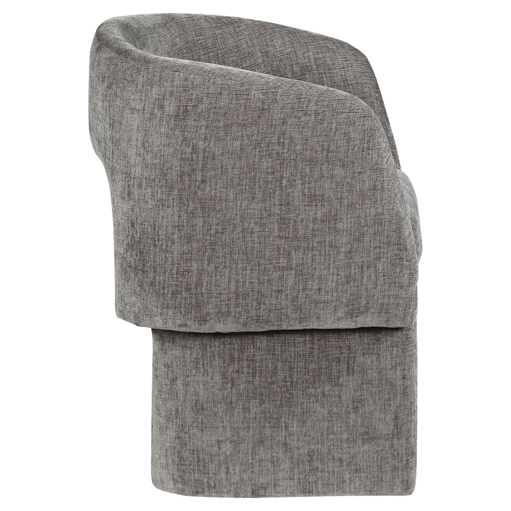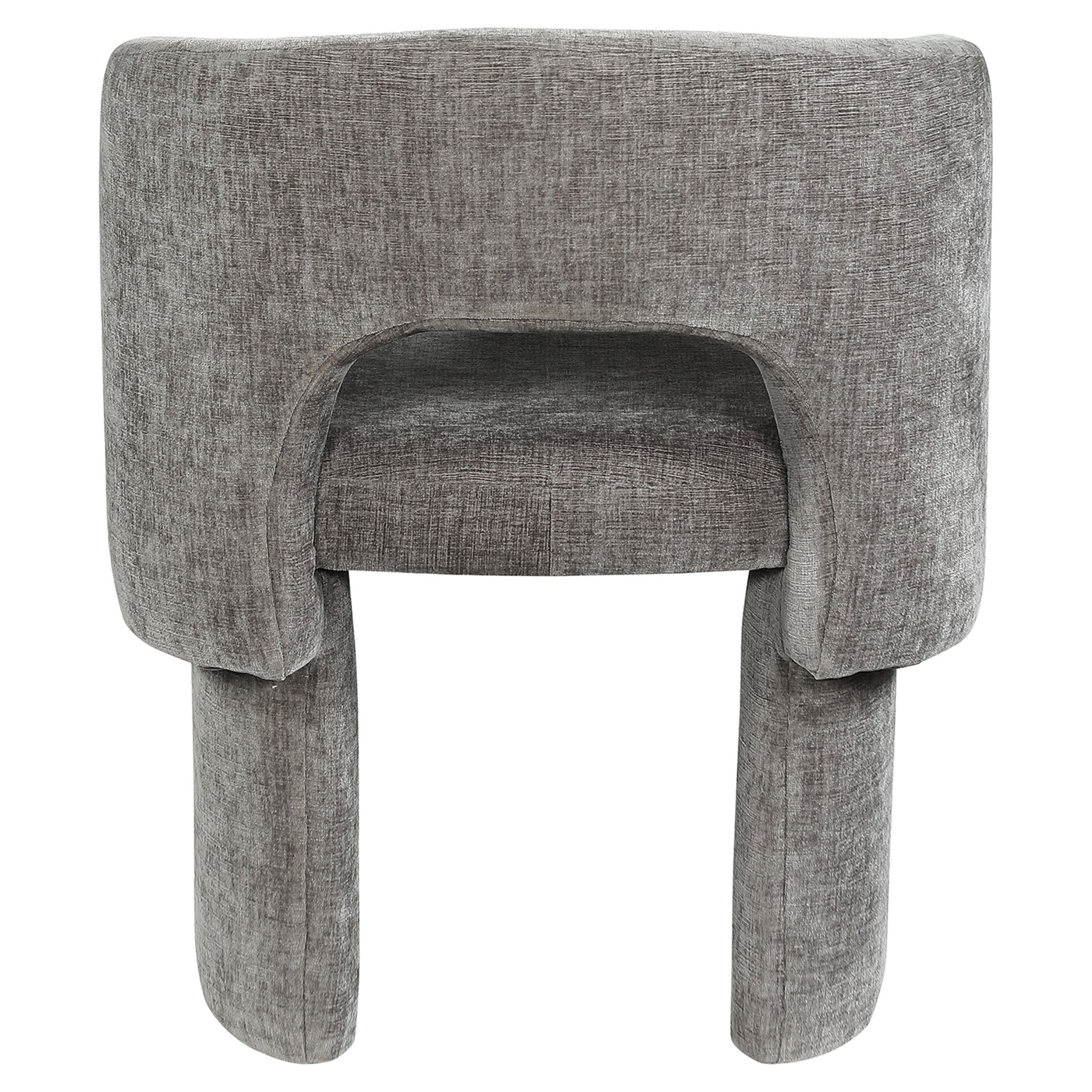 Le revêtement en tissu chenille gris riche recouvre cette chaise de haut en bas, lui conférant une sensation de luxe douce au toucher.