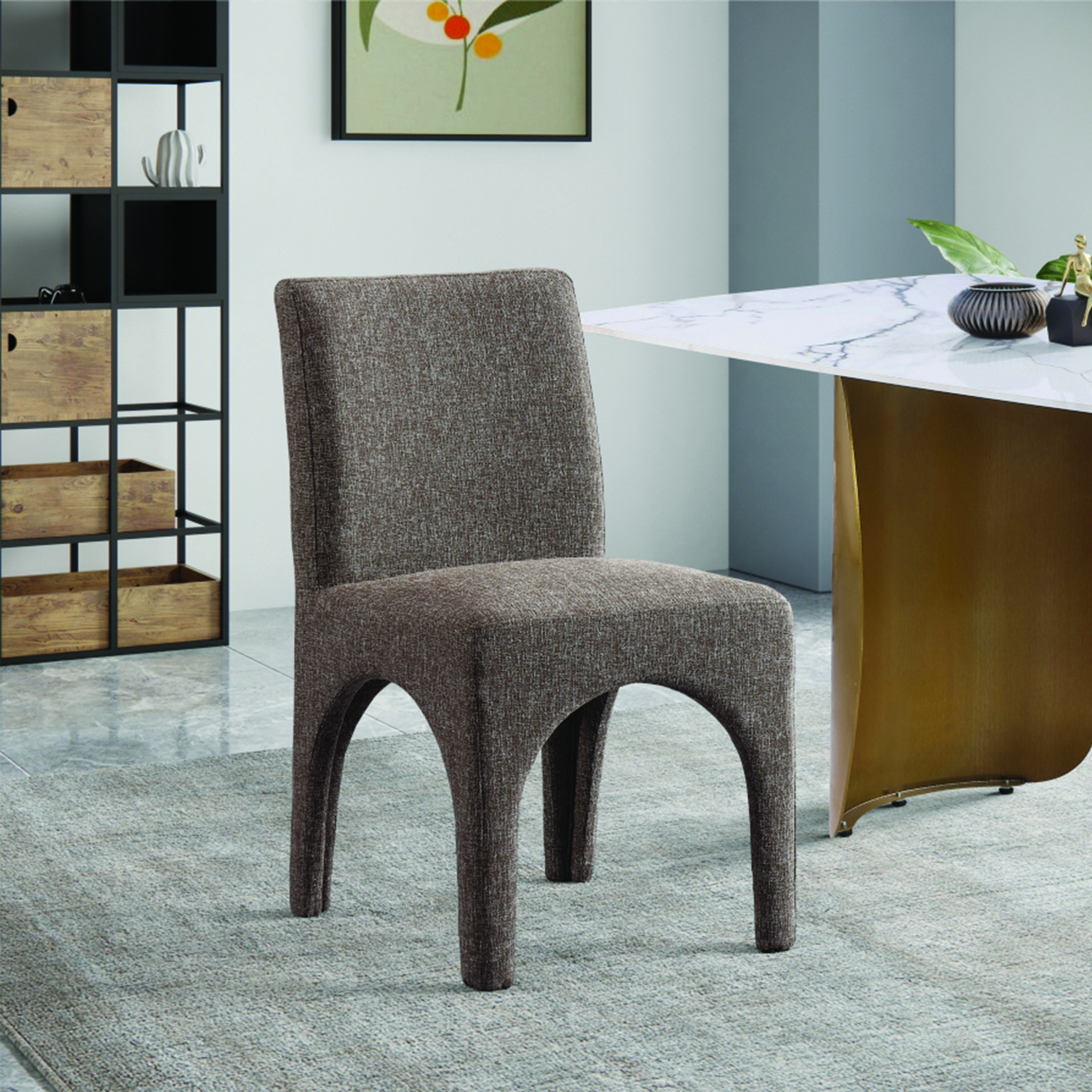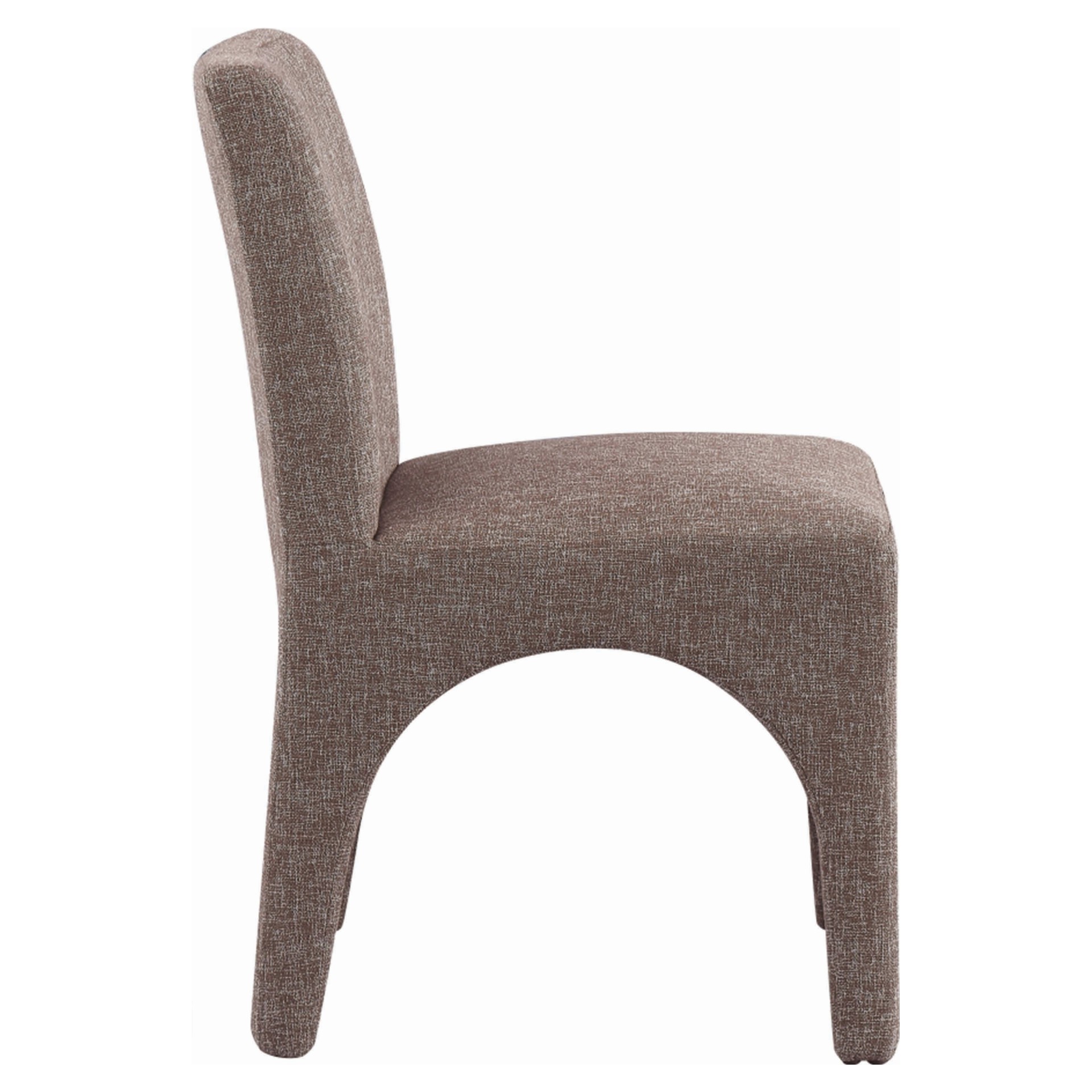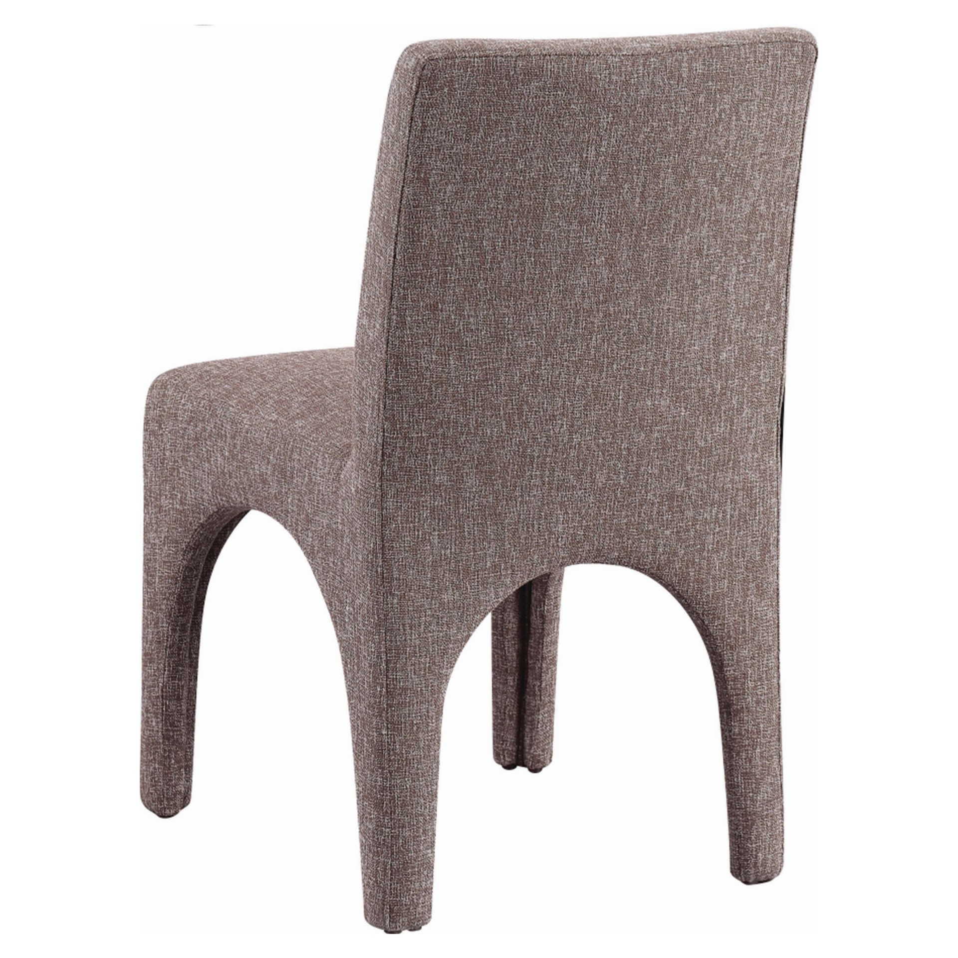 Cette chaise est recouverte d'un tissu brun moelleux au subtil tissage blanc, donnant à votre salle à manger un look raffiné et sophistiqué.