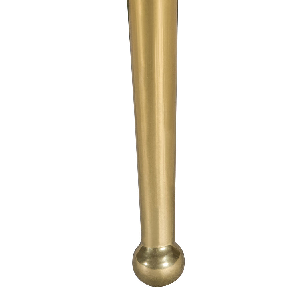 La chaise a une structure en bois et est soutenue par quatre pieds en or brossé, avec des boules décoratives pour les pieds.