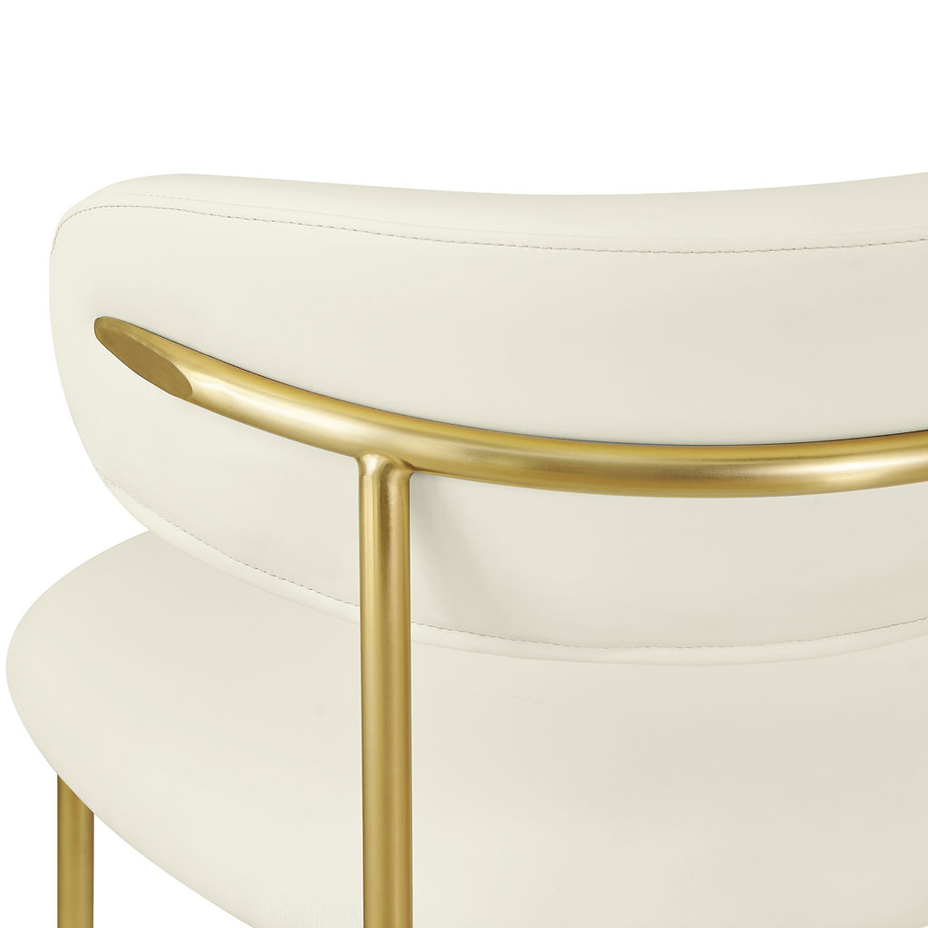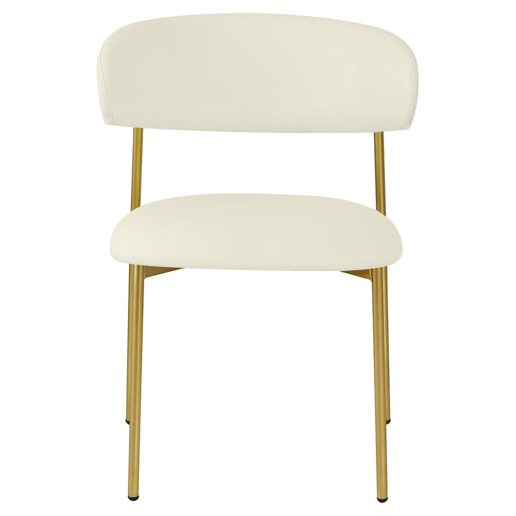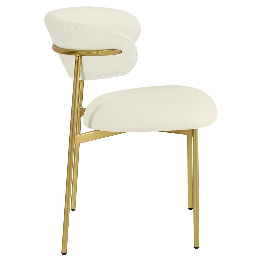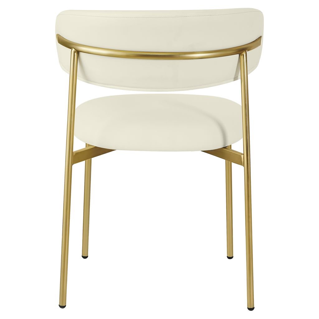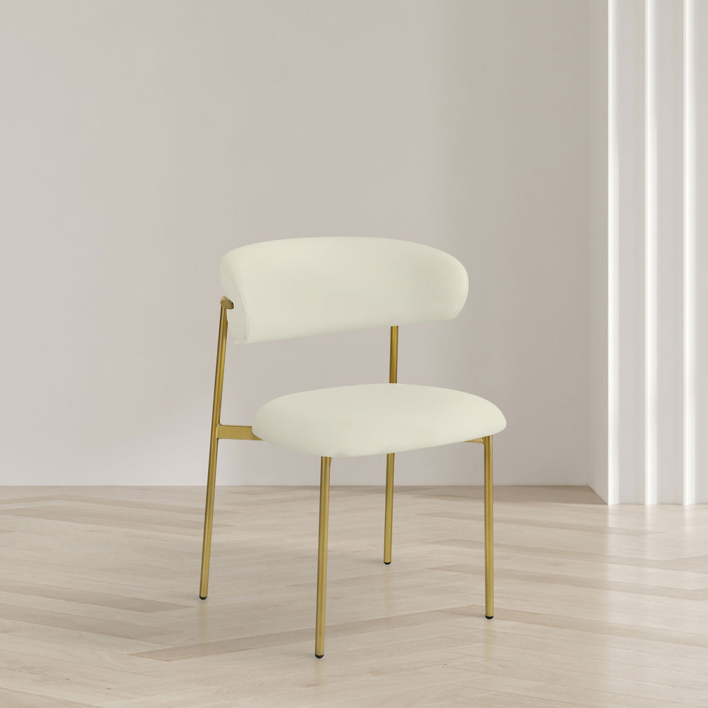 Bénéficiant d'une finition dorée brossée sur le cadre et les pieds pour une sensation élégante et raffinée, cette chaise de salle à manger en simili cuir présente un dossier incurvé pour un confort total tout au long du désert.