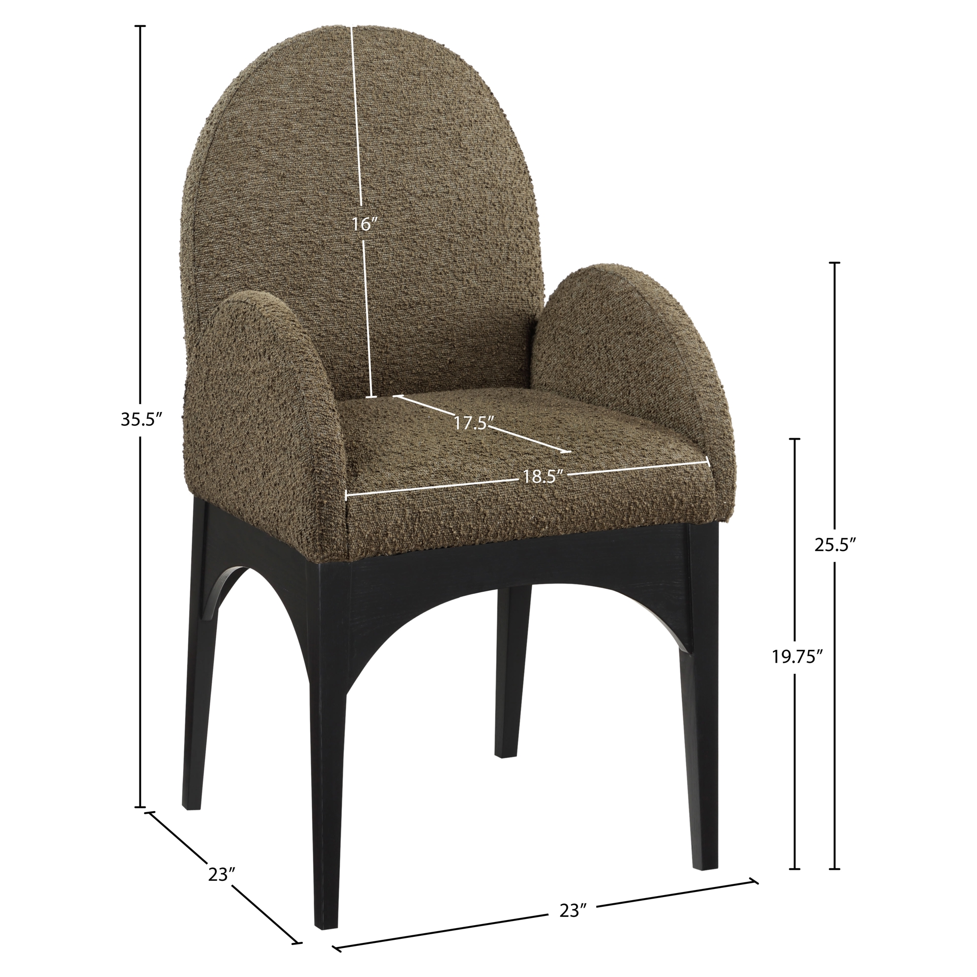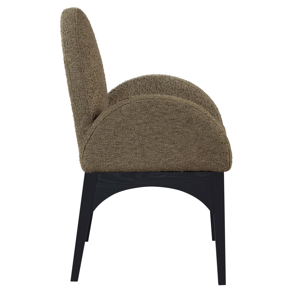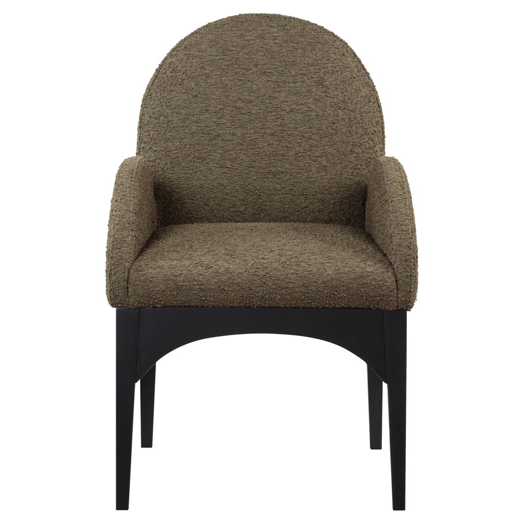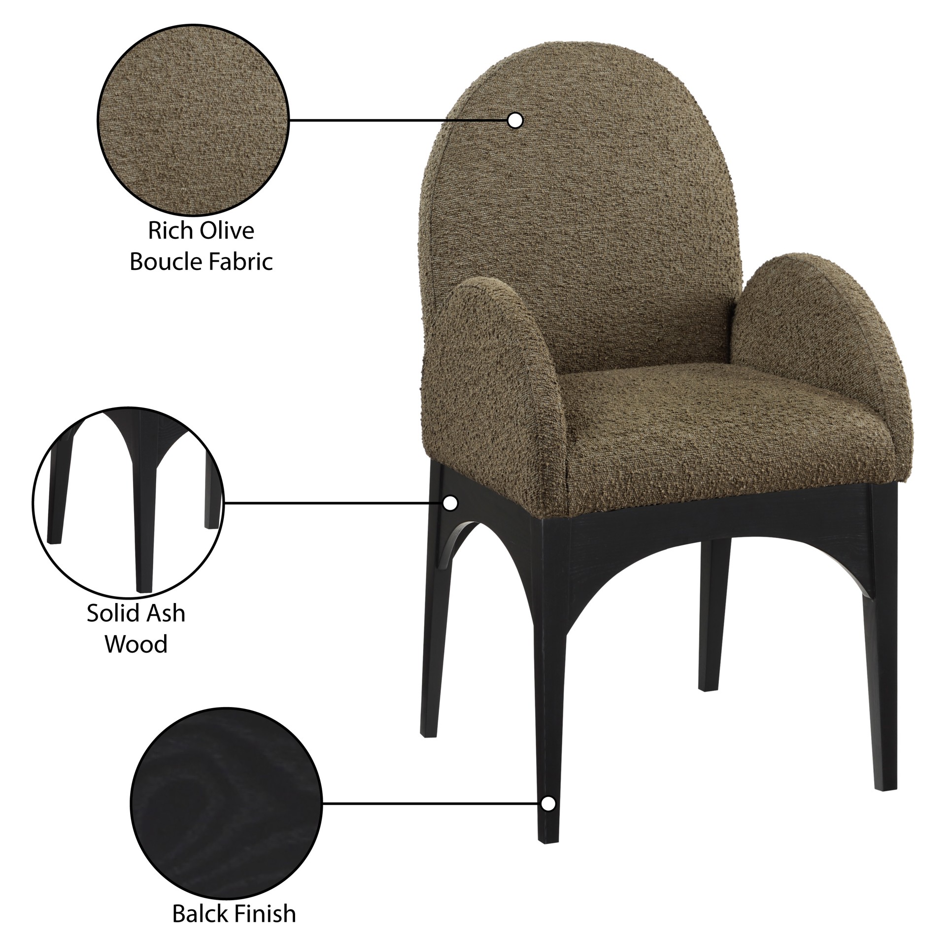 Le tissu bouclé olive moelleux sur le siège et le dossier de la chaise offre une expérience d'assise douce et confortable, ce qui en fait un choix idéal pour les longs dîners en famille et entre amis.