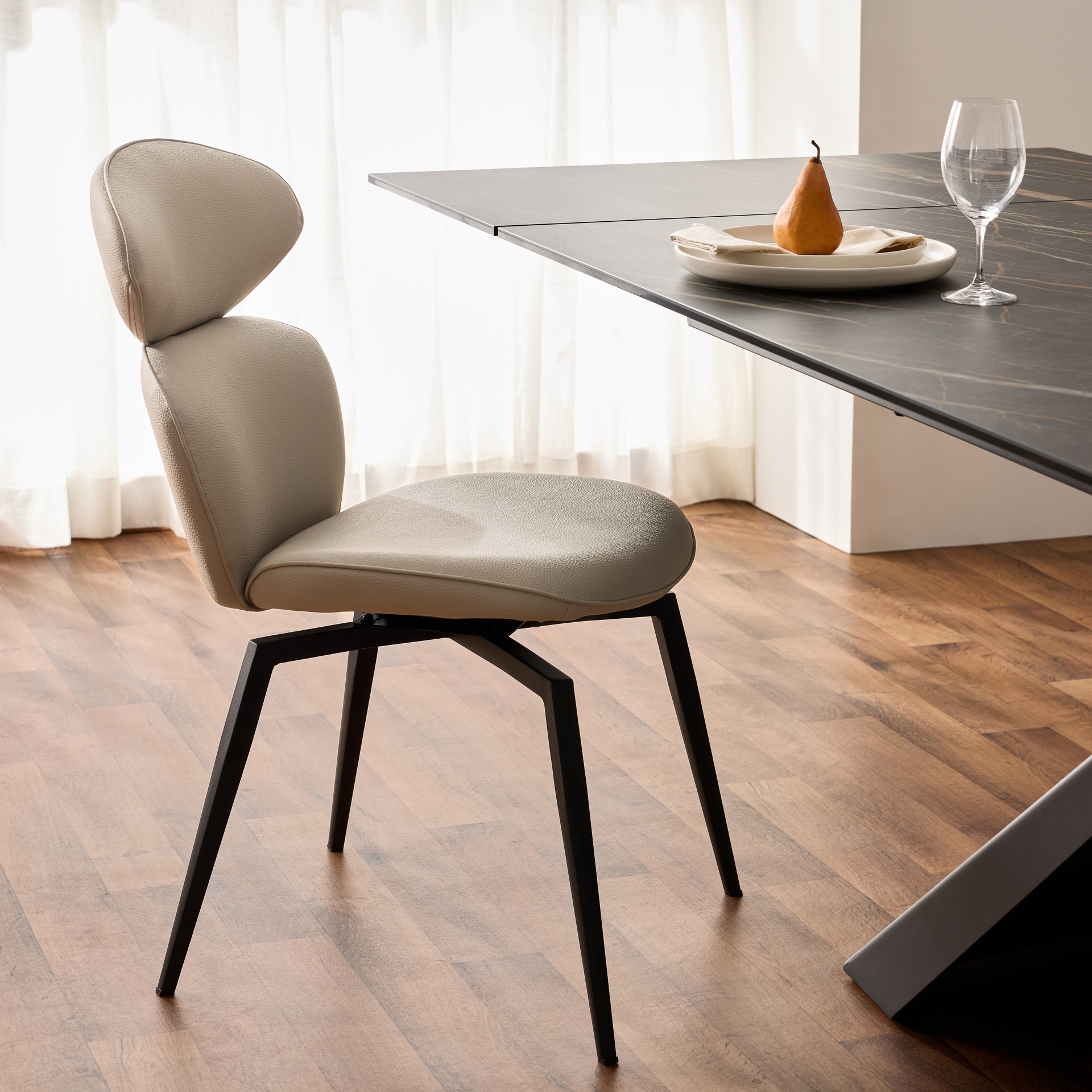 Cette chaise Antler incarne l'élégance contemporaine avec son design sculpté unique qui évoque la grâce naturelle. Son cuir synthétique taupe offre une texture raffinée et une durabilité exceptionnelle, parfaite pour un usage quotidien. Elle est dotée d'un remarquable mécanisme pivotant solide piètement en acier noir. Dès que vous ou vos invités se lèvent, la chaise reprend sa position initiale.