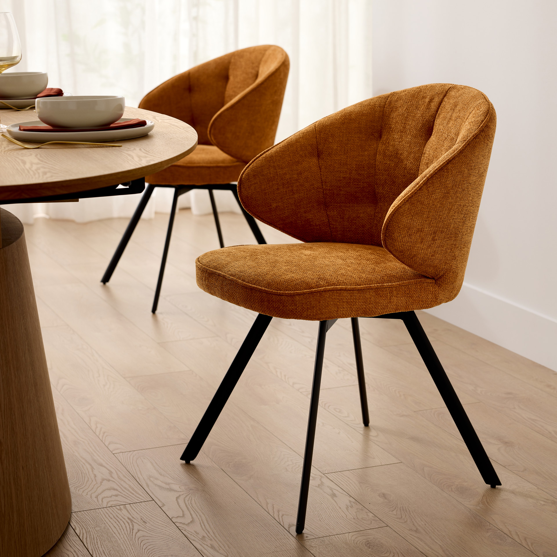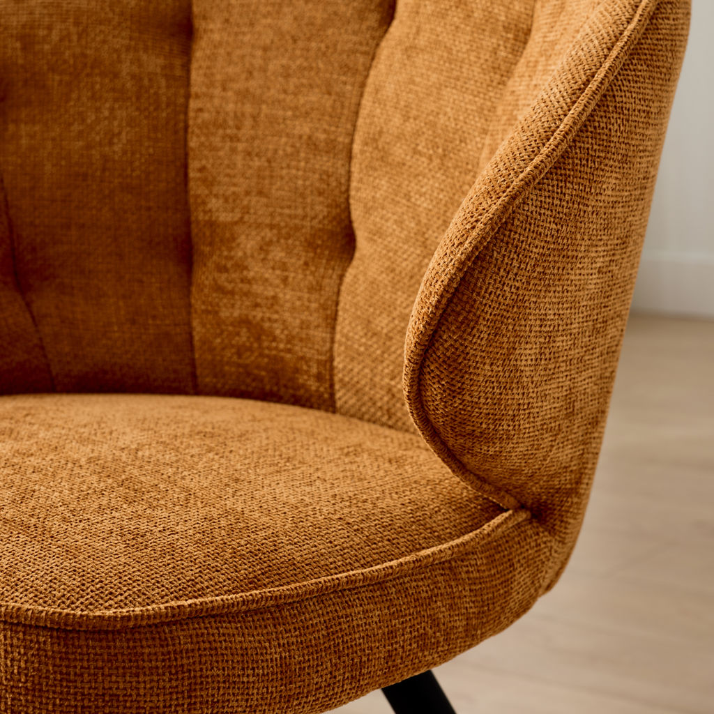 Le tissu texturé dans cette magnifique teinte orangée apporte chaleur et caractère à votre intérieur, tandis que les finitions soignées témoignent d'une qualité irréprochable. Ses pieds en métal noir ajoutent une touche de modernité et assurent une stabilité parfaite.