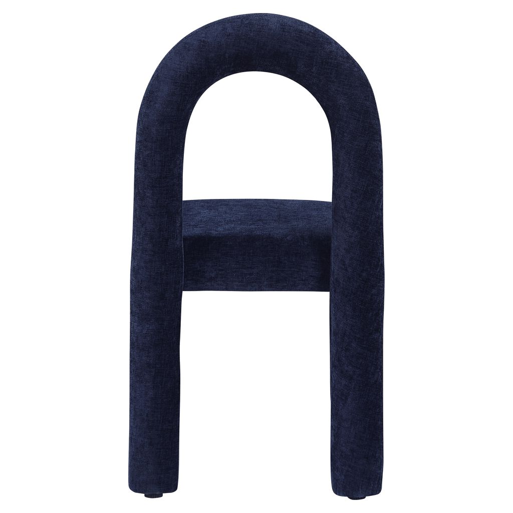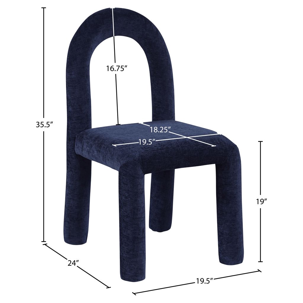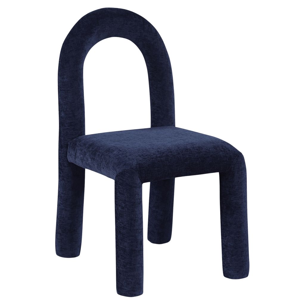 Laissez-vous séduire par le charme de la chaise de salle à manger Amari en tissu chenille de Meridian Furniture. Son design captivant et sa luxueuse finition en tissu chenille bleu marine rehaussent n'importe quel espace avec une élégance sans effort.