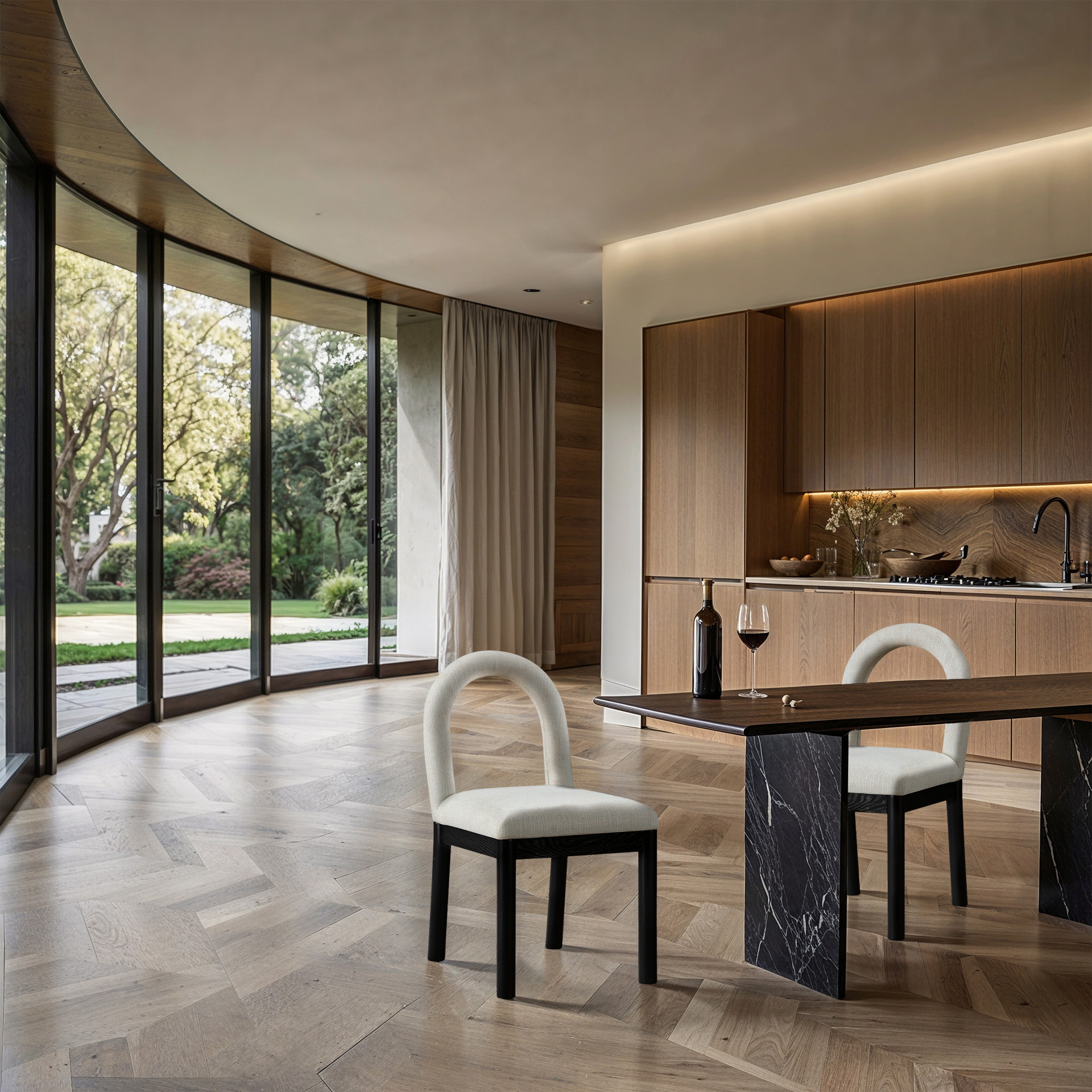 Tissu texturé riche en lin et polyester, tissage bicolore et finition noire en bois massif.