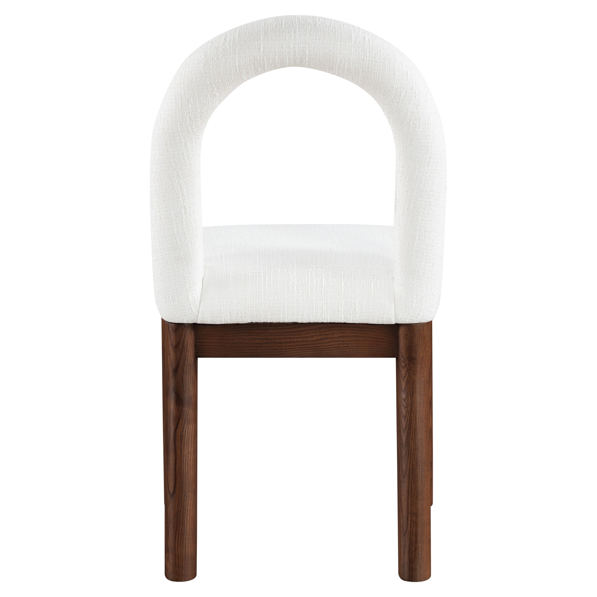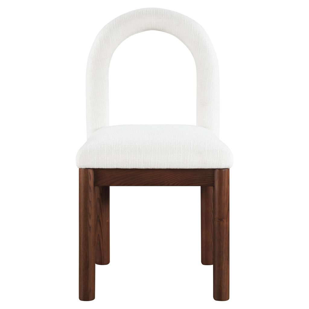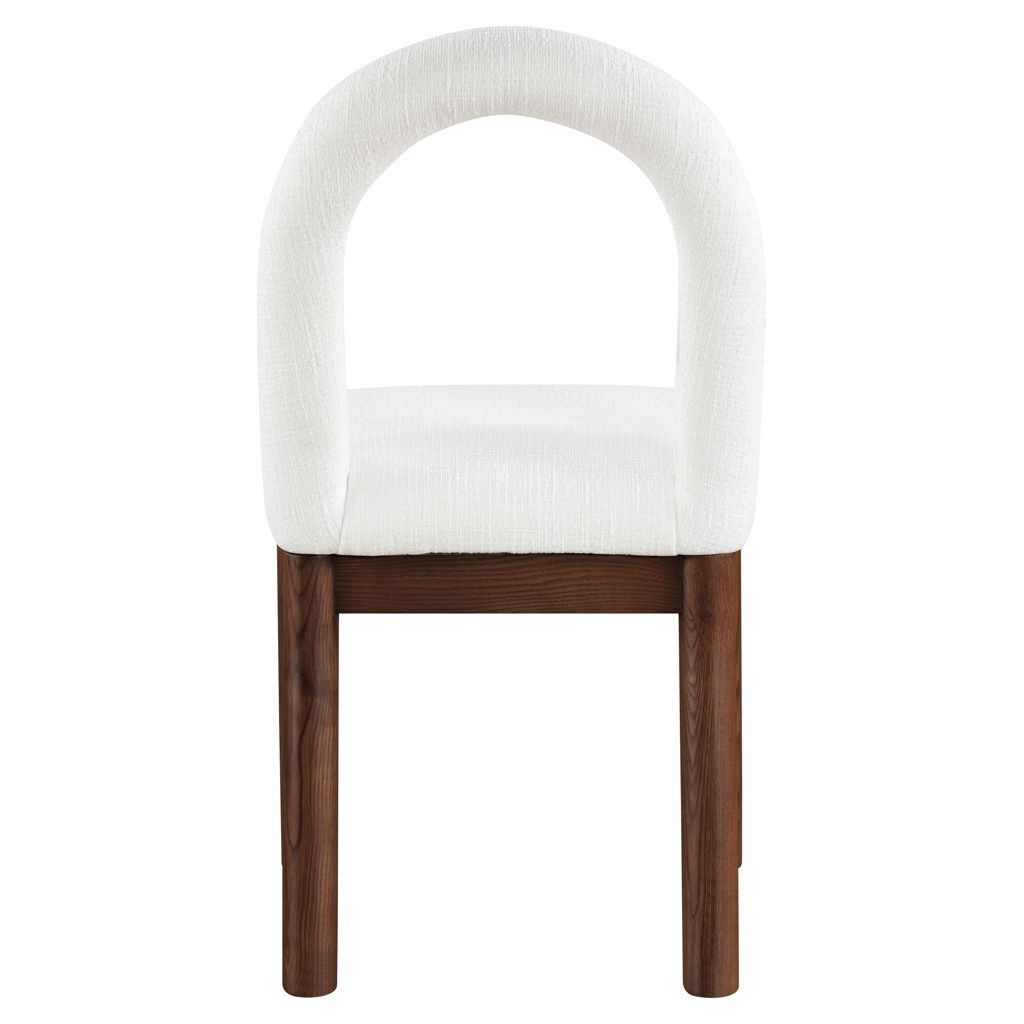 Chaise de salle à manger Conrad en tissu par Meridian Furniture. Son design captivant et sa luxueuse finition en tissu texturé en lin crème rehaussent n'importe quel espace avec une élégance sans effort.