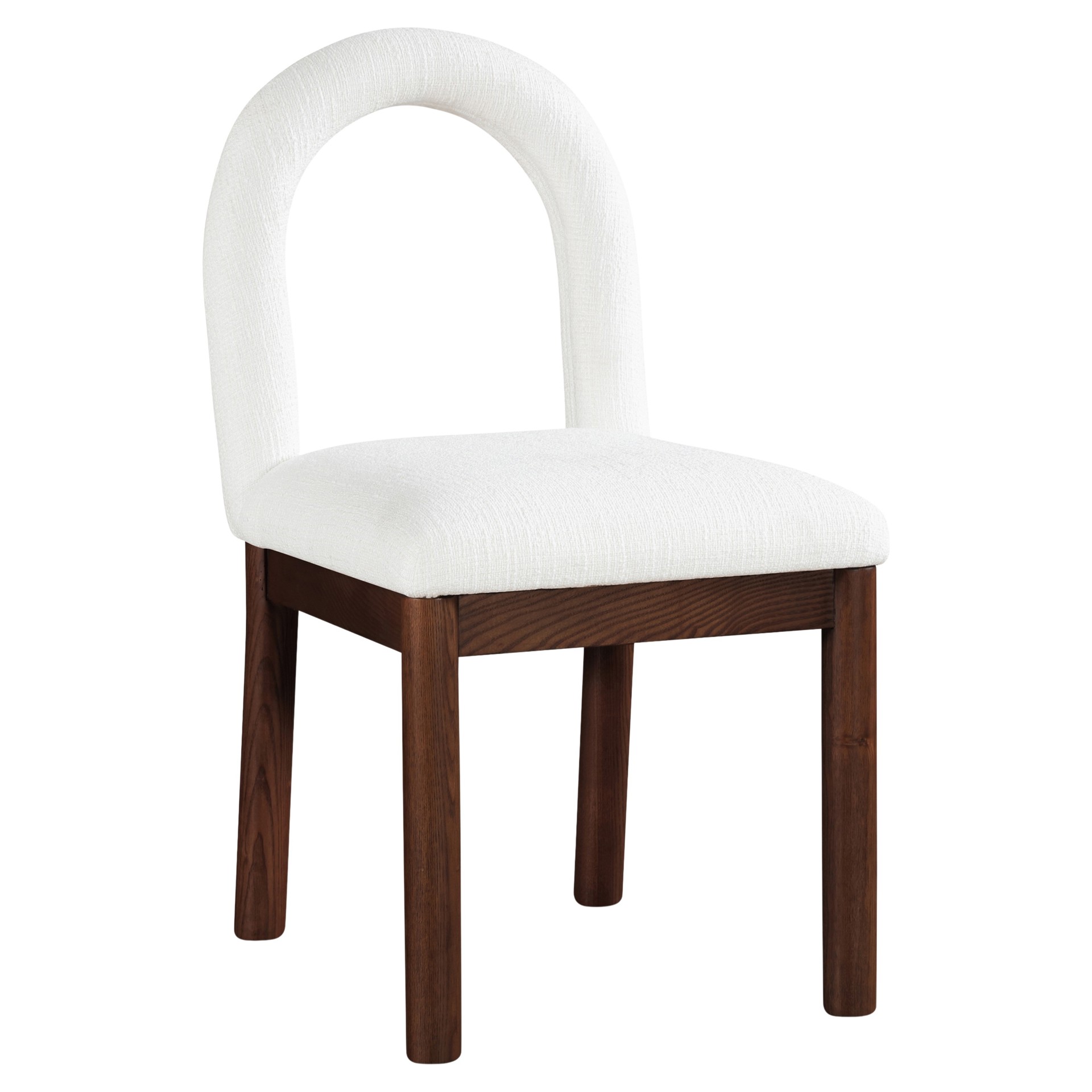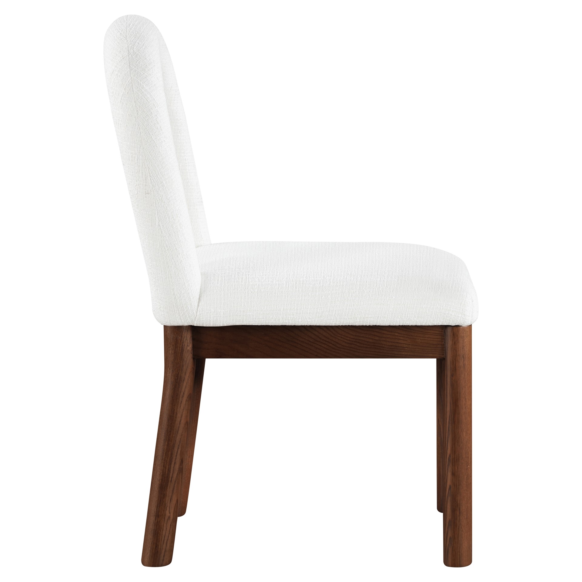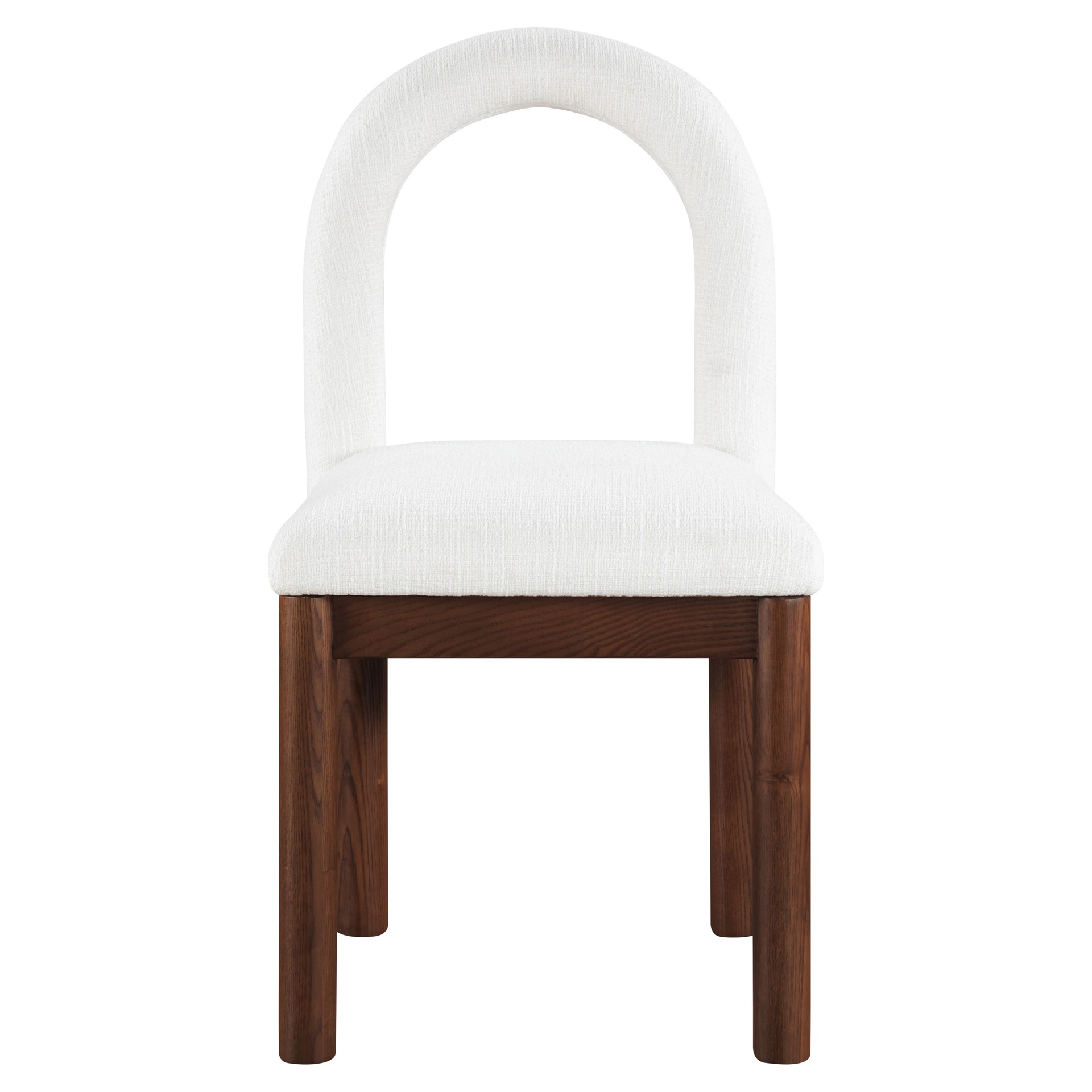 Chaise de salle à manger Conrad en tissu par Meridian Furniture. Son design captivant et sa luxueuse finition en tissu texturé en lin crème rehaussent n'importe quel espace avec une élégance sans effort.
