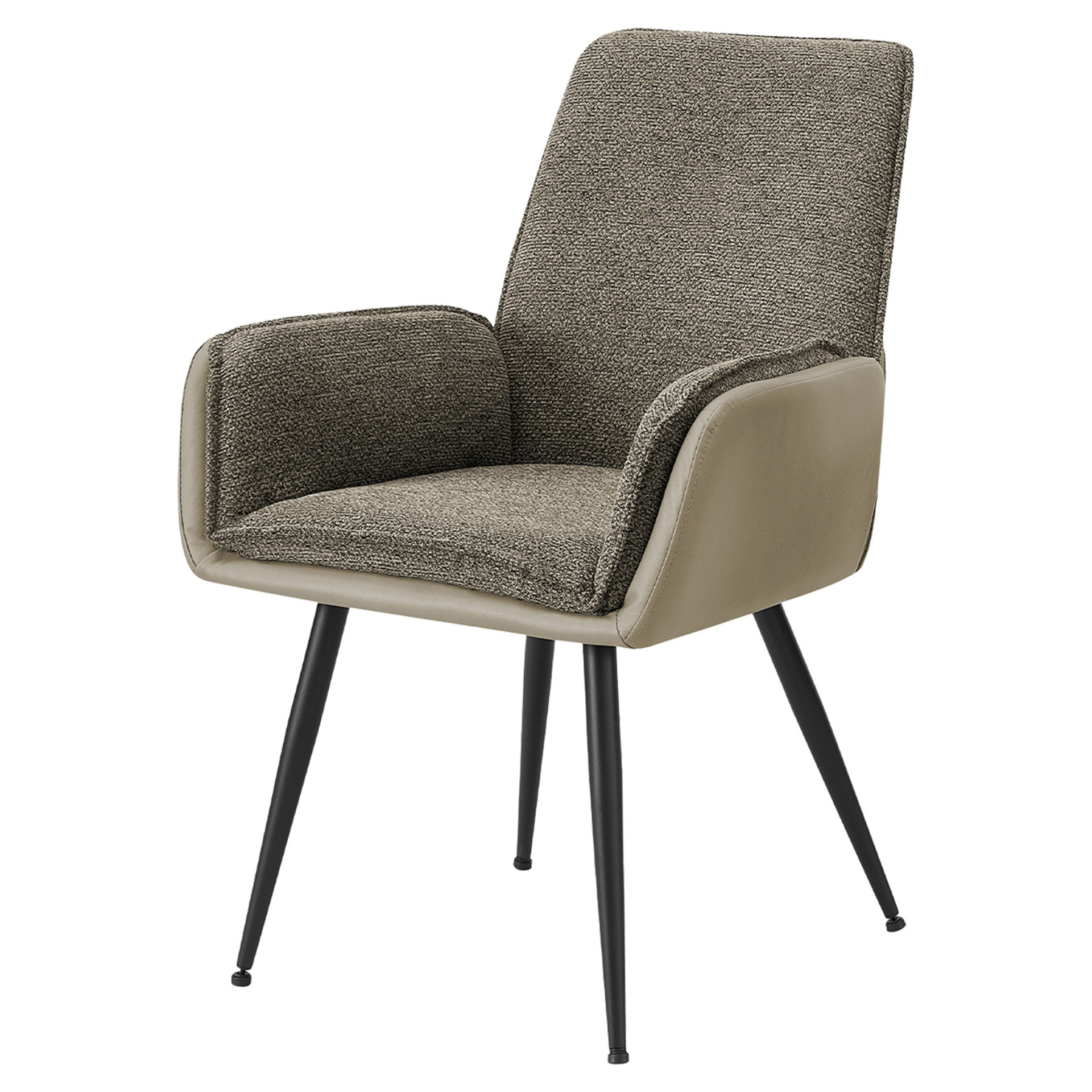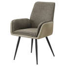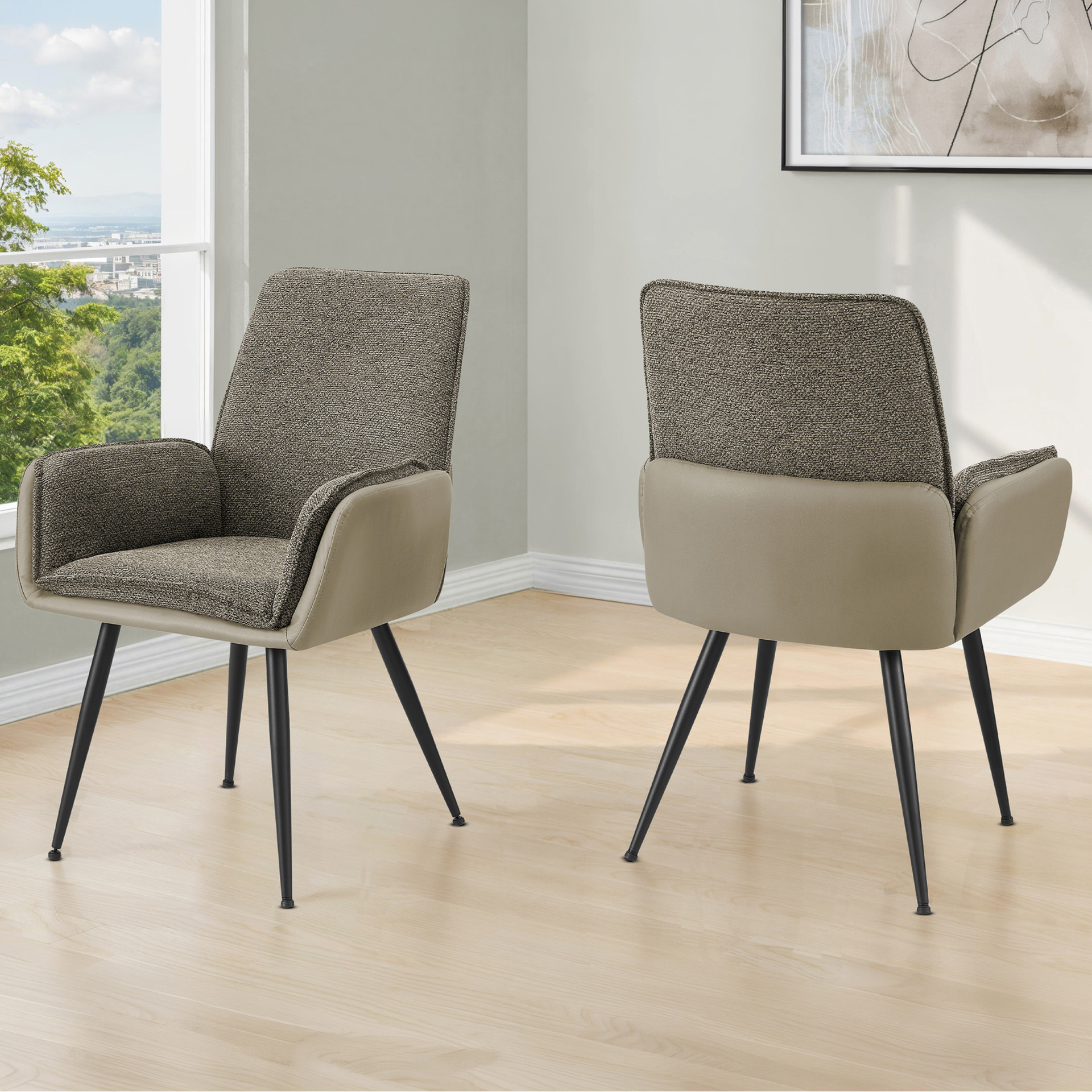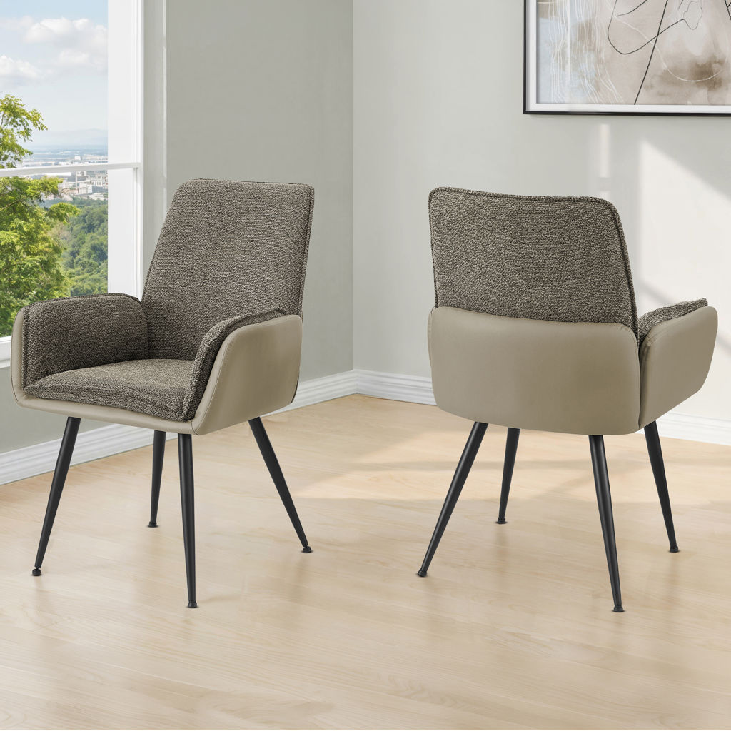 Les chaises associent plusieurs matériaux, combinant un revêtement taupe aspect cuir lisse avec un tissu brun texturé pour un look superposé et résolument tendance. Leur forme doucement profilée et l'assise rembourrée confortable créent une ambiance accueillante, invitant les convives à rester autour de la table.