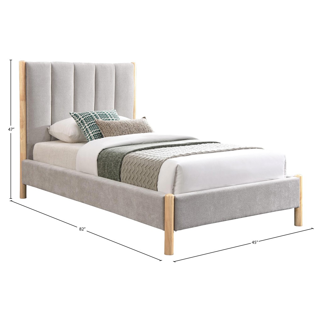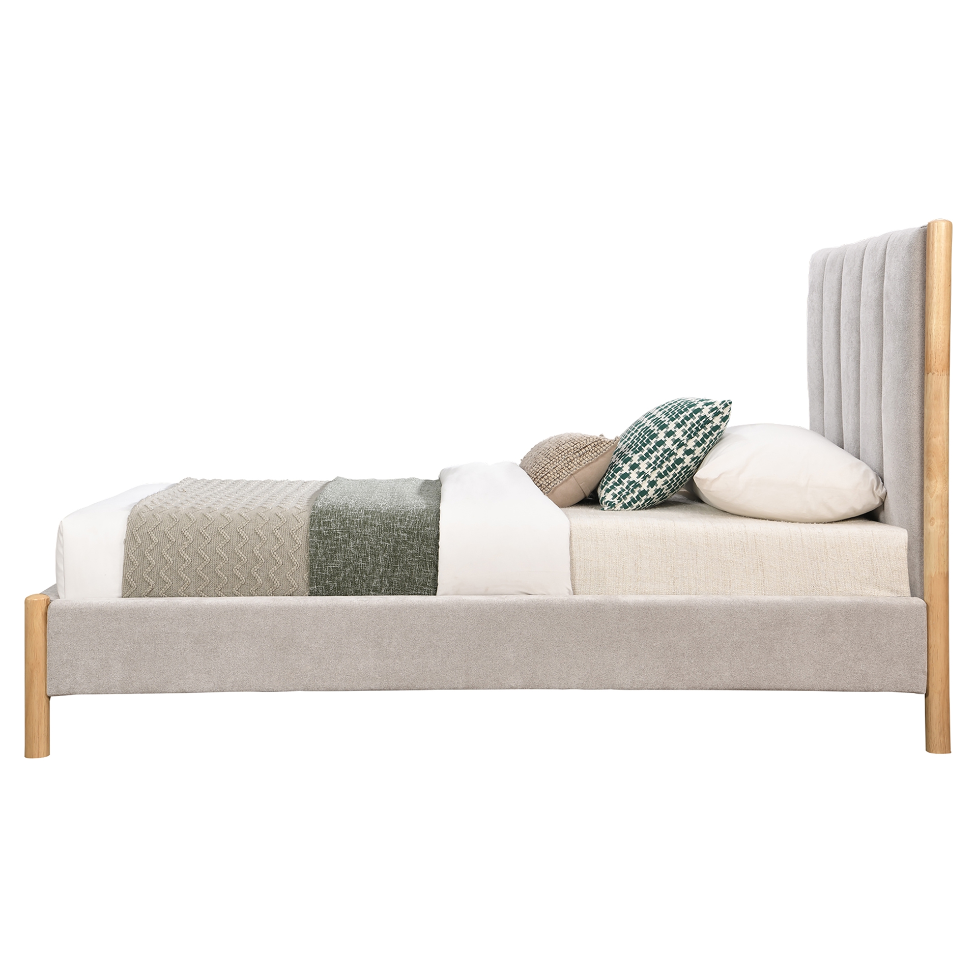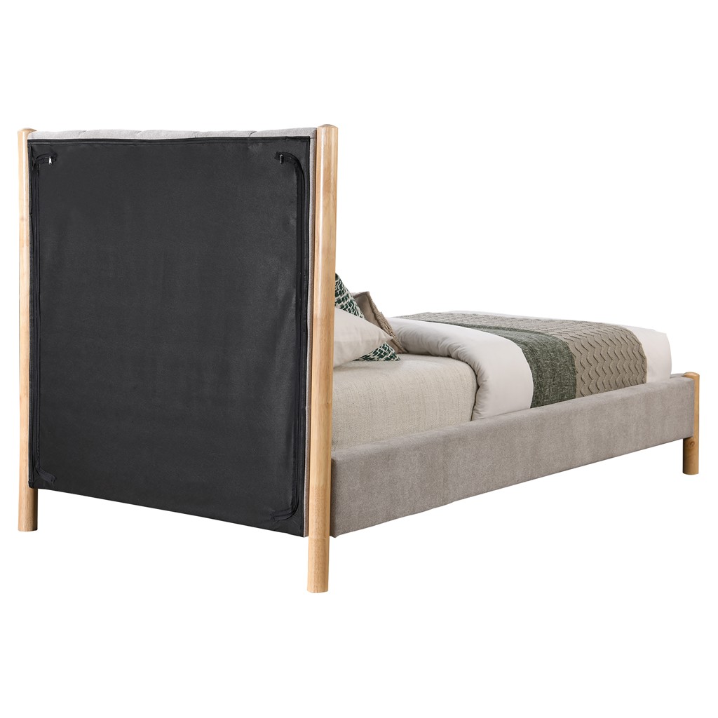 Les pieds en bois massif ont une finition naturelle qui s'harmonise avec la magnifique tête de lit et les rails latéraux en tissu.