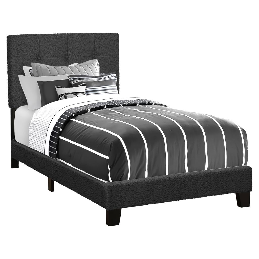 Créez un espace de chambre tendance et au style élégant pour un jeune avec ce cadre de lit simple chic, recouvert d'un tissu bouclé noir et de pieds en plastique noirs au style bloc. Ce lit au style transitionnel est conçu avec une tête de lit classique, rembourrée et capitonnée de boutons, offrant un soutien confortable.