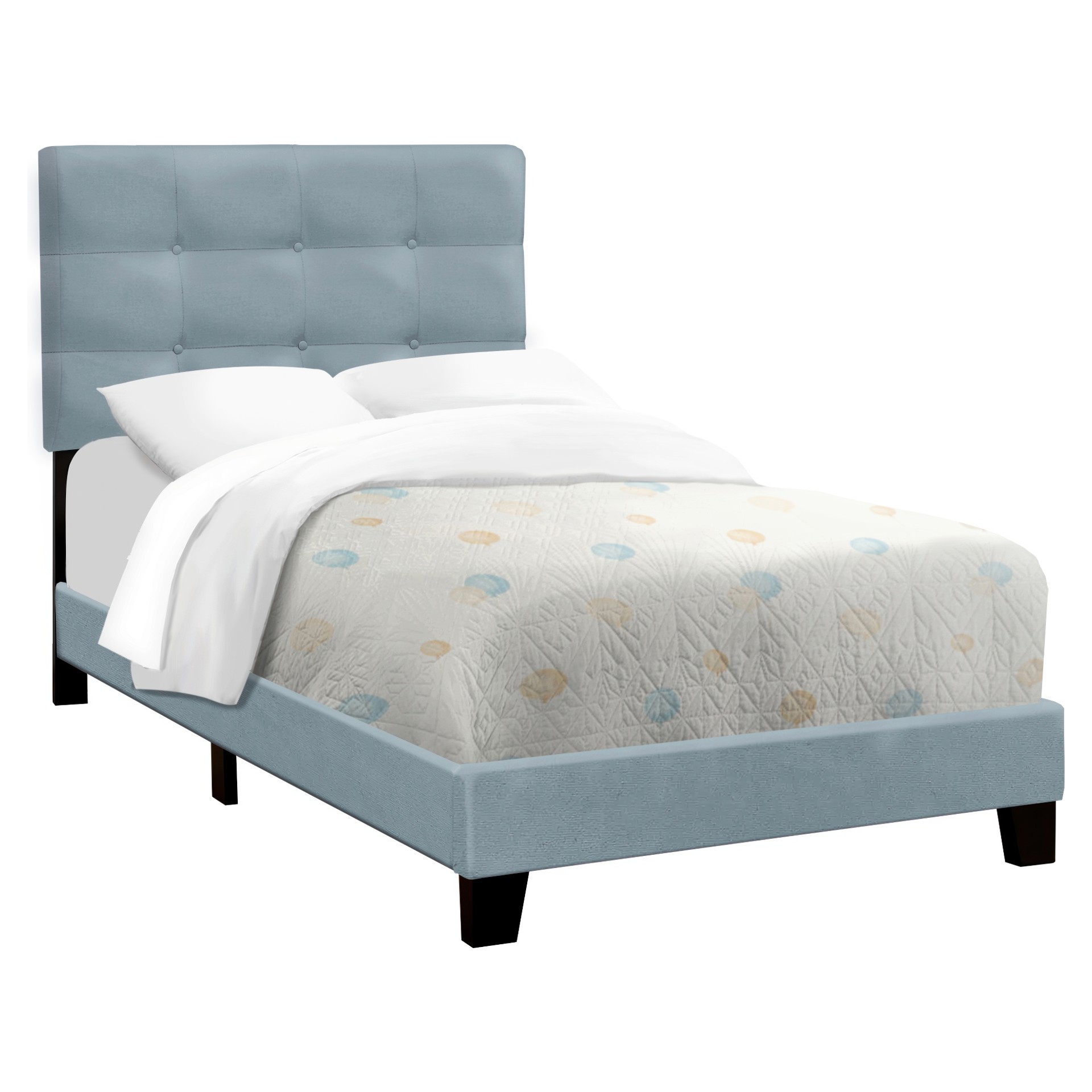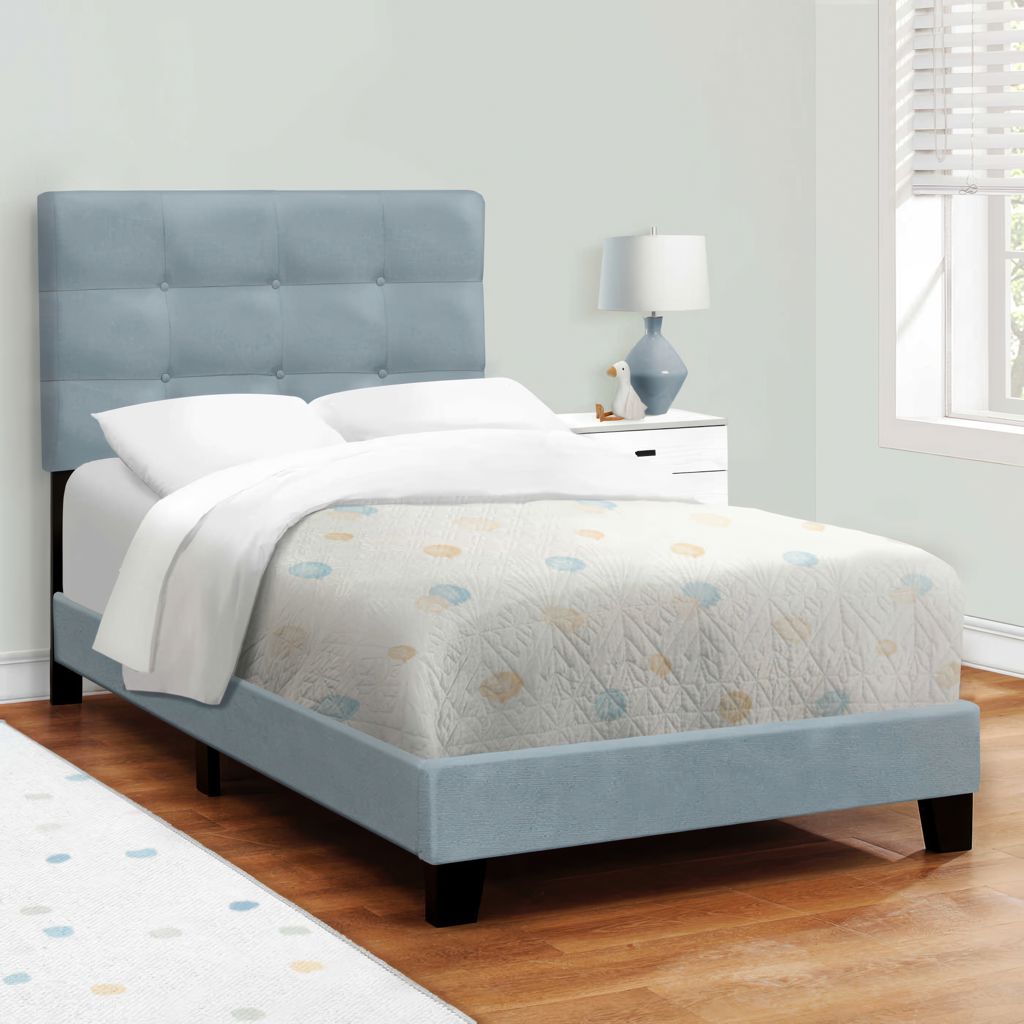Créez un look saisissant dans votre chambre à coucher avec ce cadre de lit à plate-forme de taille simple. Revêtu d'un velours bleu pâle chic, d'un tissu doux au toucher et d'un épais rembourrage en mousse le long du dossier et des côtés touffus pour une sensation de confort.