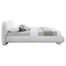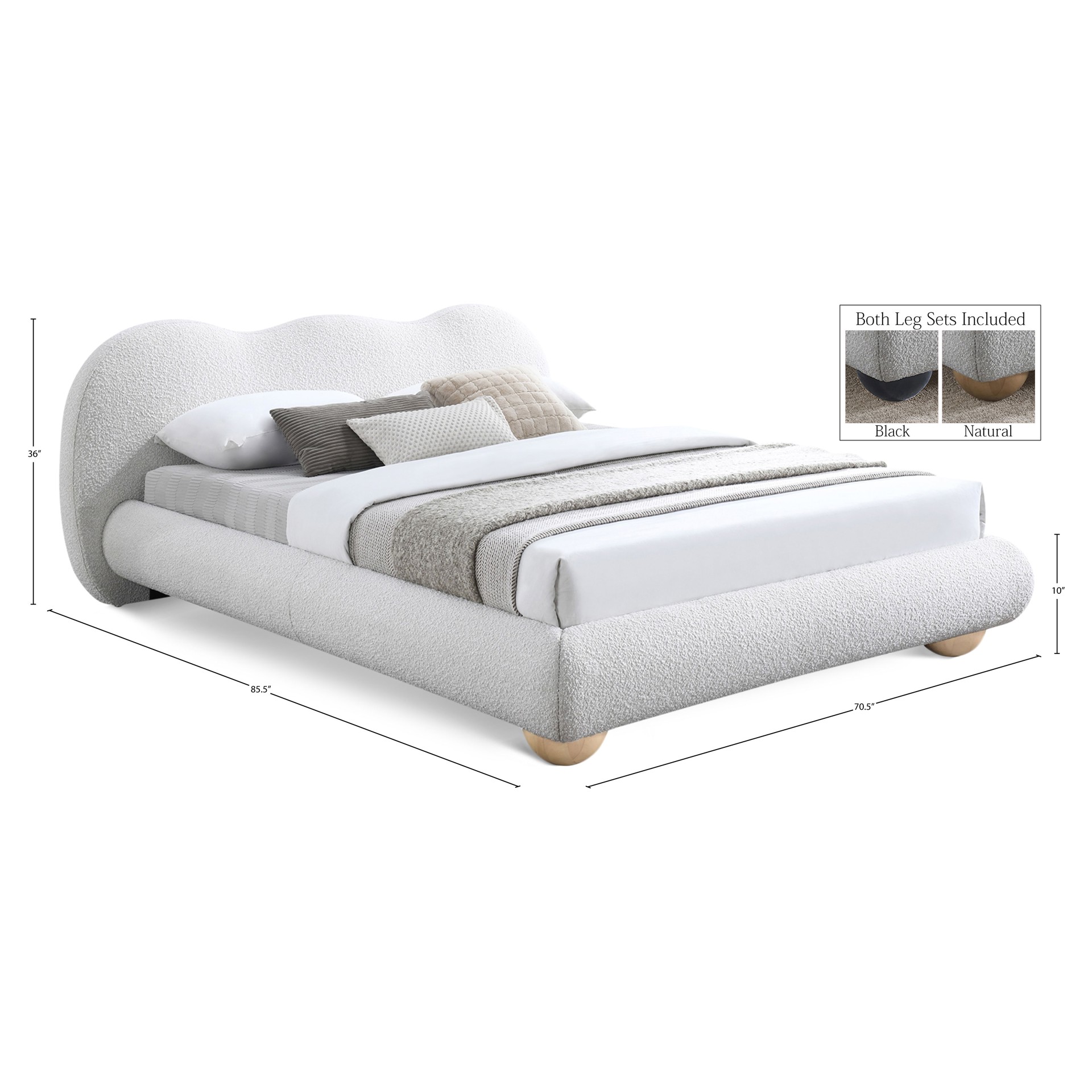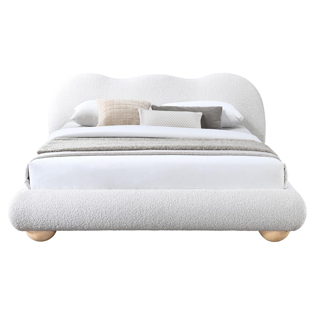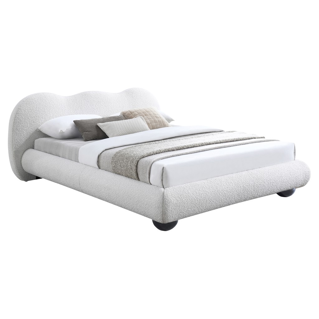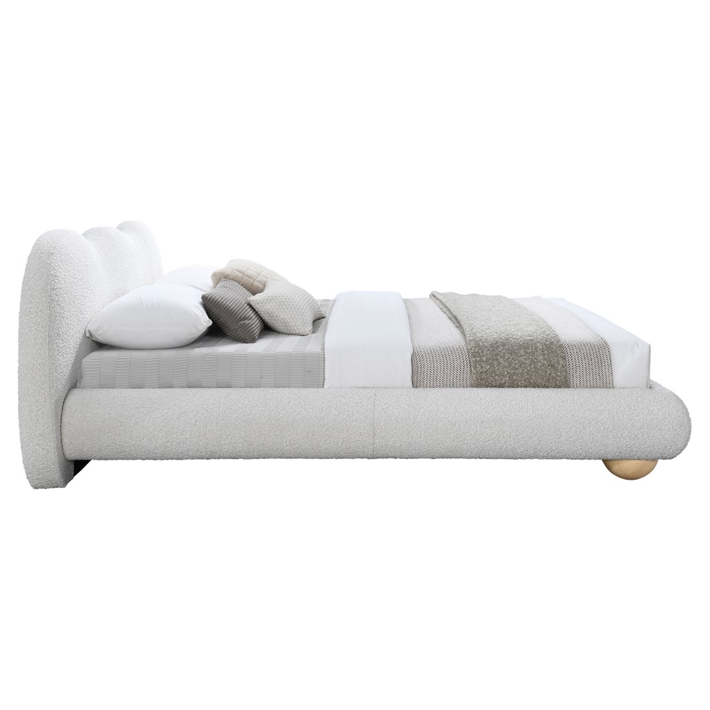 Le lit est recouvert d'un riche tissu bouclé crème, dont la texture somptueuse ajoute de la profondeur et de la dimension à votre chambre à coucher. Ce matériau captivant crée un contraste saisissant avec la literie et la décoration plus claires, garantissant que votre lit reste un point central élégant, quelle que soit l'esthétique que vous avez choisie.