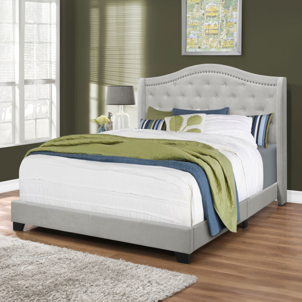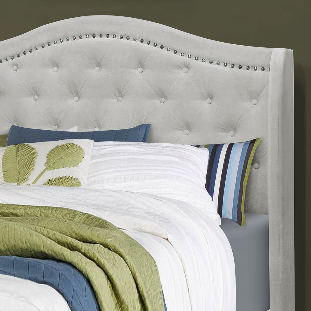 Tête de lit tapissier à oreilles latérales avec base de lit recouverte de tissu de velours gris clair.