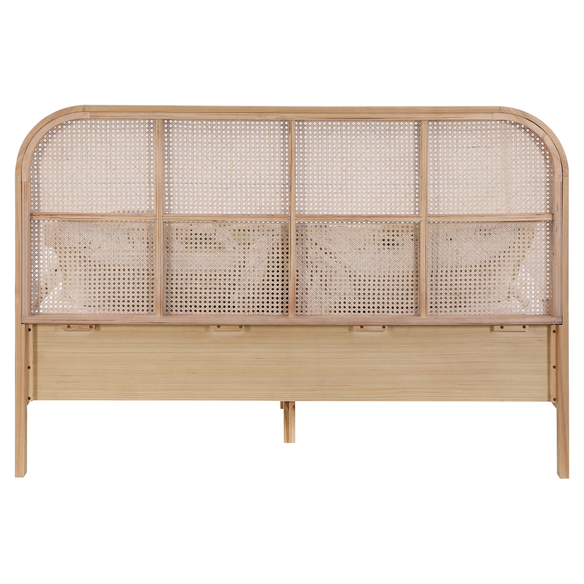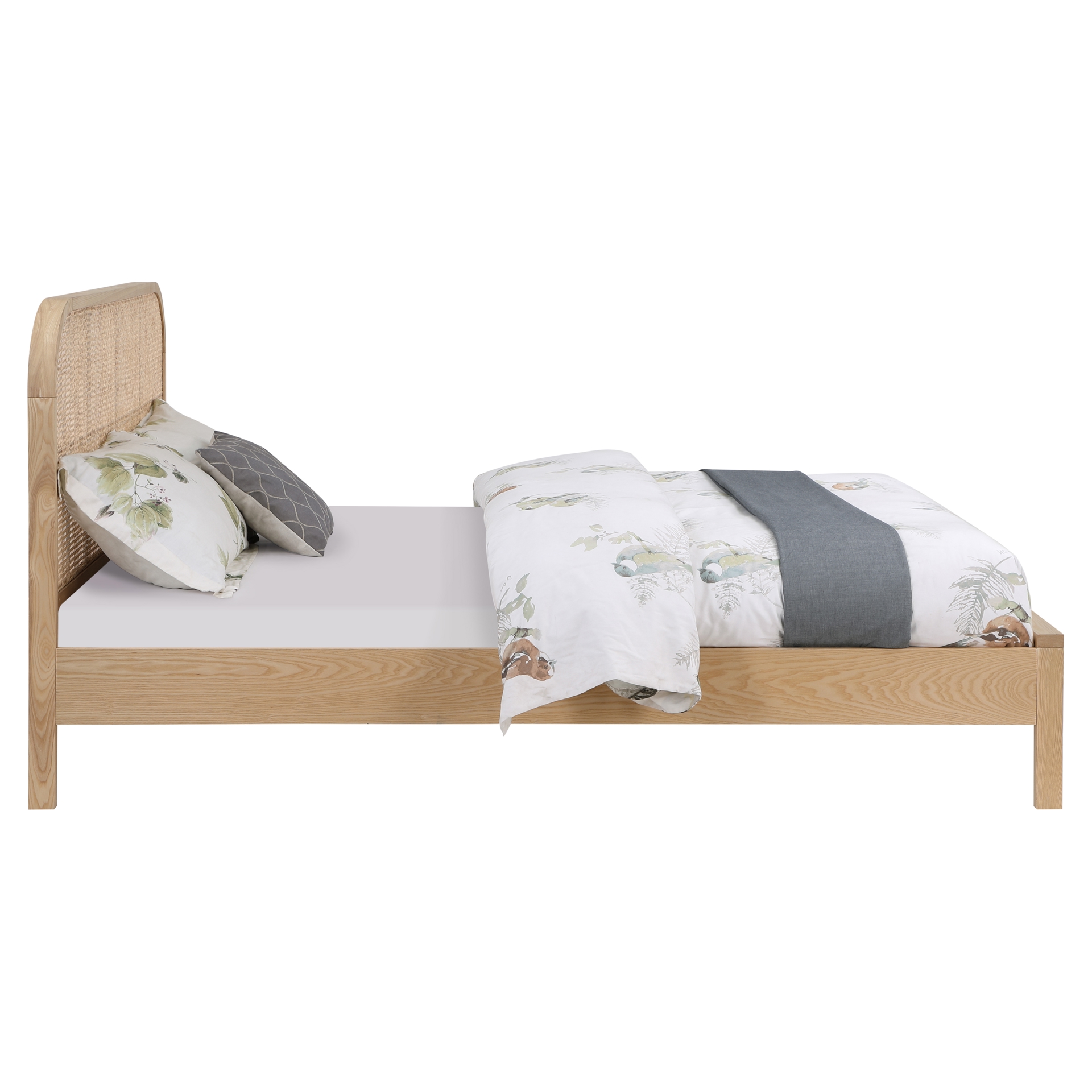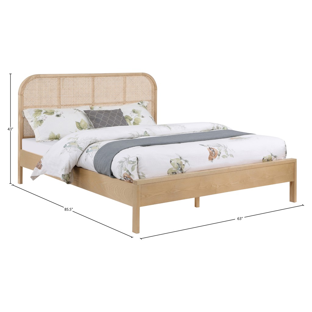 La riche finition naturelle du placage de frêne lui confère une belle esthétique, tandis que l'insert en canne naturelle sur la tête de lit ajoute un contraste difficile à manquer qui souligne l'élégance et la sophistication du lit.