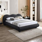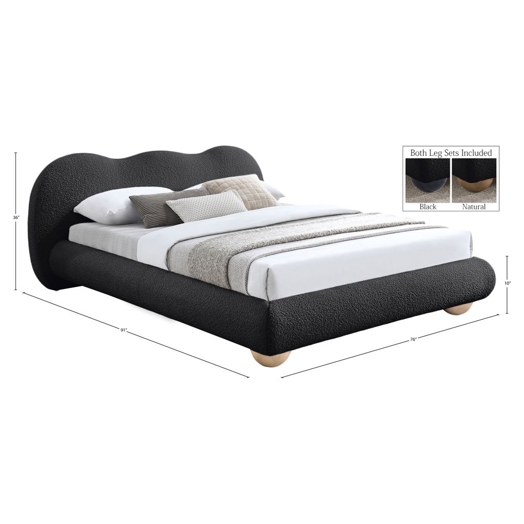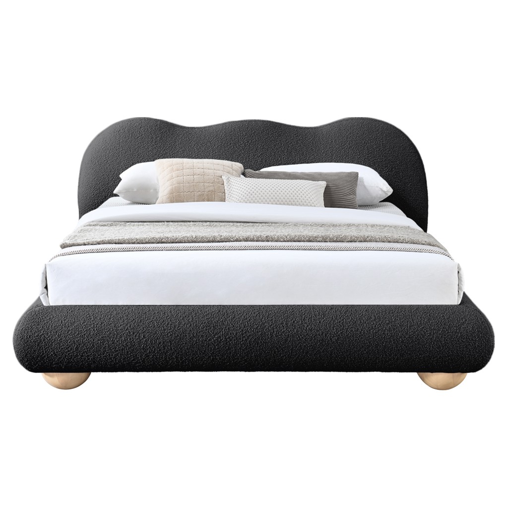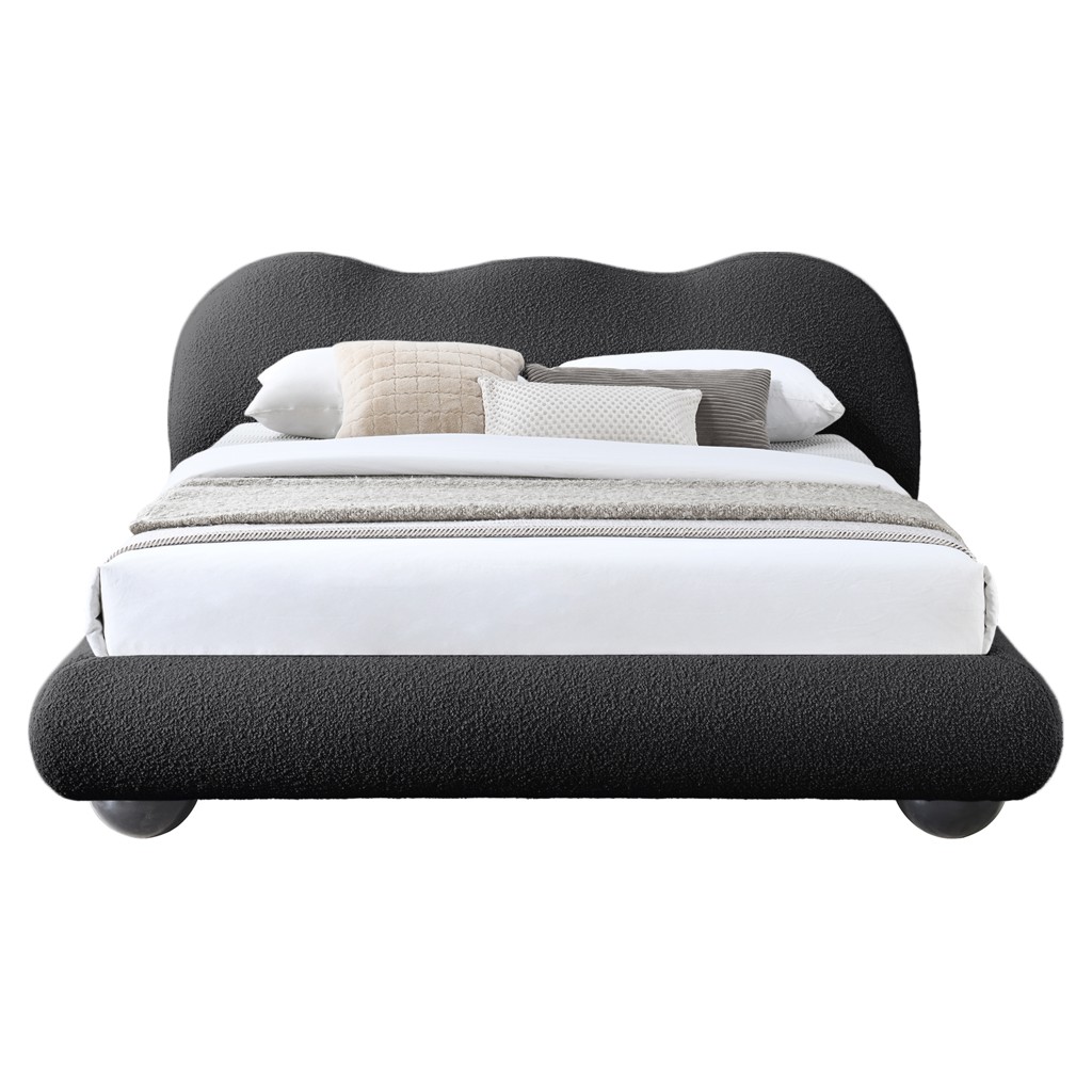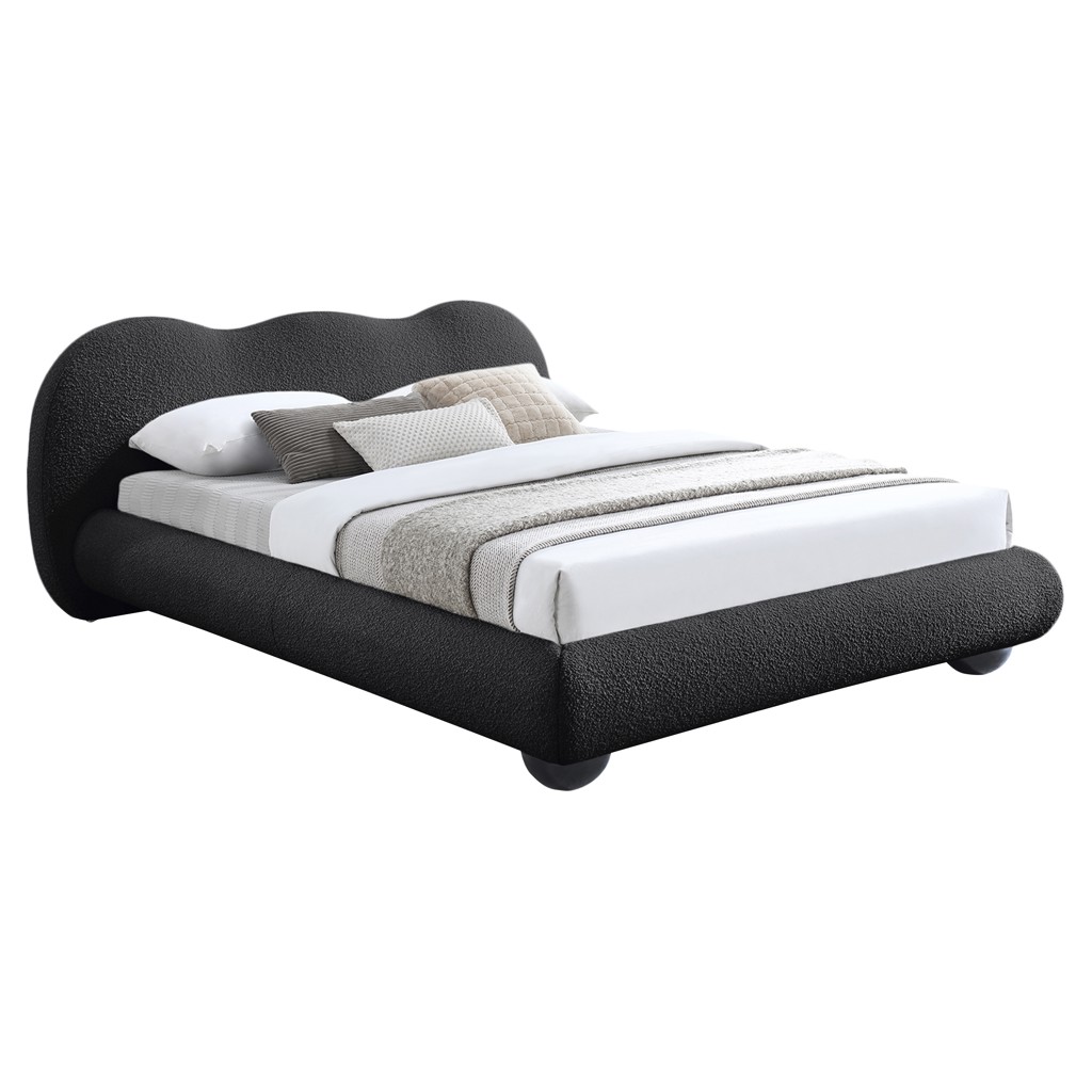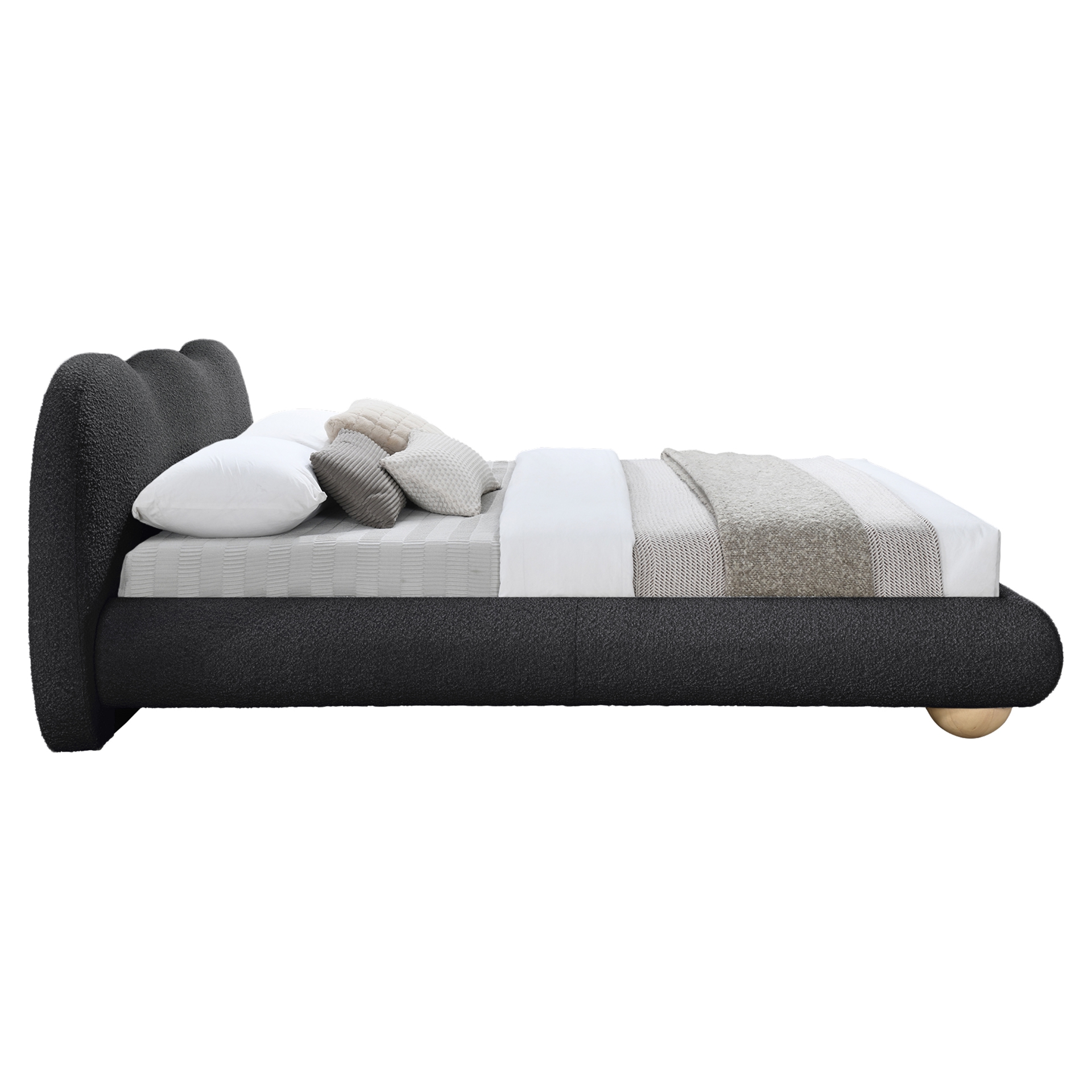 Le lit est recouvert d'un riche tissu bouclé noir, dont la texture somptueuse ajoute de la profondeur et de la dimension à votre chambre à coucher. Ce matériau captivant crée un contraste saisissant avec la literie et la décoration plus claires, garantissant que votre lit reste un point central élégant, quelle que soit l'esthétique que vous avez choisie.