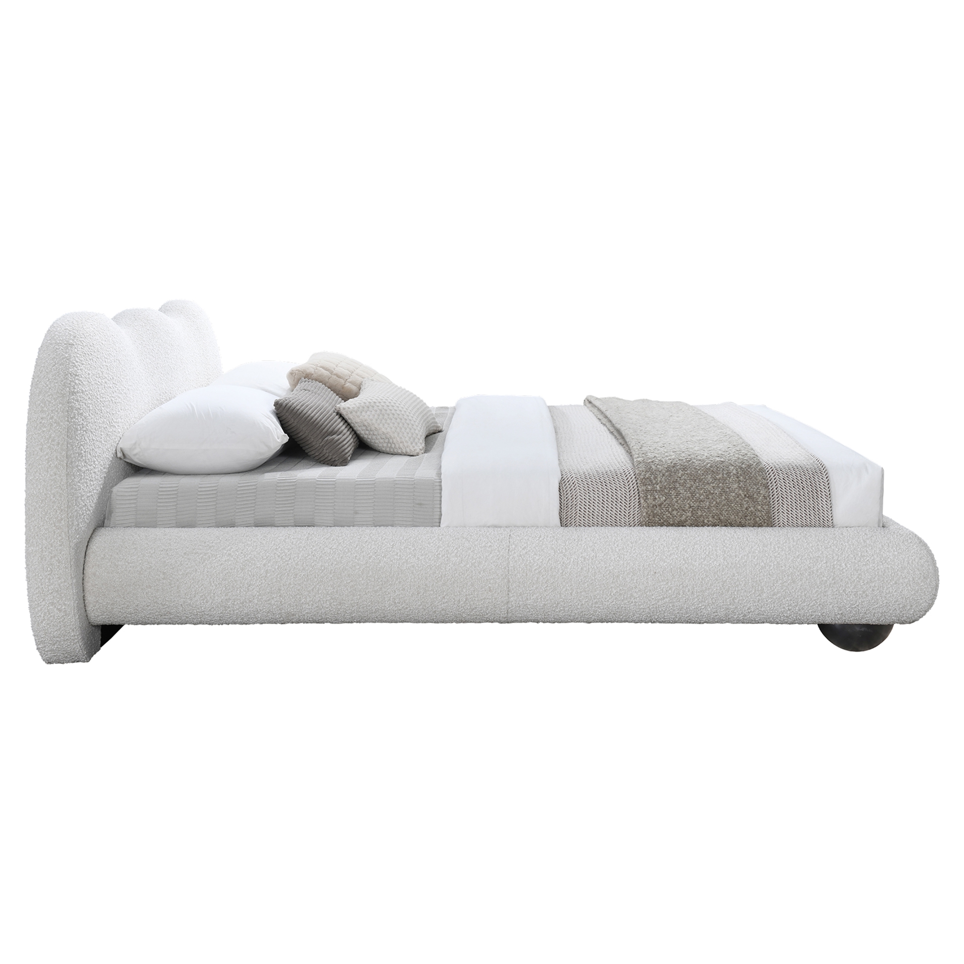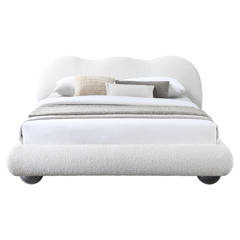 Le lit est recouvert d'un riche tissu bouclé crème, dont la texture somptueuse ajoute de la profondeur et de la dimension à votre chambre à coucher. Ce matériau captivant crée un contraste saisissant avec la literie et la décoration plus claires, garantissant que votre lit reste un point central élégant, quelle que soit l'esthétique que vous avez choisie.